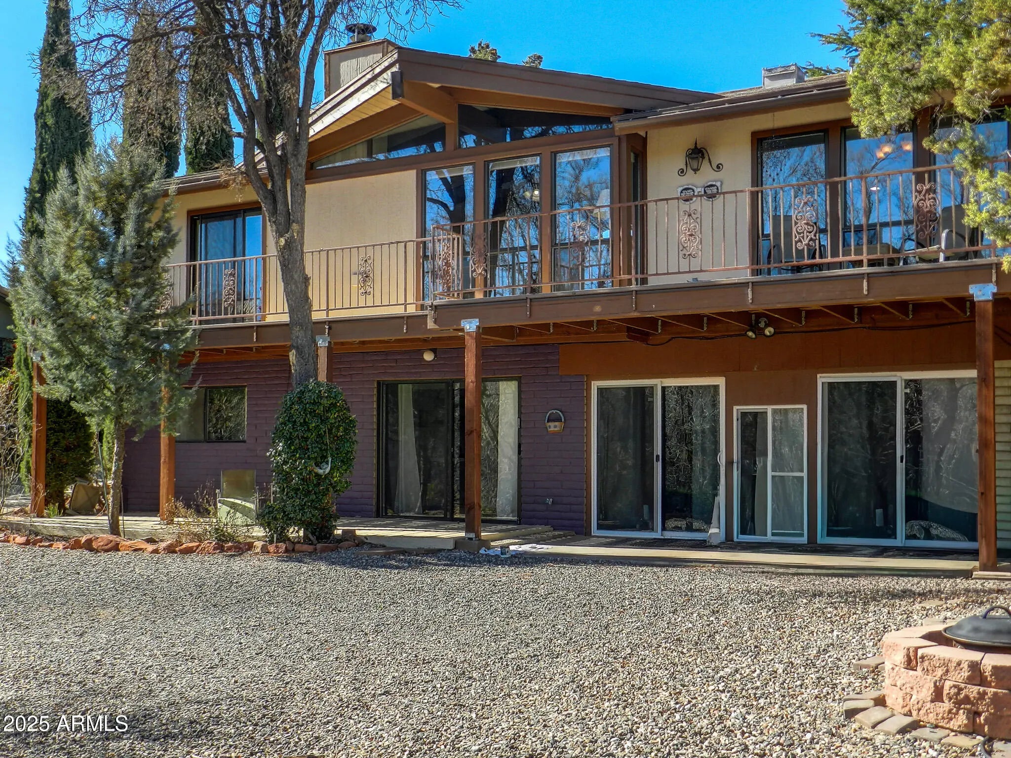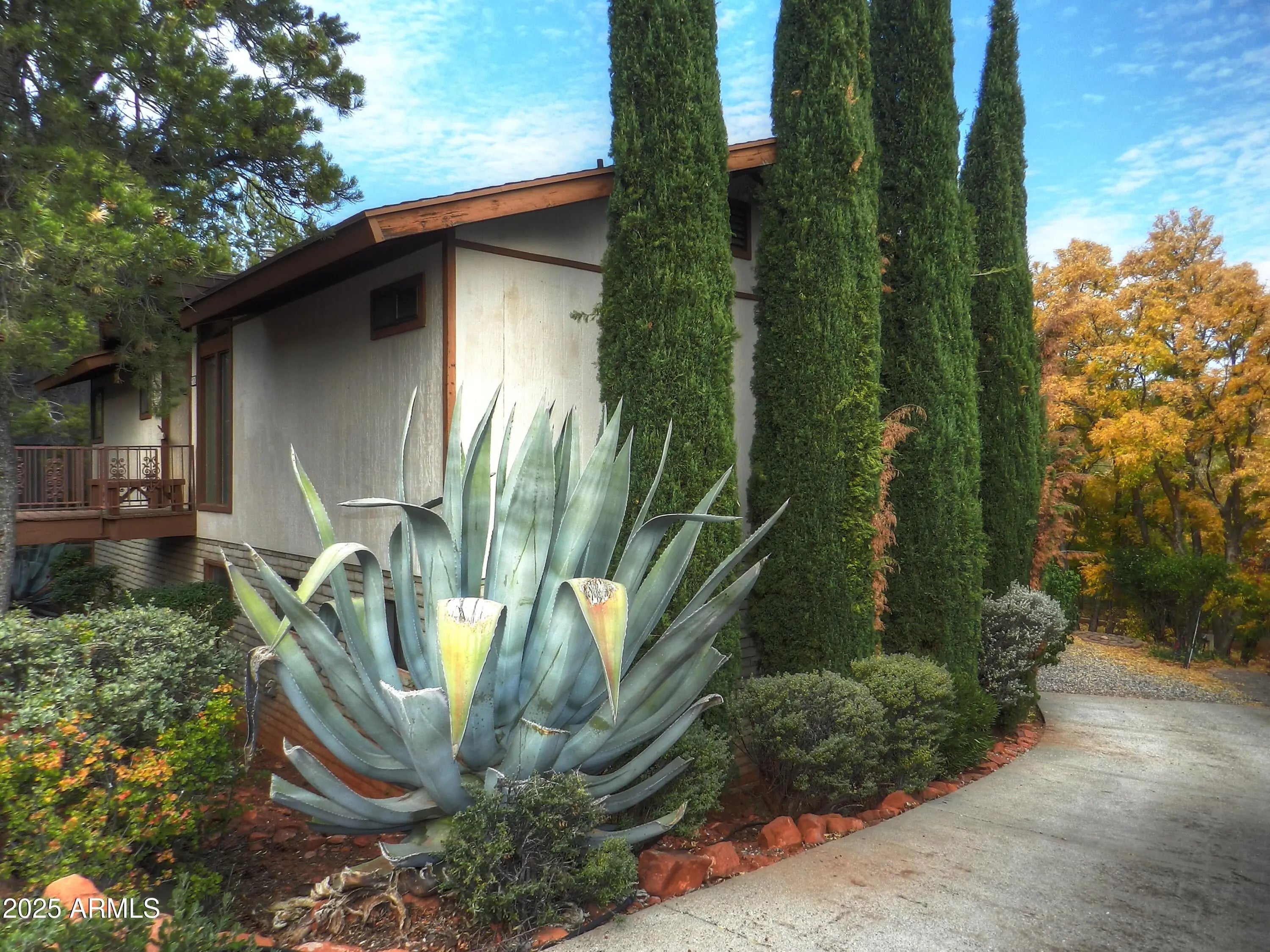 Tree house charm! Bi level ranch is tucked into a very private, woodsy setting boasting an awesome agave grove! Great value for investors in popular Sedona West ! Main living is on one level and includes a spacious living room with wood beamed cathedral ceilings and a gas or wood burning fireplace, kitchen, 1/2 bath, a formal dining room opening to an expansive deck overlooking the private back yard. Spiral stairs lead from the entry to a lower level with 2 bedrooms each with separate sliders to the back yard and a shared 3/4 bath. The garage was converted to a large multi purpose bonus room with wood floors and a separate entrance (NOT INCLUDED IN THE SQ. FOOTAGE). New owners can reconvert it to a garage, if desired. There is ample off street parking in the rear of the home. Seller is licensed to sell real estate in AZ