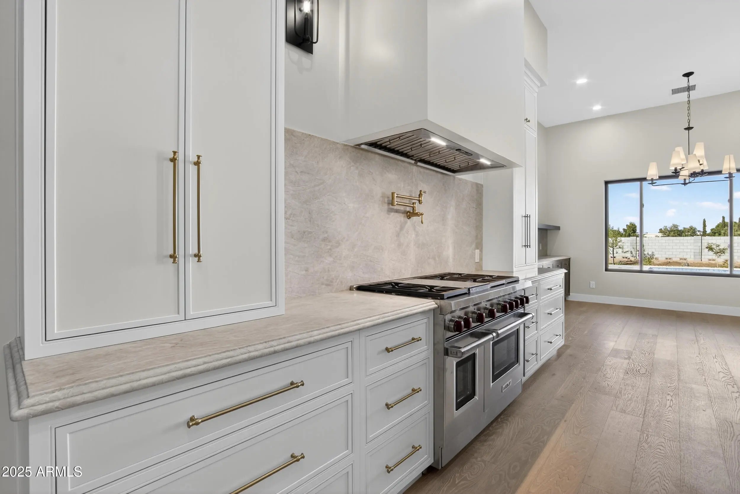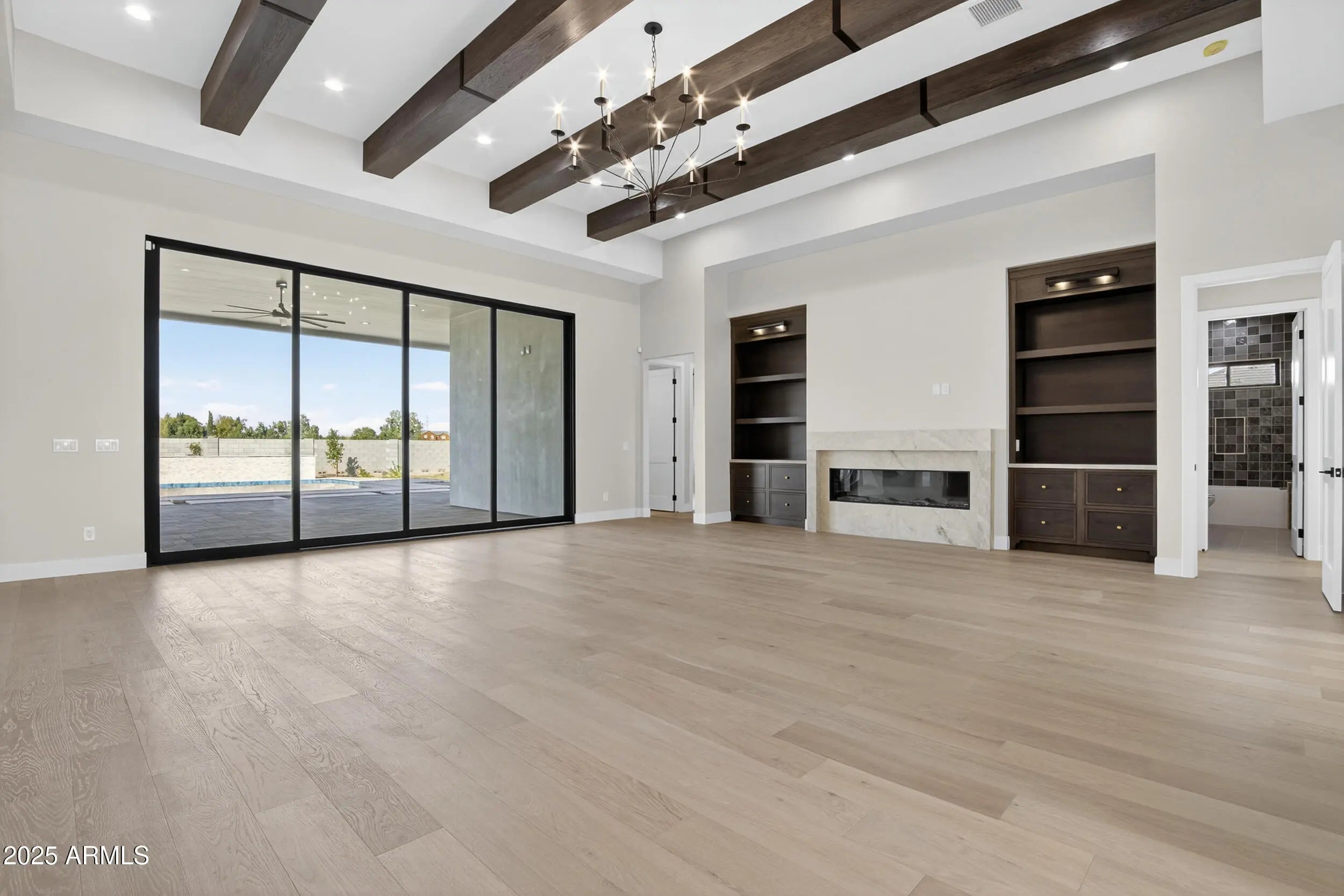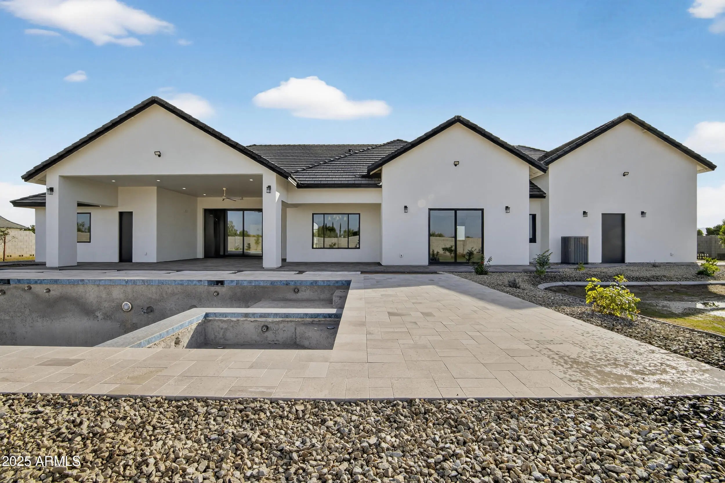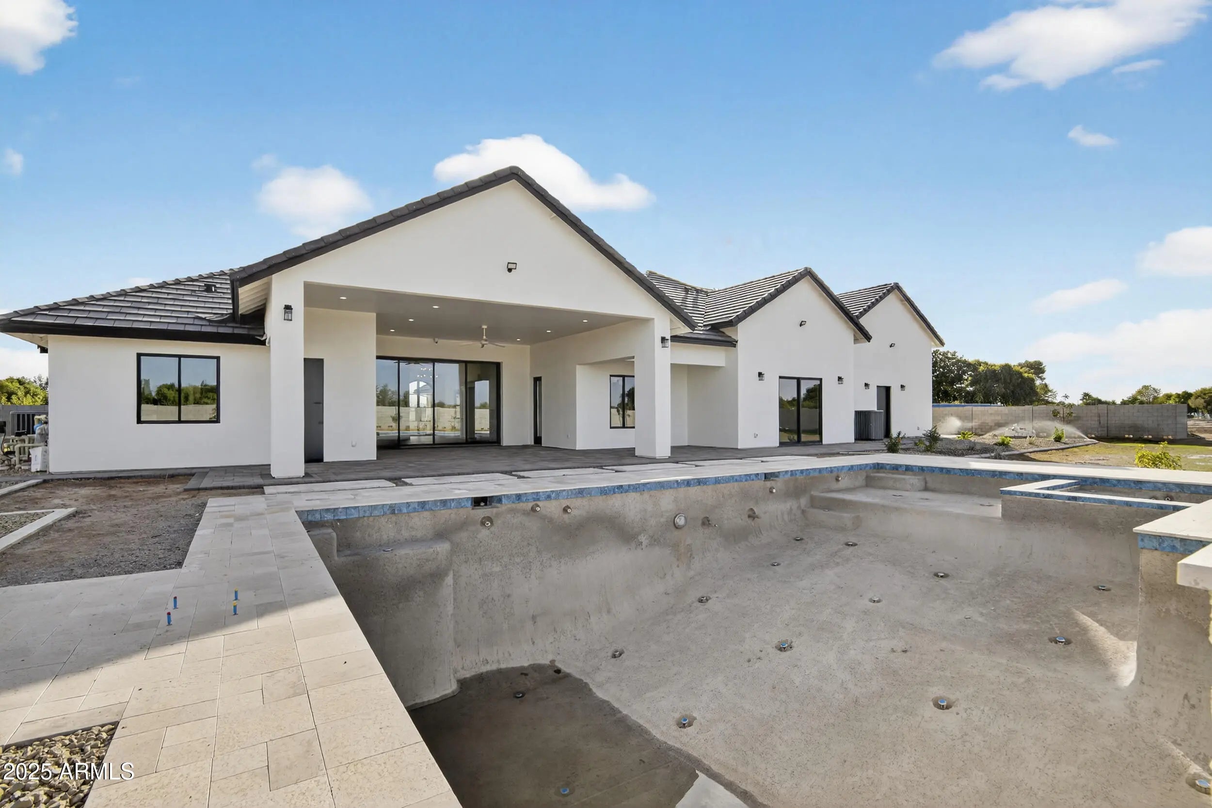 Welcome to this brand-new home in New Cloud Creek, featuring an oversized RV garage, private casita, 14' ceilings, and premium upgrades. Enjoy 5 bedrooms and 3.5 baths, an open layout, and a gourmet kitchen with quartzite counters, a large island, custom cabinets with gold accents, and a Wolf gas range. The spacious main bedroom includes room for a sitting area and sliders to the patio and pool. The main bath offers dual sinks, a walk-in shower, and a soaking tub. Additional highlights include an office/den, home theater, pool, hot tub, and the impressive RV garage.