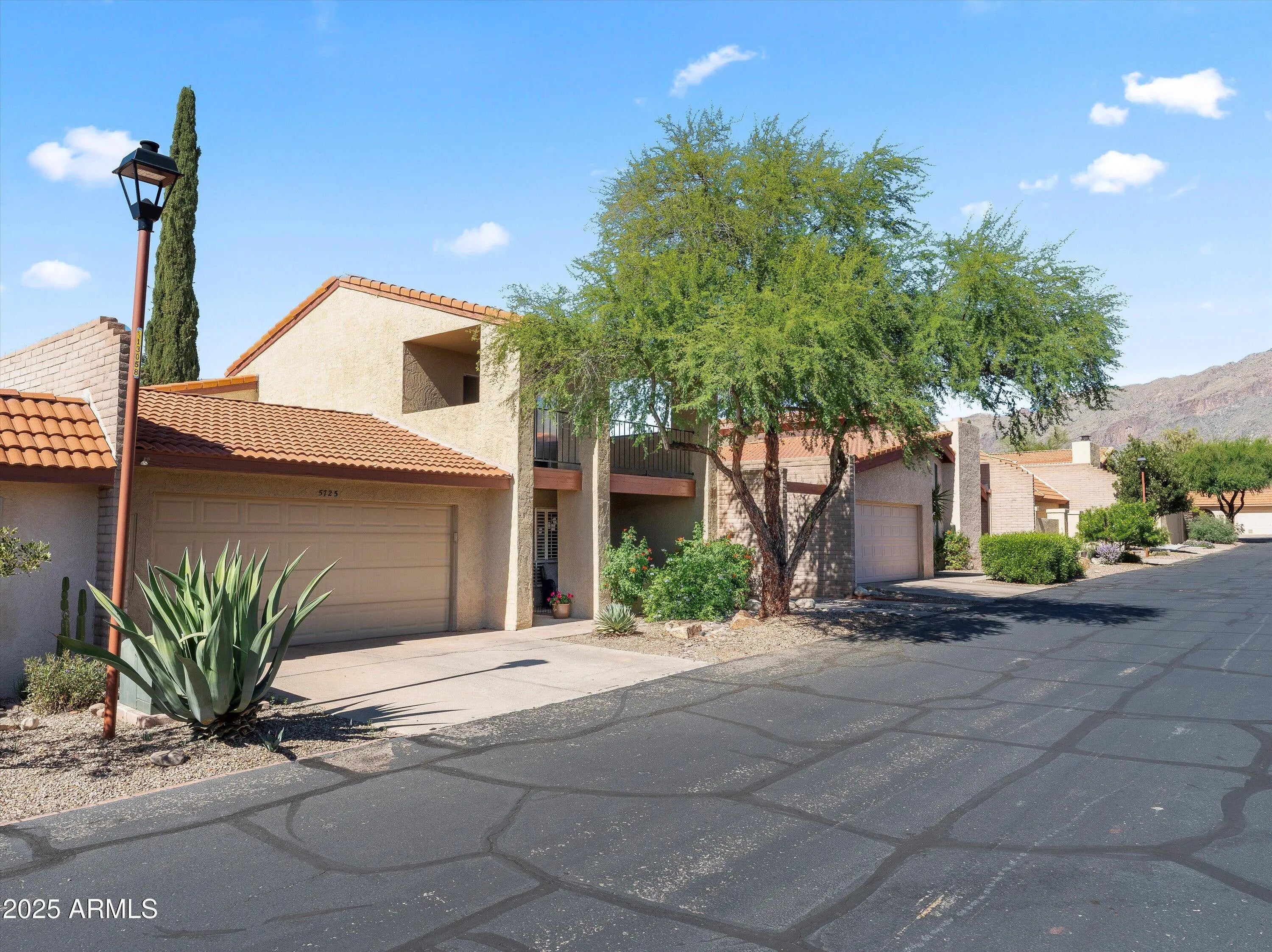 Amazing mountain & sunset views from the only active listing in this prime District 16 subdivision! Fantastic lot, buffered on the N side by common area. Walk to shopping .... you won't find a better spot in the Foothills. 2 spacious BRs downstairs and 1 large BR upstairs. Rare 3rd full bathroom. Enjoy your morning coffee and mountain views from your private covered balcony or from the lovely backyard. Relax in front of a wood burning fire on those cooler desert nights. Enjoy large closets, extra storage. New HVAC unit, W/D/frig included. Located just up the street from incredible community resort-style amenities including multiple pools/spa, tennis/pickleball courts, basketball court, exercise facility, and even a playground, all included!