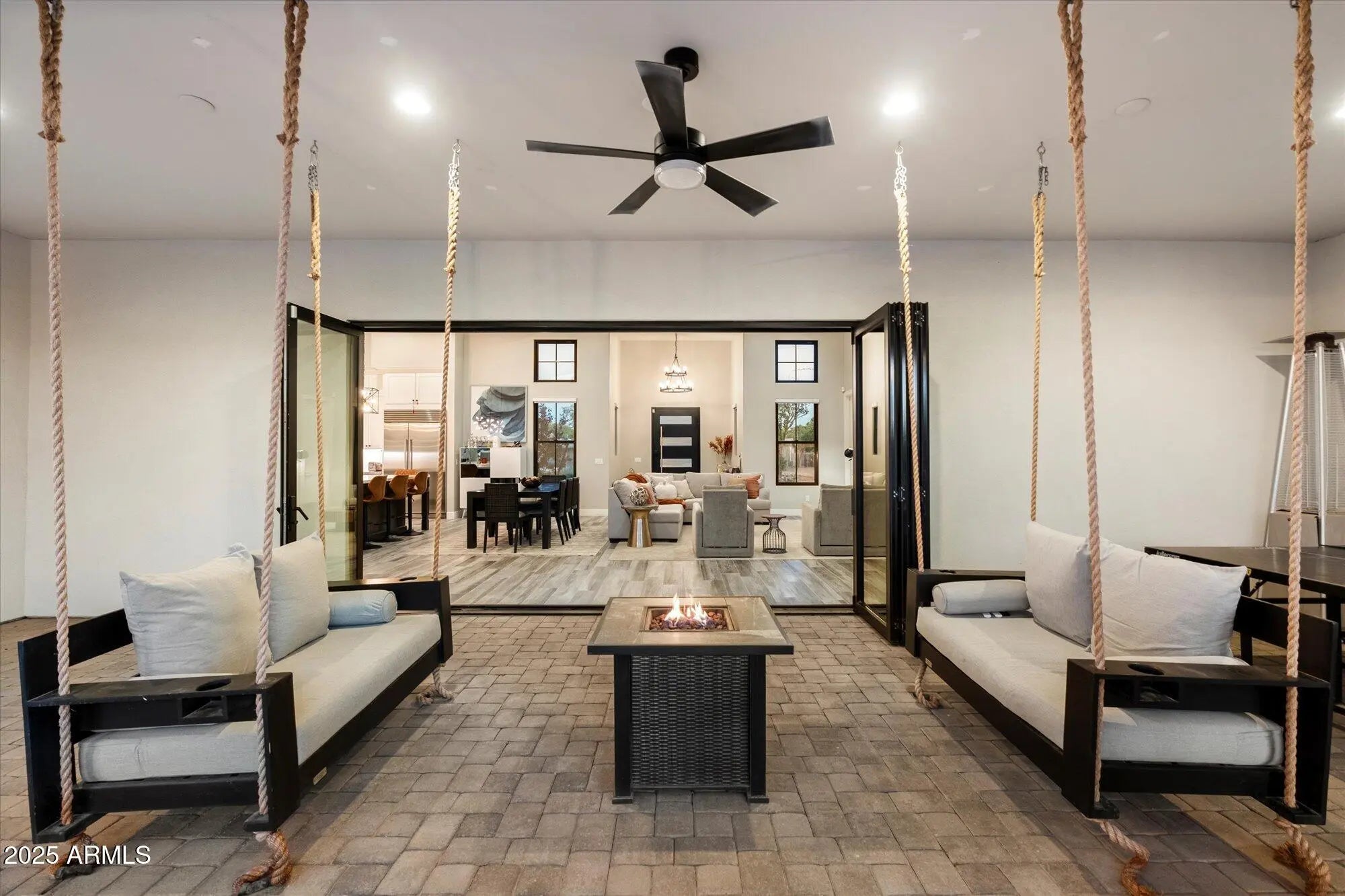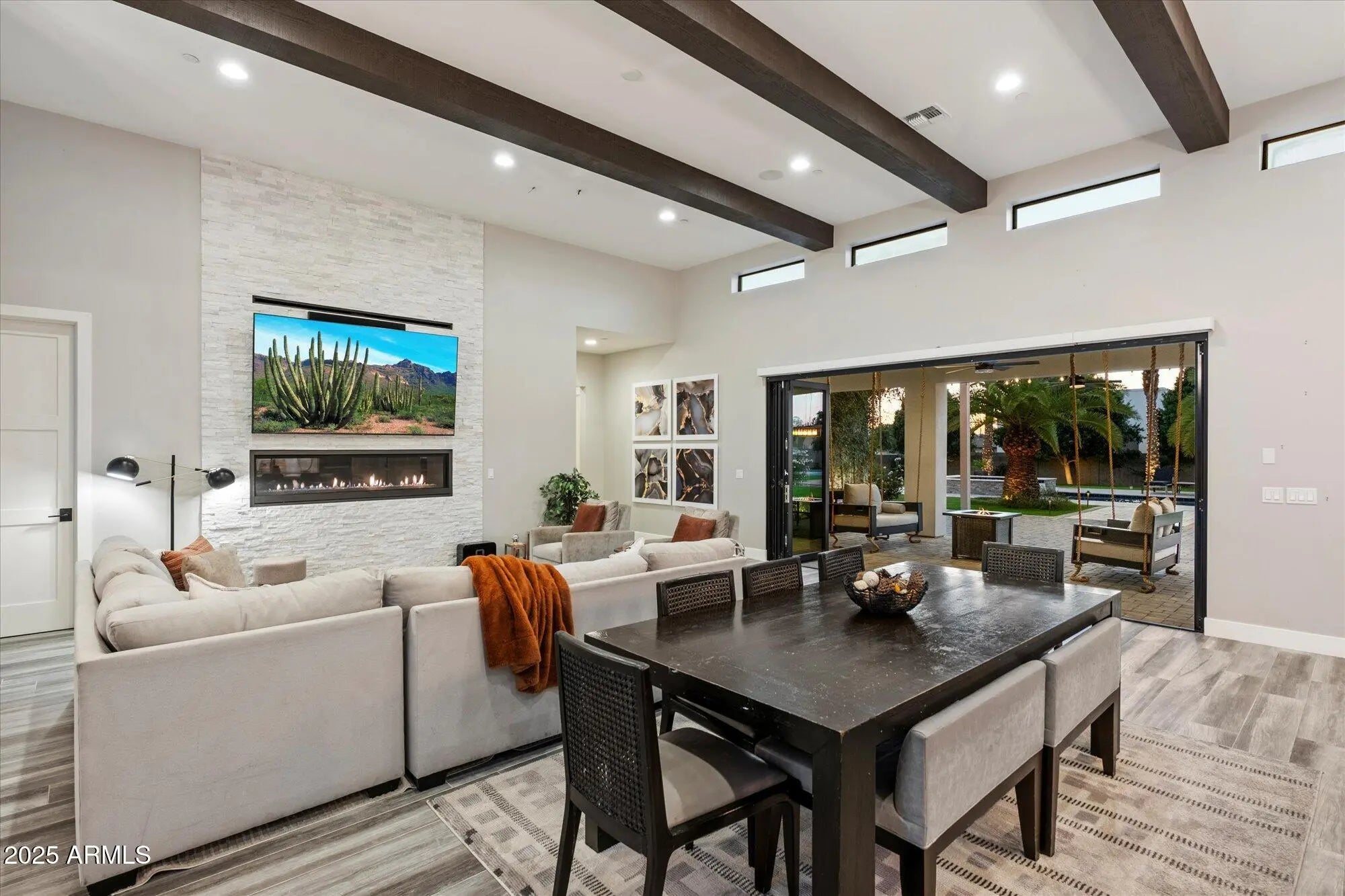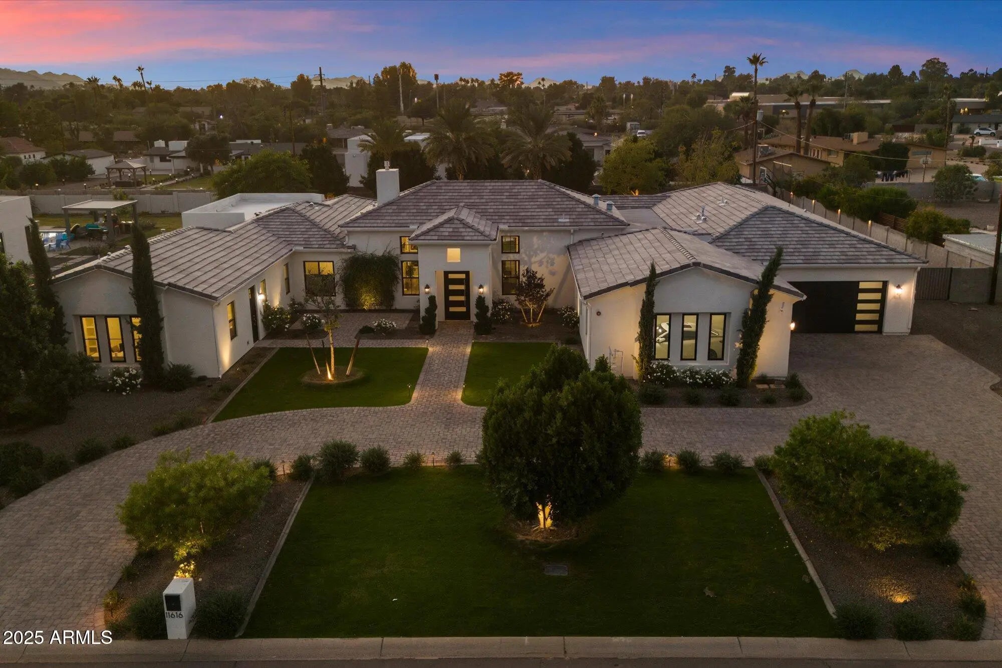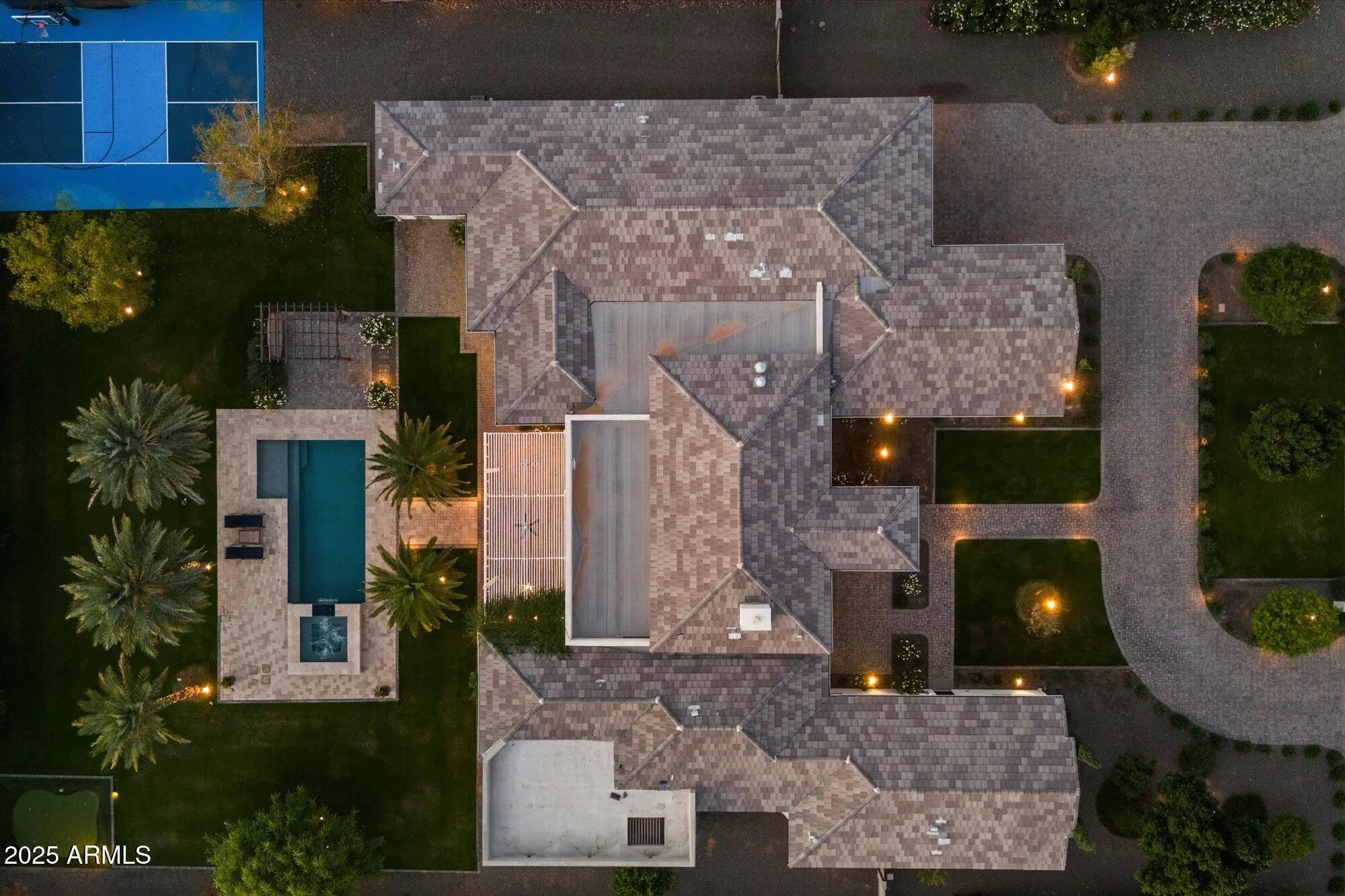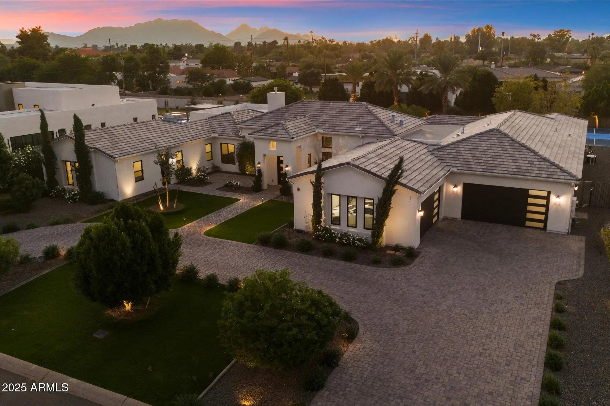 Modern, refined, and thoughtfully designed, this 5,715-square-foot luxury residence blends clean architectural lines with warm contemporary finishes throughout. Positioned on a generous lot in one of Scottsdale's most desirable areas, the home welcomes you with a dramatic entry, soaring ceilings, and seamless indoor-outdoor living. Approached by a grand circular driveway, the property offers impressive curb appeal and convenient guest parking. The main home features 5 spacious bedrooms and 5.5 bathrooms, each styled with designer fixtures, custom tilework, and spa-like touches. The open-concept great room centers around a striking linear fireplace and a full wall of sliding accordian glass that opens to the resort-style backyard. The chef's kitchen is showcased by sleek cabinetry, premium appliances, a large island, and an elegant dining space ideal for entertaining. The primary suite offers a true retreat with a luxurious modern bathroom, oversized walk-in shower, freestanding tub, dual vanities, and a custom boutique-style closet. A standout feature of the property is the separate guest casita, complete with its own full kitchen, family room, private bedroom, and bathroomperfect for extended-stay guests, multigenerational living, or a private workspace. Designed for year-round enjoyment, the backyard features a sparkling pool, spa, multiple covered patios, and lush landscaping. Additional amenities include a sport court and a putting green, creating a complete outdoor experience for recreation, relaxation, and entertaining. An oversized 5-car garage provides exceptional space for car enthusiasts, storage, or a home workshop. This home delivers the perfect balance of modern luxury, comfort, and functionalityideal for both everyday living and upscale entertaining.