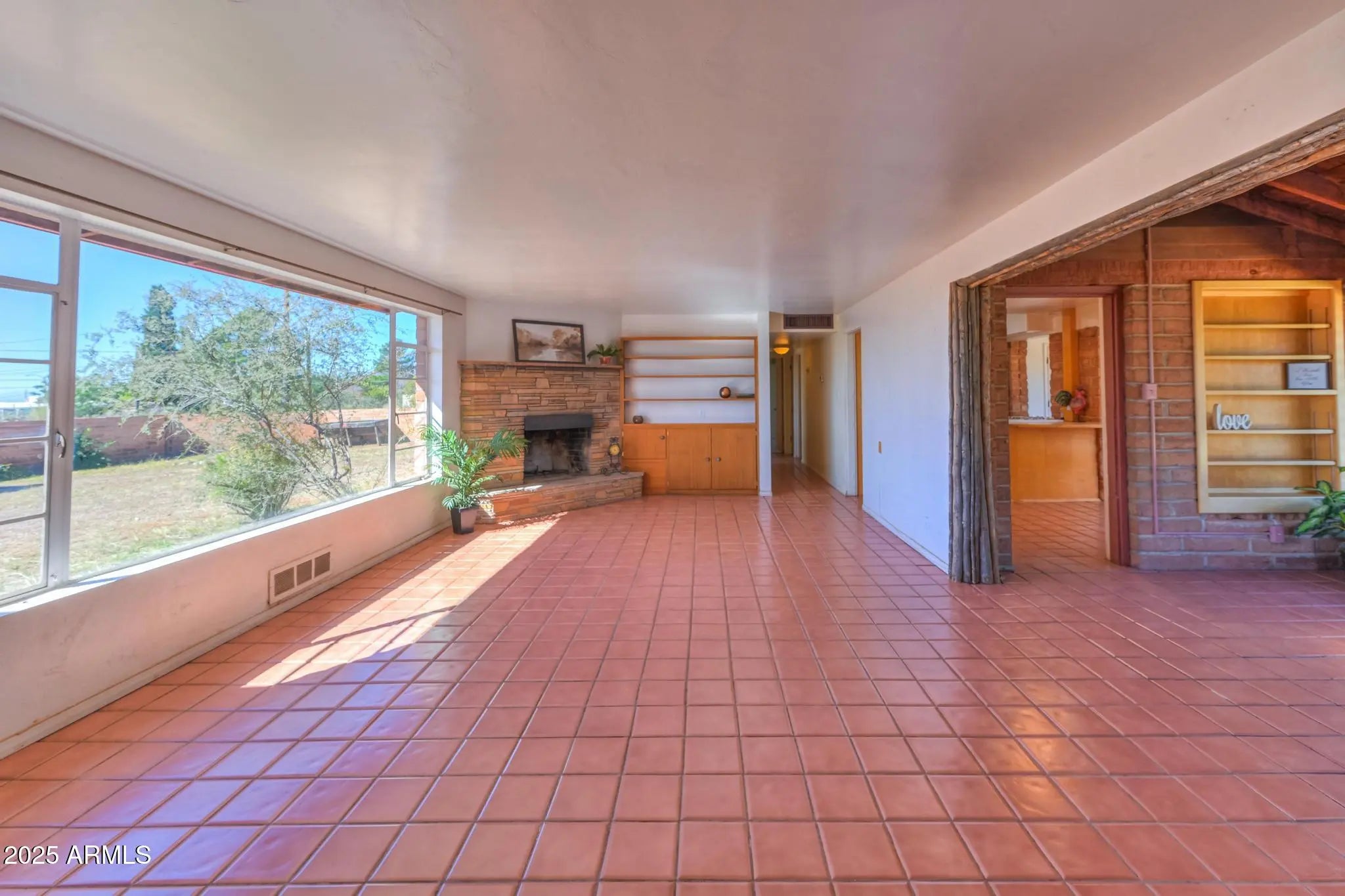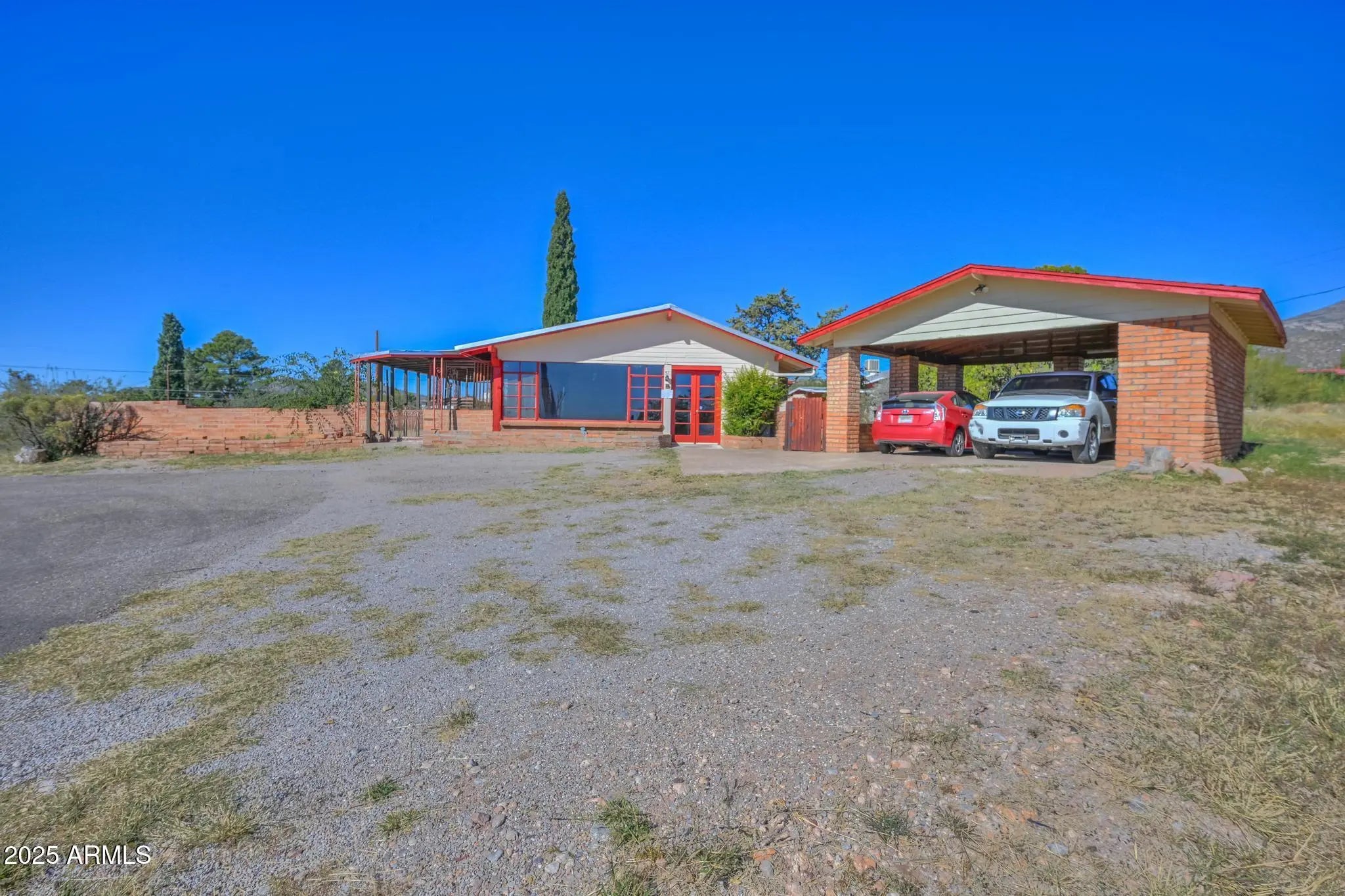 Discover endless potential in this charming San Jose Estates property! The main home offers 2 bedrooms and 2 baths with a circular drive and two-car carport. The front courtyard boasts a large outdoor space and two entry points. The front living space has a wonderful brick fireplace with built-in wood cabinetry. An open, airy kitchen overlooking the backyard and mountain views. Enjoy a formal dining space with more built-in shelving, and a spacious enclosed Arizona room, complete with wood stove. The primary bedroom has private bath access. Guest bath has a walk-in shower. The adorable detached casita adds 1 bedroom, 1 bath, and fantastic income/guest potential. Block wall fencing, covered front patio, built-in BBQ and more, complete this inviting estate, ready for your personal touch!