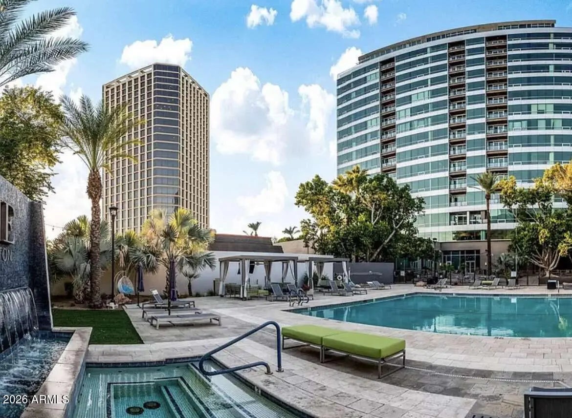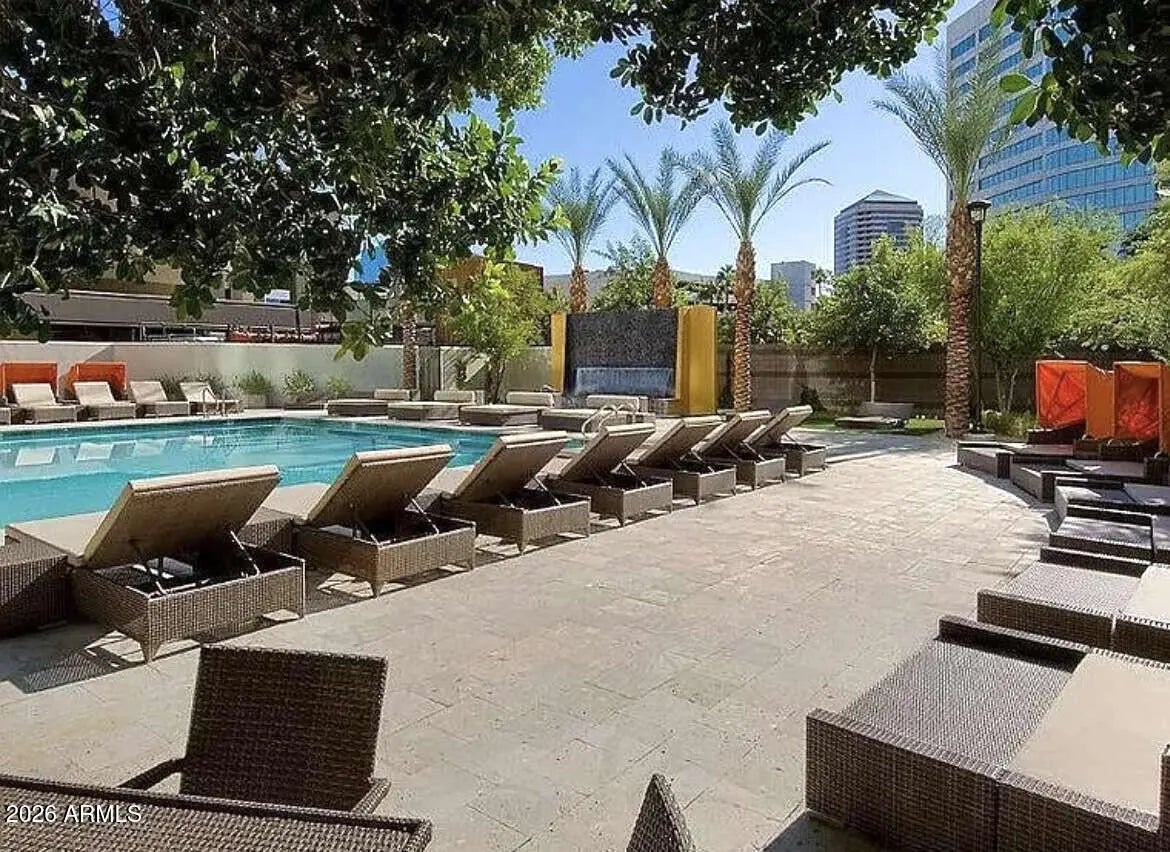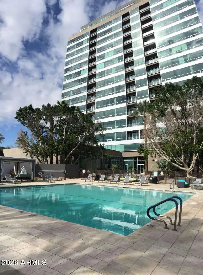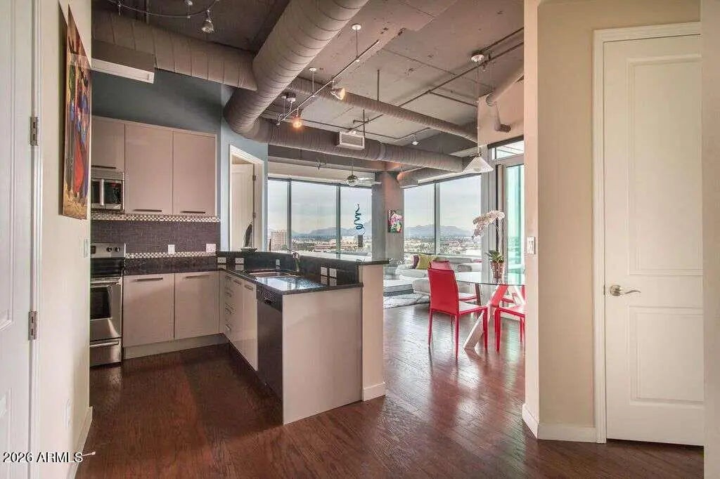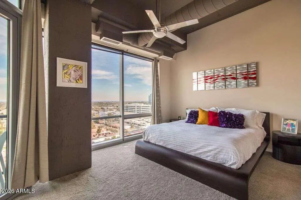 Views, views, views! Premium Northeast Corner high-rise residence! Spectacular view condo with amazing 270 degree views of the city, Camelback Mtn and Piestewa Peak! If you've been searching for a home or 2nd home that combines modern elegance, great location, and effortless lock-and-leave convenience, look no further. Sleek interior features, hardwood floors, granite counters, high end Stainless Steel Bosch appliances and more. 11 ft plus concrete loft style ceilings with exposed duct work, split floor plan, walk in master closet, inside unit Washer and Dryer and floor to ceiling windows with solar shades all the way around. Rarely available Northeast corner exposure, best views with minimum direct sun. Hip, sophisticated community conveniently located only steps from Light Rail station. All the amenities you would expect in an upscale high-rise community--Concierge, full security, garage parking with 2 side by side spaces, EV charging, huge gym, resort like heated Saltwater Pool, Spa & Cabanas, BBQs and firepit. Private community dog walk. Walking distance to Creighton University, St. Joseph Medical Center. Ride the Light Rail to Suns, D'Backs, art museum, and Sky Harbor.