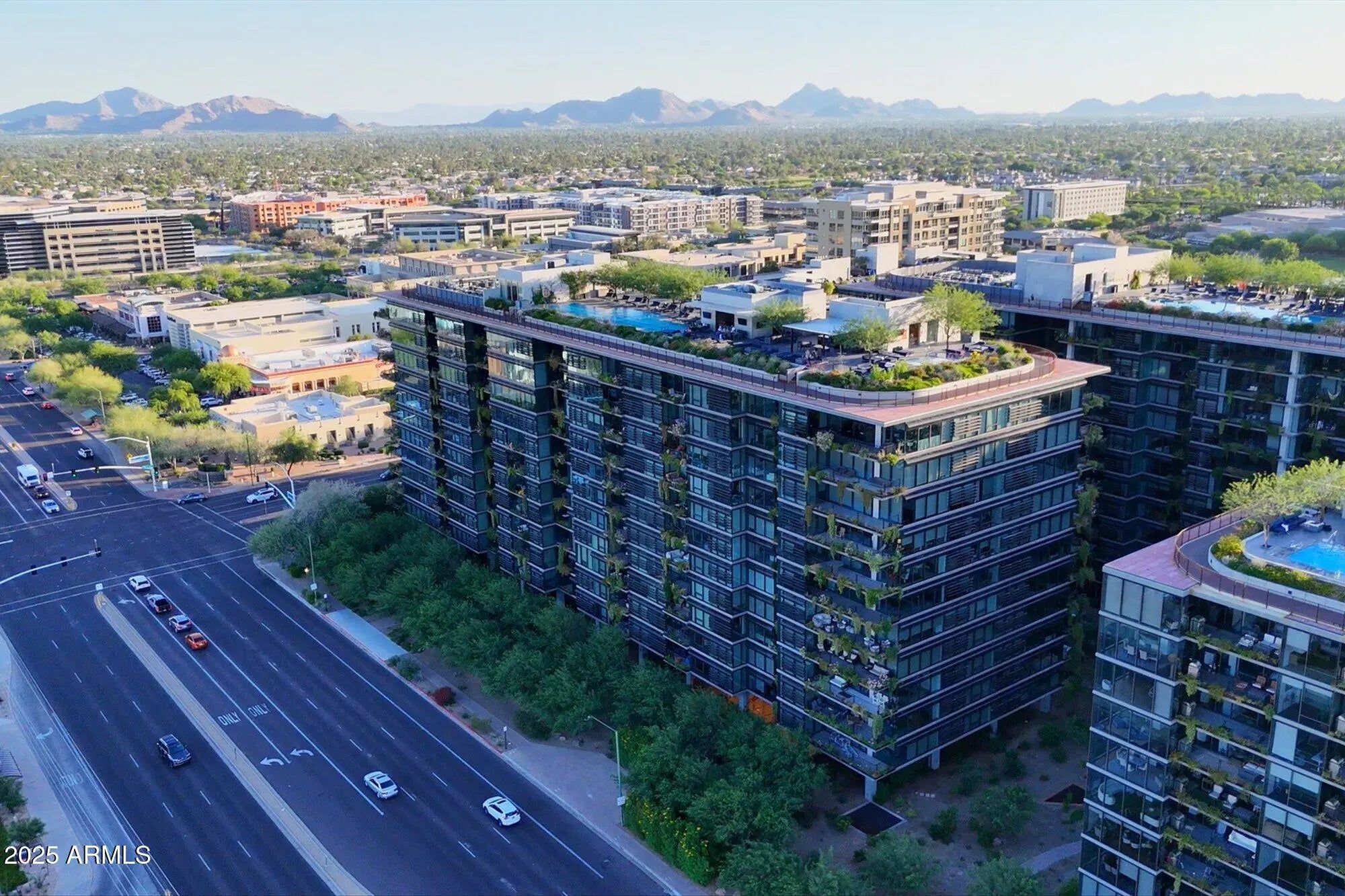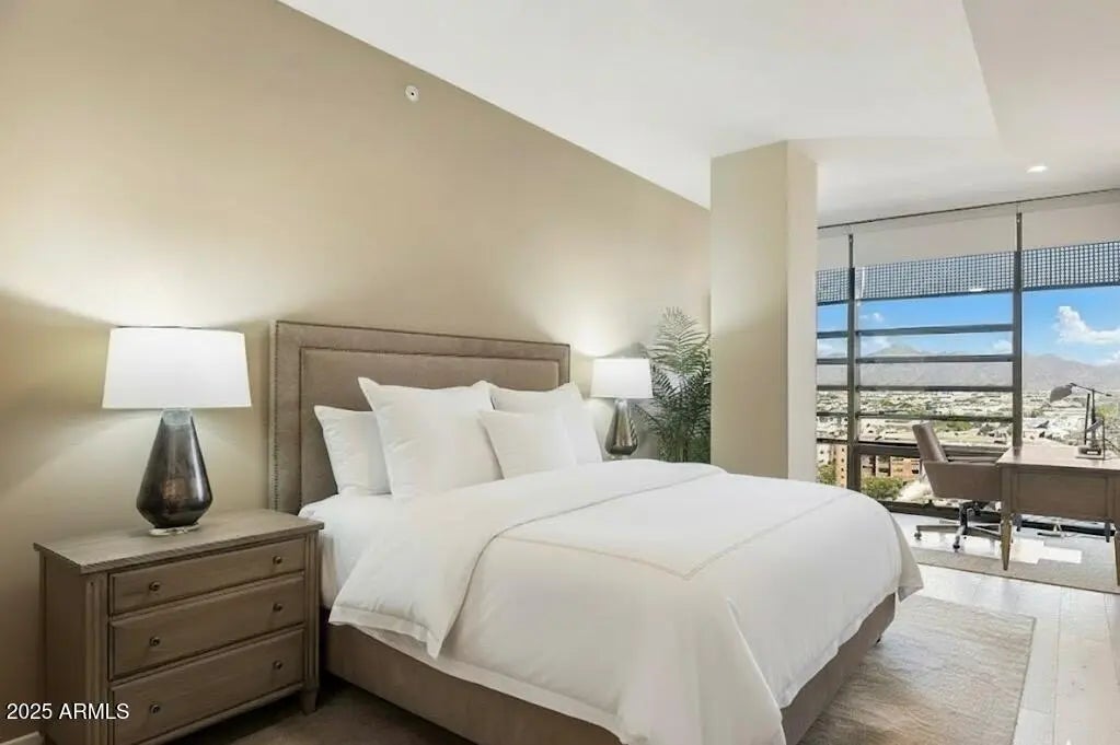 Step inside this beautiful 10th-floor penthouse at Optima Kierland where modern luxury meets elevated desert living. With 10ft ceilings and floor to ceiling windows, experience breathtaking, sweeping views of the McDowell Mountains. This thoughtfully designed and meticulously maintained home features a split layout with two full private suites and exquisite curated finishes throughout. The kitchen showcases quartz countertops, custom cabinetry for extra storage and high-end Bosch appliances. A hidden pocket door leads to the flexible second suite, ideal for guests or a home office. This unit contains additional sound barrier insulation in the ceilings and perimeter walls! Step onto the roof to enjoy resort-style amenities such as an infinity pool, cold plunge, steam room, sauna, and yoga studio with panoramic views. Inside you'll find an expansive fitness center, sports courts, a golf simulator and a private dog wash.Experience all that Scottsdale has to offer. Just steps away from Kierland Commons and the Scottsdale Quarter, with close proximity to year round events including the Barrett Jackson Car Auction and Waste Management Open as well as easy access to the airports, this is luxury living at its finest.