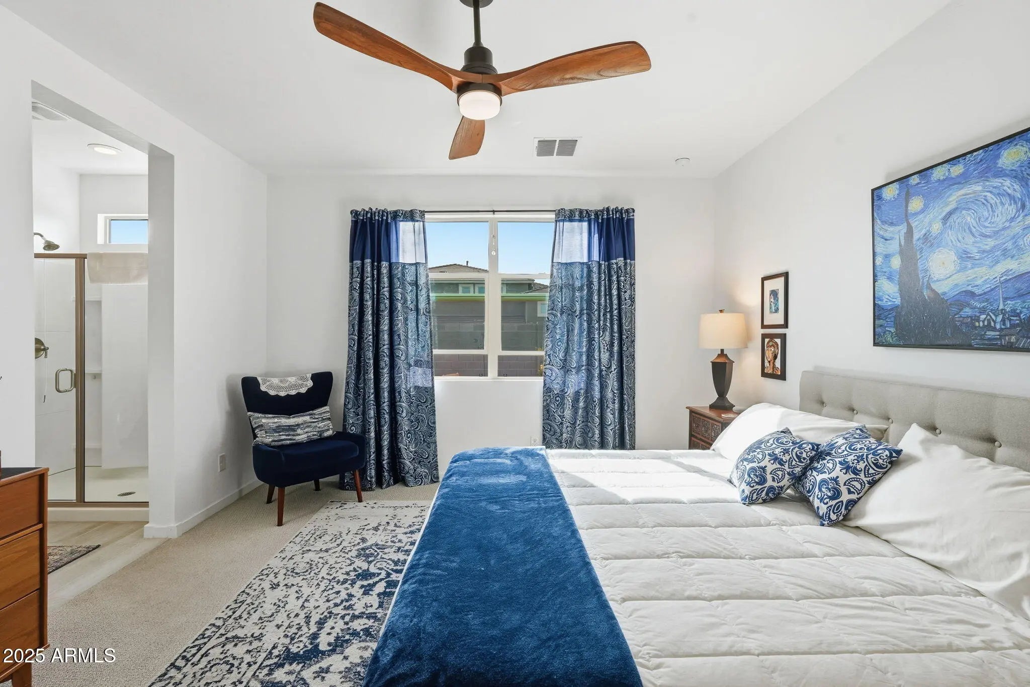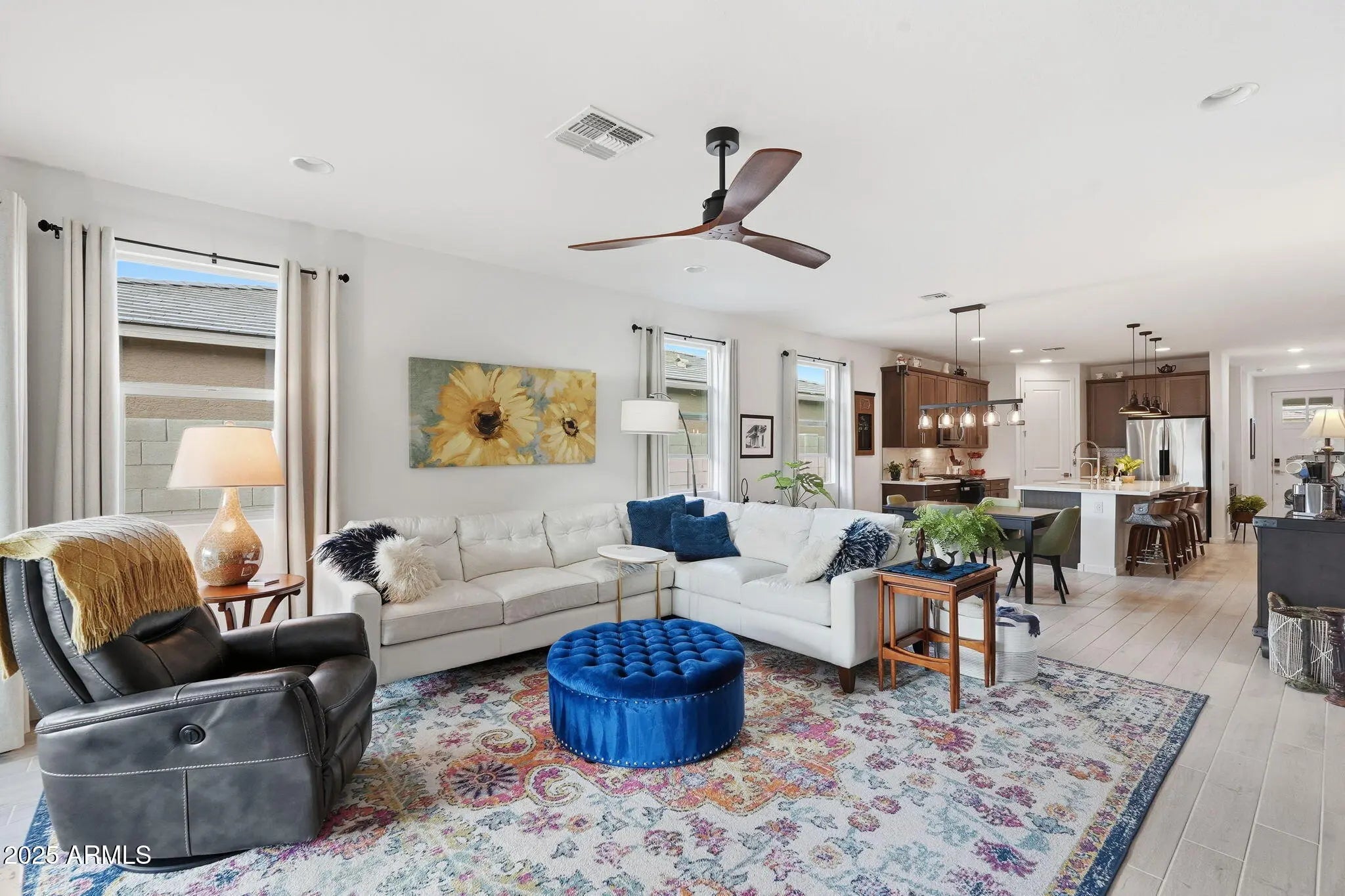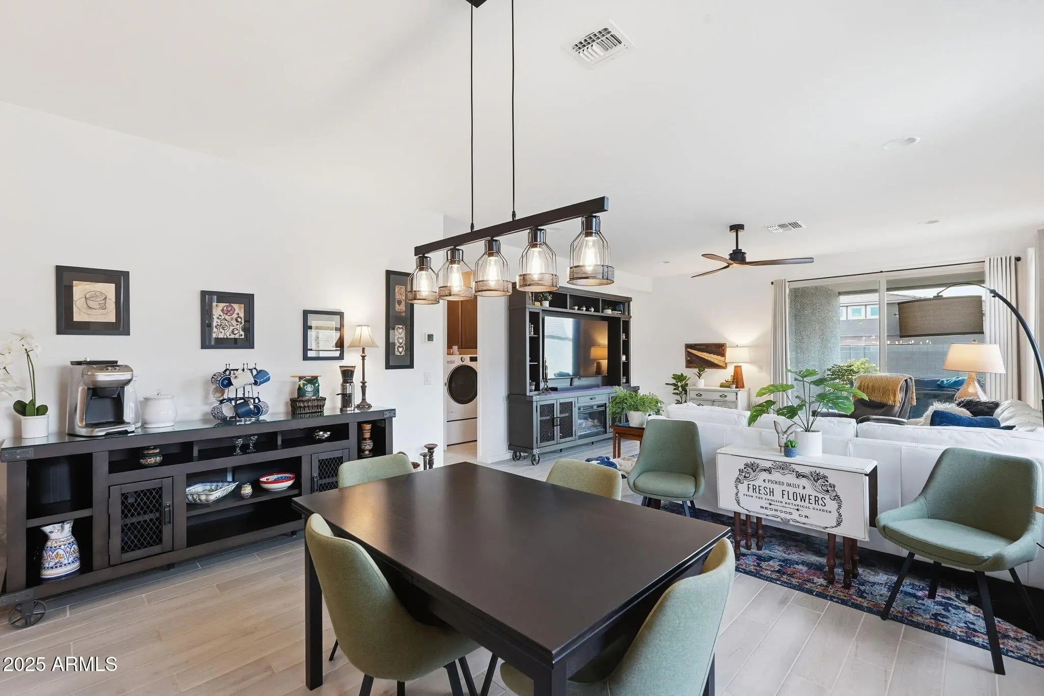 Charming Craftsman-style home with a welcoming front porch, just steps from the park. The spacious Jubilee floorplan offers 4 bedrooms, 3 full baths, and a versatile flex space—ideal for a home office, playroom, or teen retreat. Enjoy an open-concept layout and a north-facing backyard with established landscaping. Thoughtful upgrades include premium washer/dryer/fridge, laundry cabinets with sink, window treatments, upgraded lighting, and ceiling fans in every room. Energy-efficient and turn-key, this home offers easy access to Loop 303 and all the West Valley's growing amenities. Better than new and turn-key, this home will not disappoint.