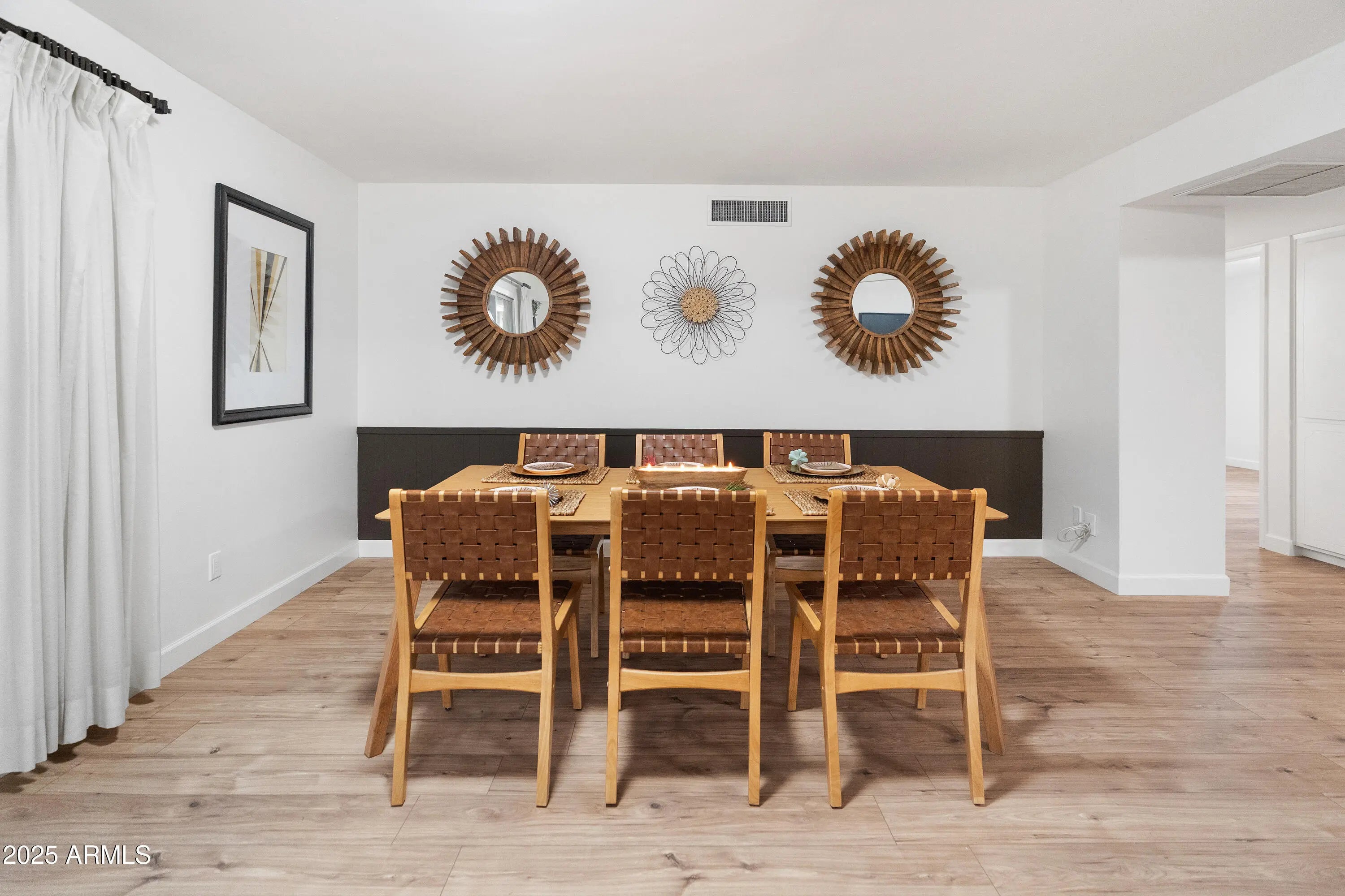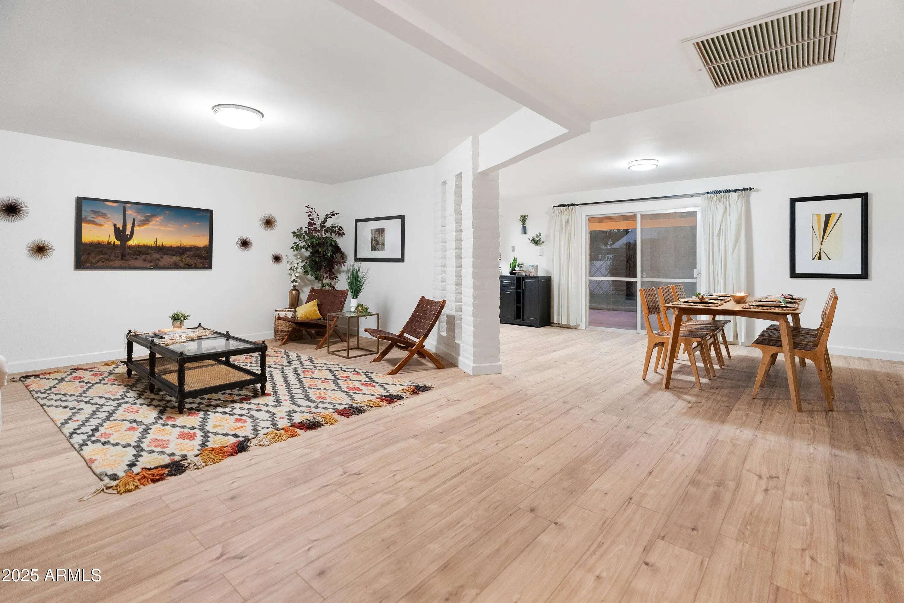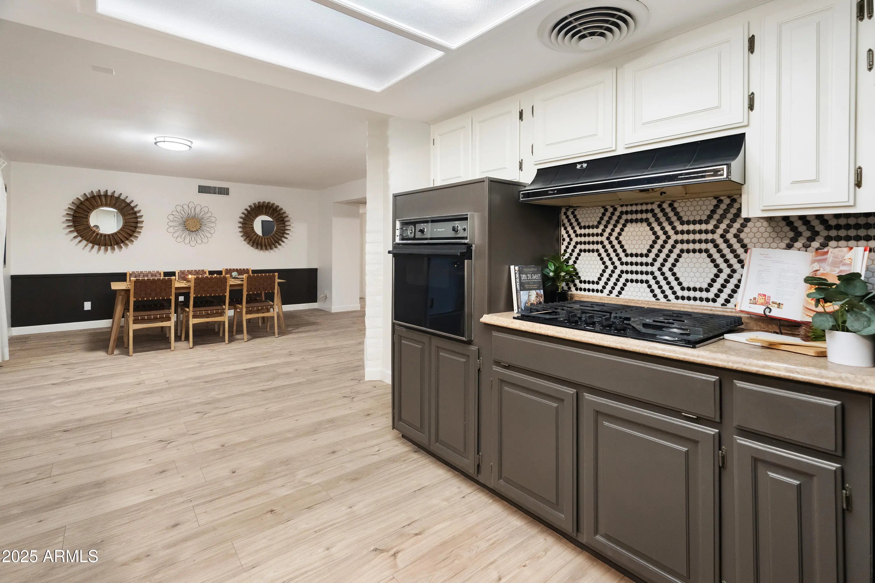 Tastefully updated 3 bedroom 2 bath home with no HOA. Open concept and versatile floor plan allows various options for use of space. All new flooring in a beautiful warm wood tone vinyl plank. Fresh paint, crisp baseboards and updated finishes throughout. Spacious kitchen has tons of cabinets and counter space PLUS a new midcentury modern backsplash in black and white mosaic tile. Spacious, grassy back yard with mature trees and oversized covered patio offer even more space for family and friends to gather. 2 car GARAGE plus a laundry room/ utility room approx 900 sf) that could also easily have a walk in pantry incorporated. Fruit trees: pomegranate & citrus Midcentury modern vibes preserved while undergoing a thoughtful remodel. Priced to sell fast! Motivated seller.