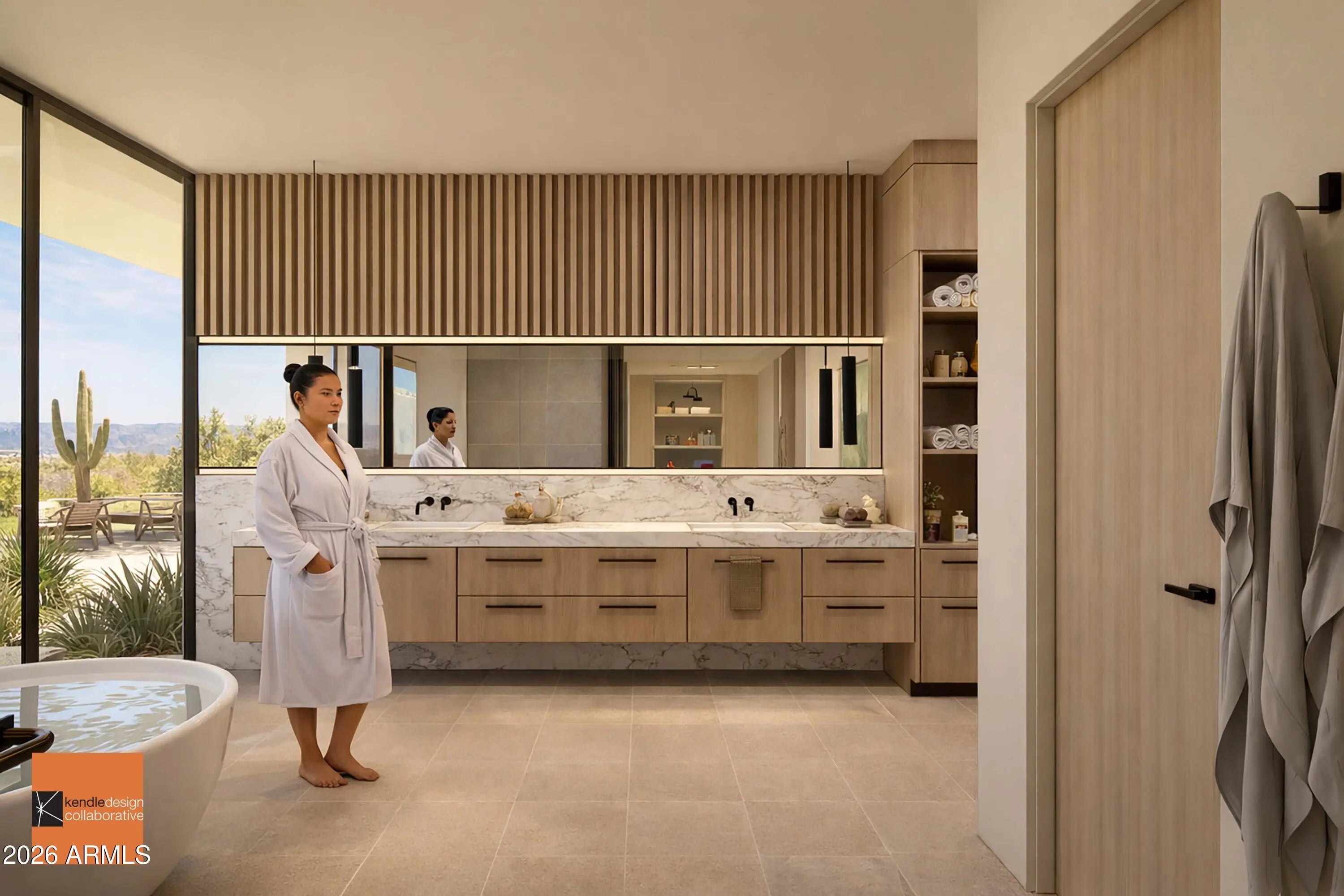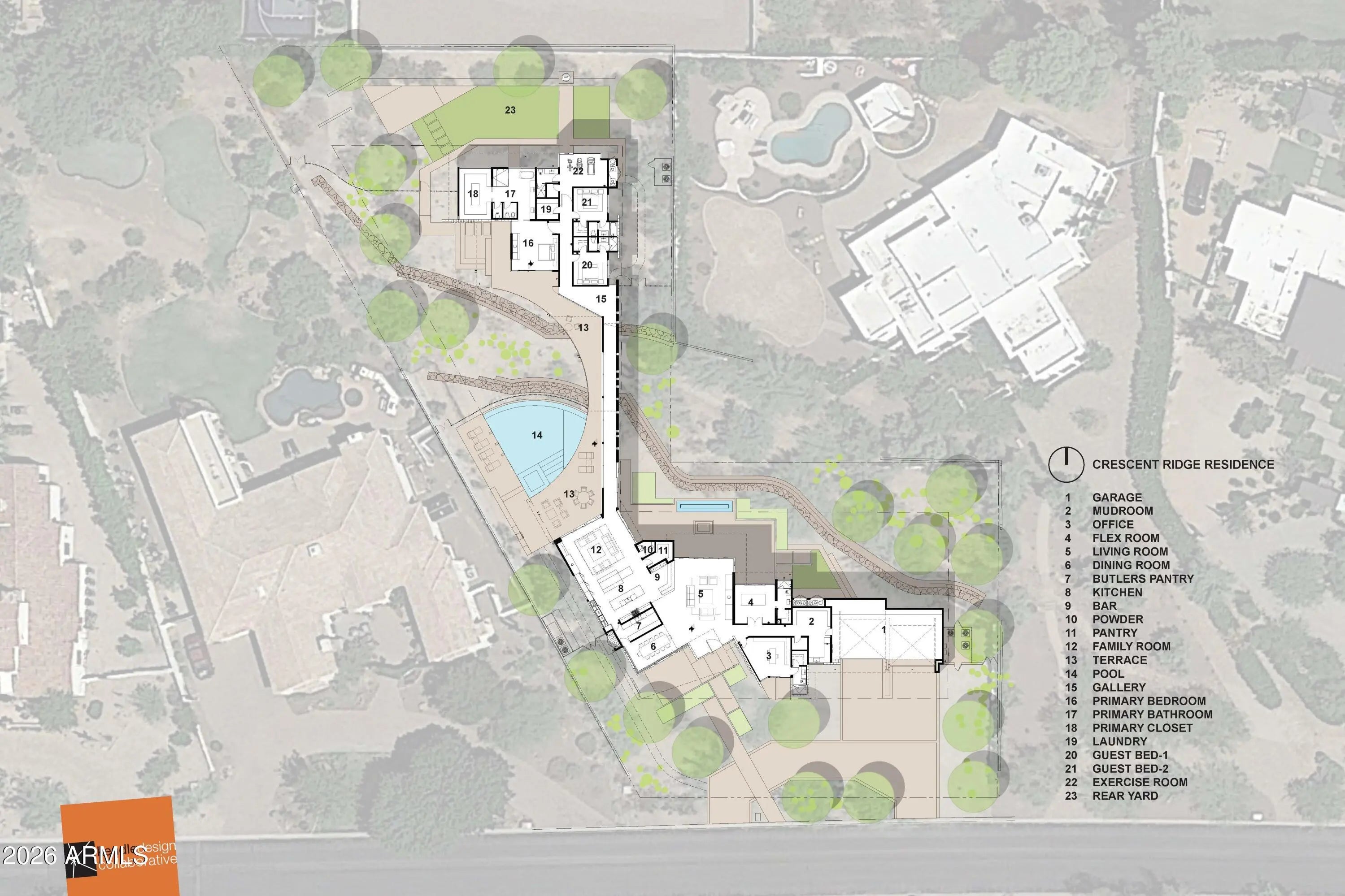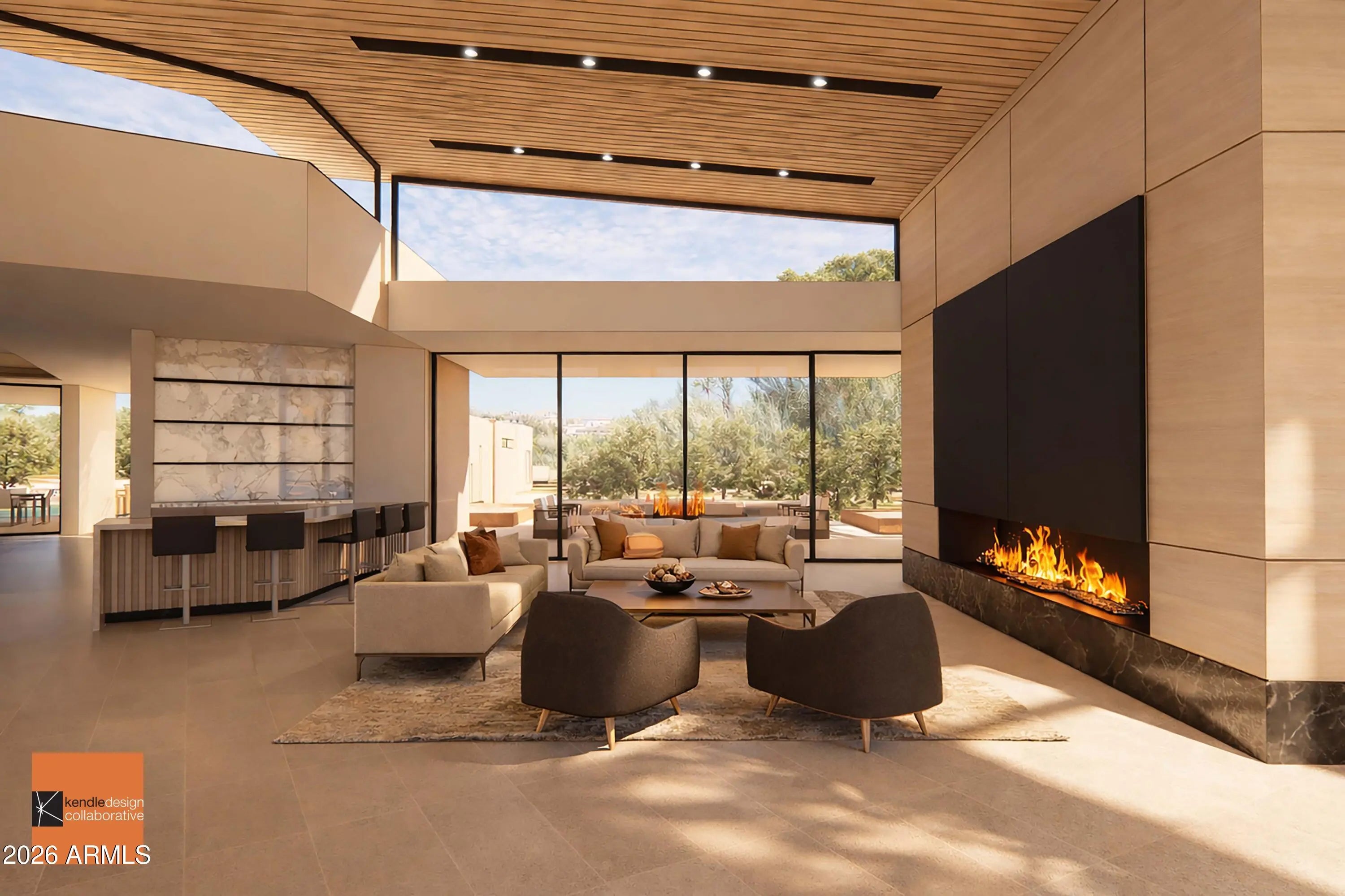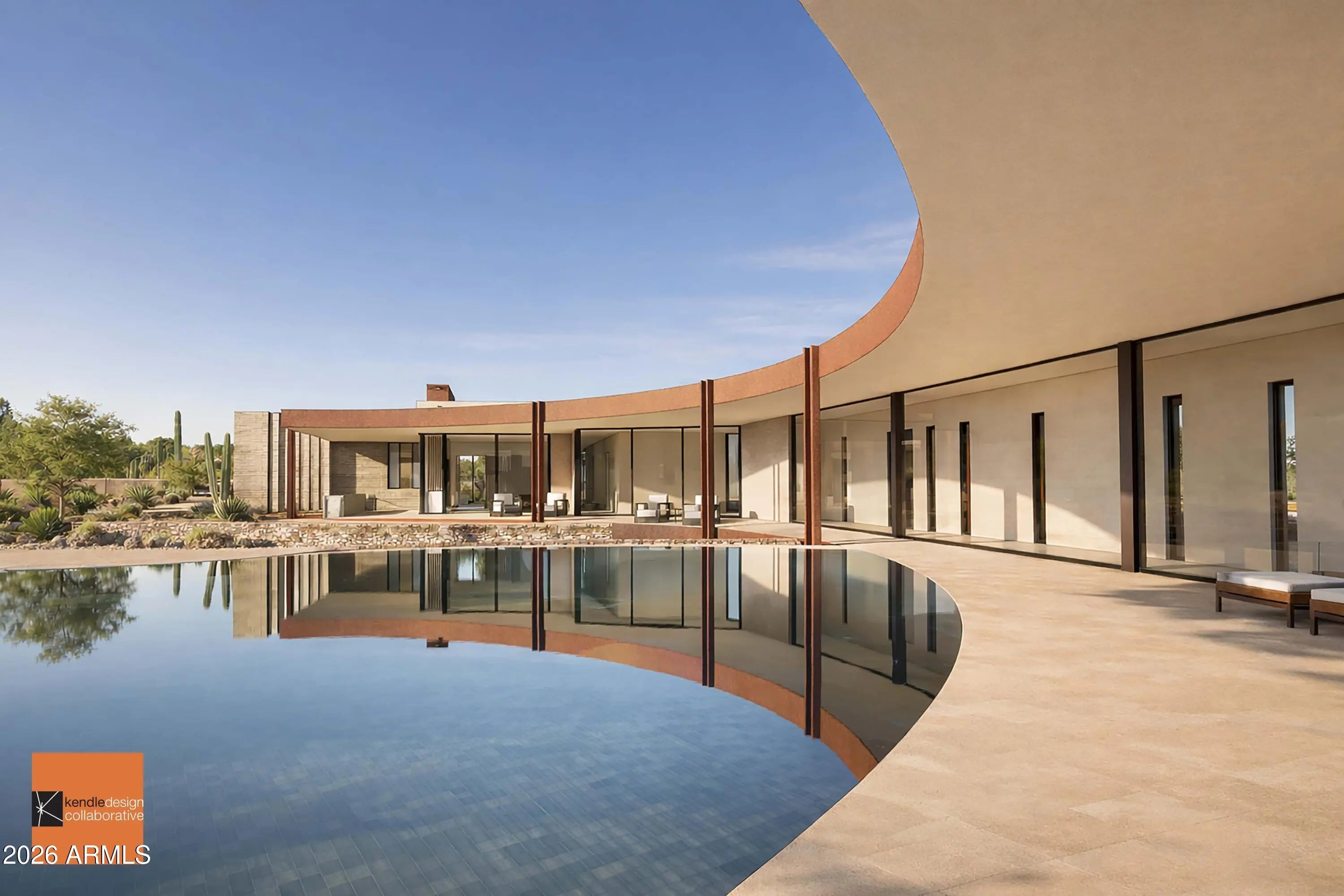 Designed by renown architect Brent Kendle this home is being constructed to harmonize with its natural surroundings, while making its own bold statement. Hummingbird Residence exploits the natural grandeur of the desert wash traversing the site, while walls of glass and soaring roof forms reach out to capture mountain views. Social, family and entertainment zones are separated from peaceful private bedroom zones via a dramatic curved indoor bridge spanning the desert wash. A curved wall of glass welcomes views of nature and the infinity-edge pool along one side of the bridge while a gallery wall boasting artfully placed slots of natural light adorns the opposite side.