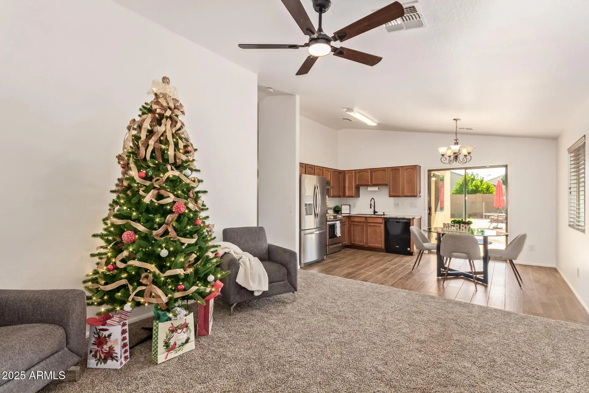 Welcome to Homestead North, where this charming single-level home awaits you! Offering 2 beds + den, 2 baths, 2-car garage, & a mature landscape. The inviting interior boasts abundant natural light, neutral palette, vaulted ceilings, and plush carpet & wood-look tile floors t/out. Designed for everyday living & entertaining, the seamlessly flowing open layout is sure to impress! The kitchen includes custom countertop, wood cabinetry, and appliances w/SS elec range & refrigerator. Sliding doors to the back! The cozy den can be an office or extra bedroom. The main bedroom has a walk-in closet & a private bathroom. If you want to relax or have a fun gathering, the large backyard is the ideal spot! A covered patio, lush lawns, well-laid pavers, & a fire pit complete the picture. Make it yours