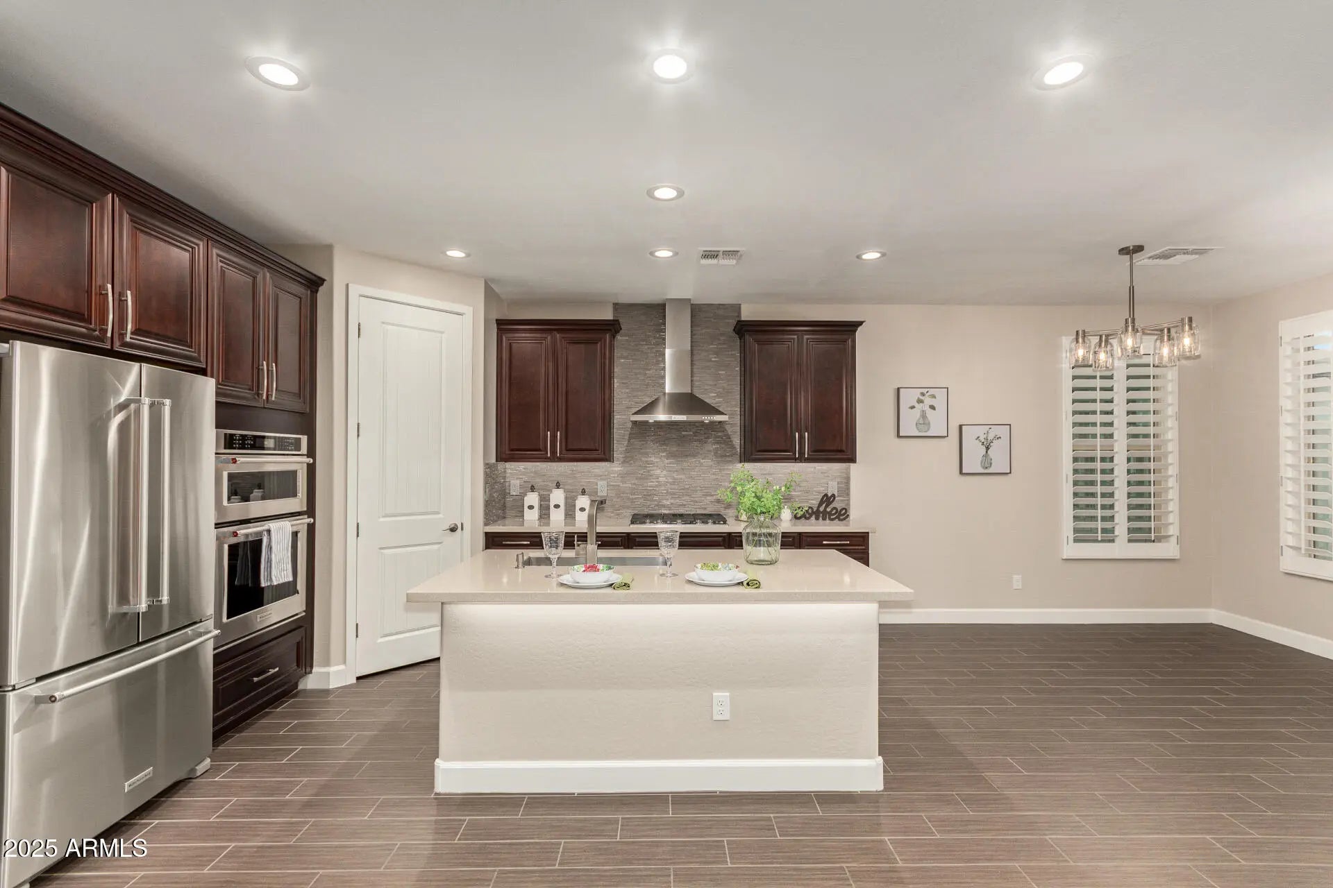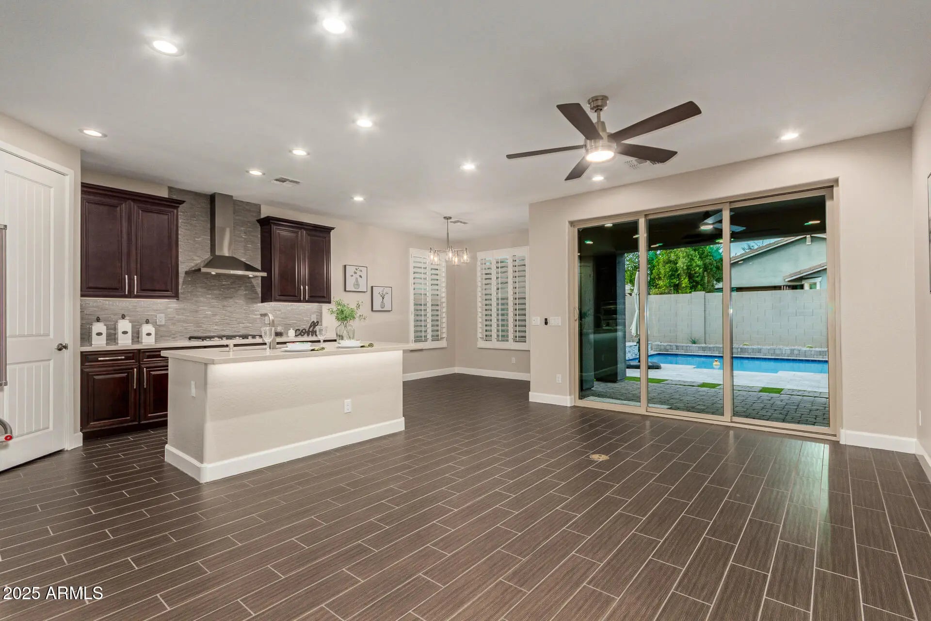 Move-in Ready! This 2 bedrooms + den home with a POOL sits in one of Gilbert's most sought-after communities. Thoughtfully upgraded with wood shutters, coffered ceilings, 8-ft doors, NEW interior/exterior paint, NEW carpet, and designer touches throughout. The GREAT ROOM FLOORPLAN features a chef-style kitchen with a center island/breakfast bar, professional grade appliances including a gas cooktop and a NEW refrigerator, 42'' upper cabinets, Quartz countertops, tile backsplash and a walk-in pantry. Enjoy indoor-outdoor living with a 3-panel slider leading to your private backyard retreat featuring a sparkling 2015-built pool, travertine pavers, and artificial turf. Morrison Ranch offers unmatched neighborhood charm with tree-lined streets, white picket fences, lakes & lush green spaces.
