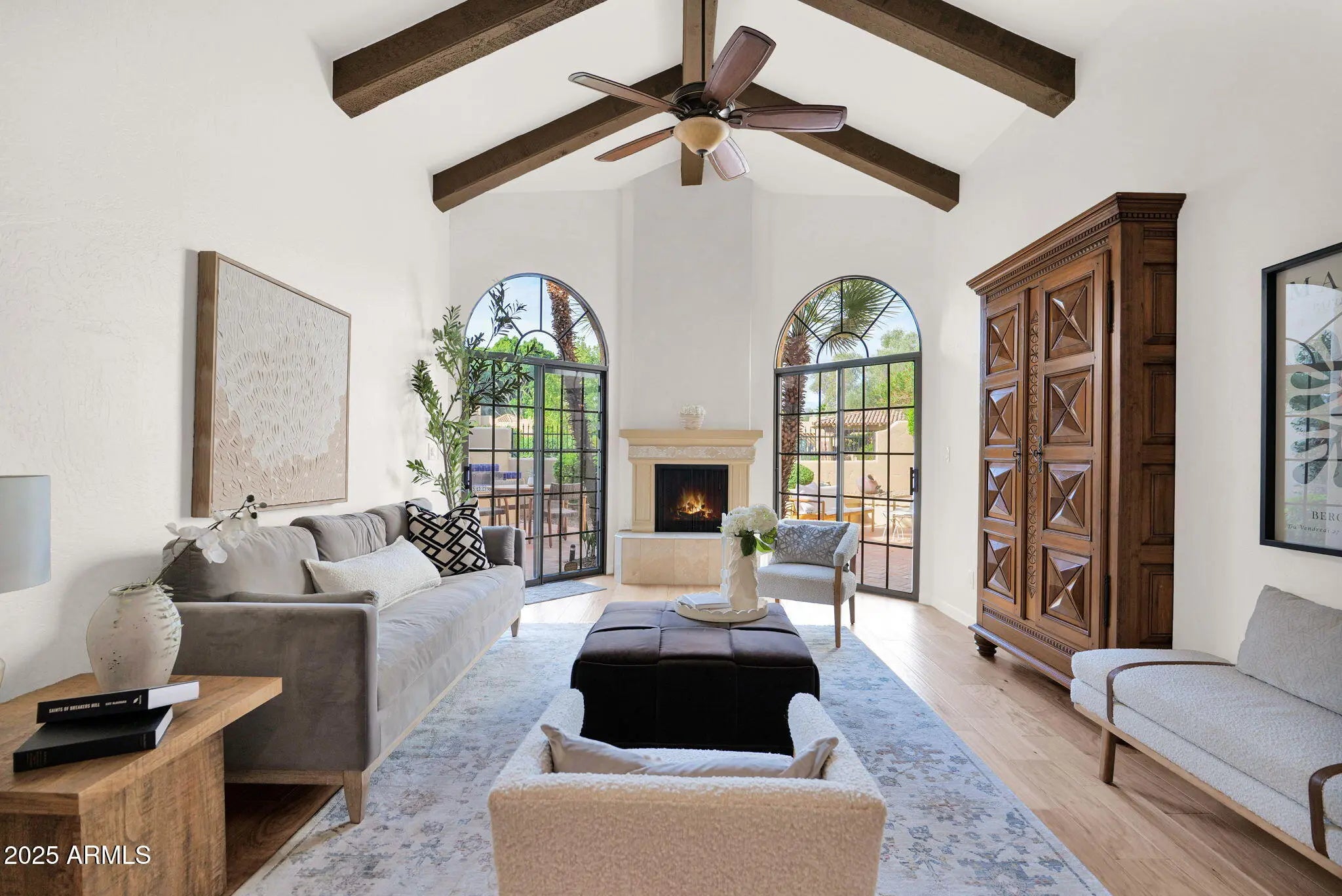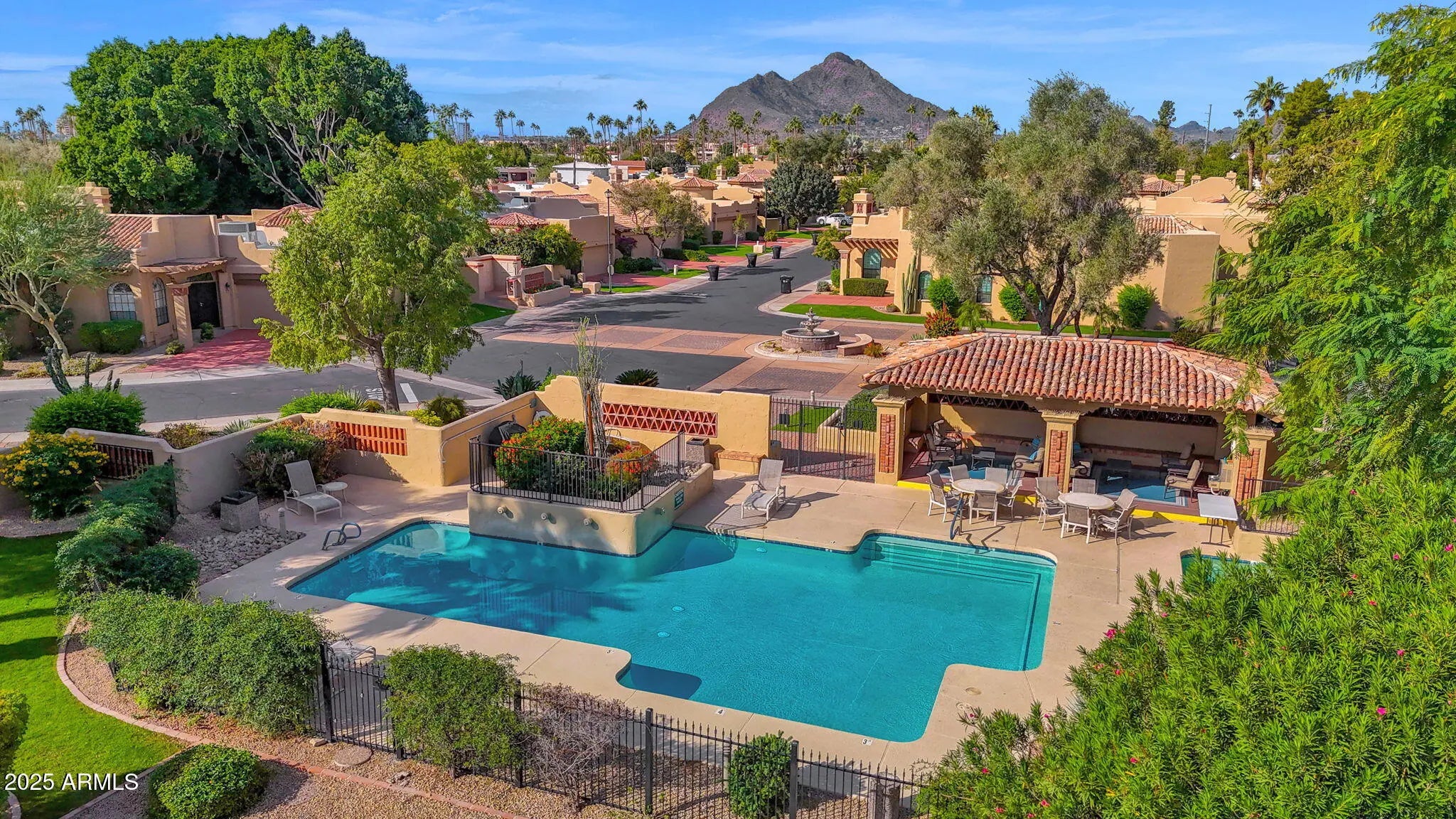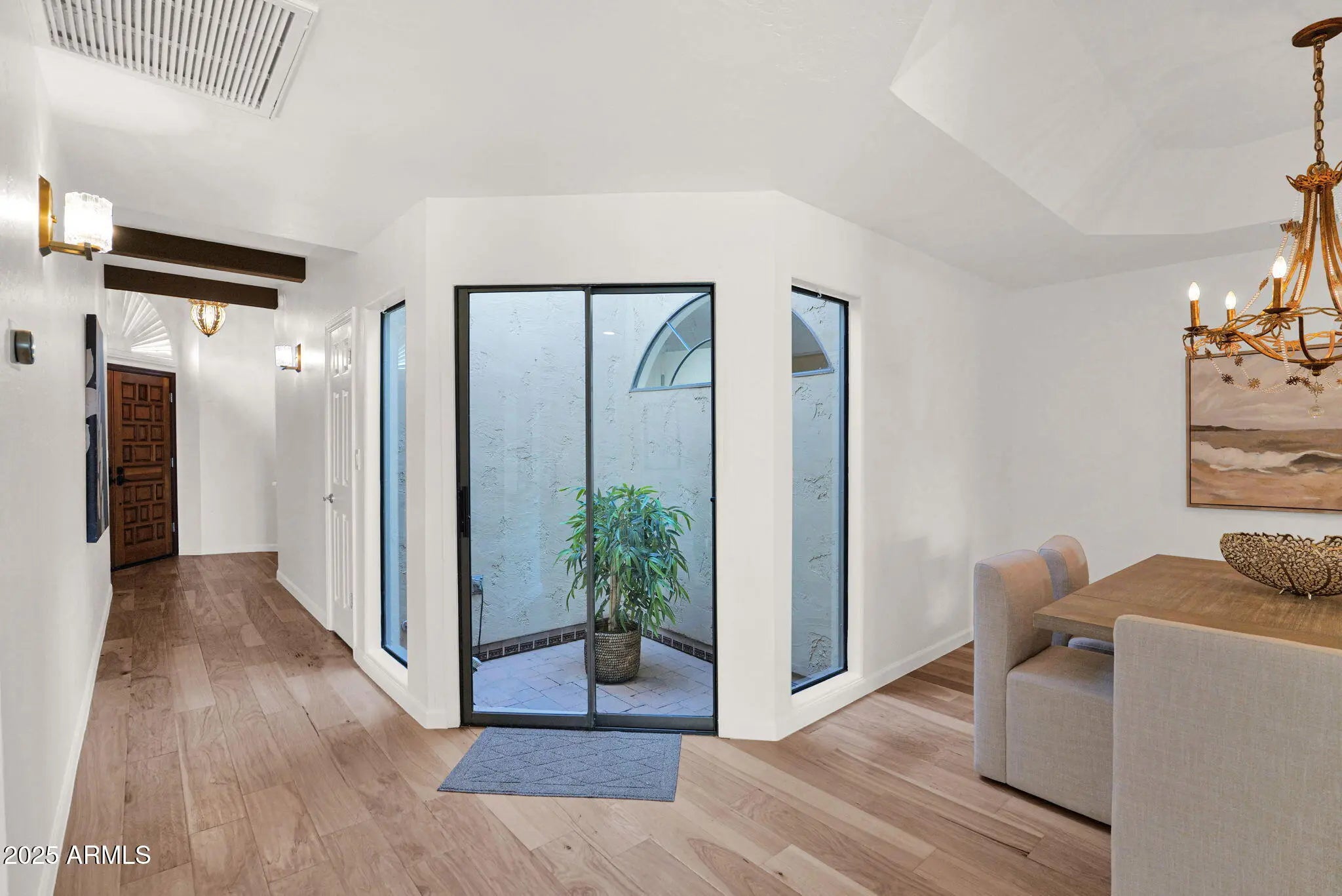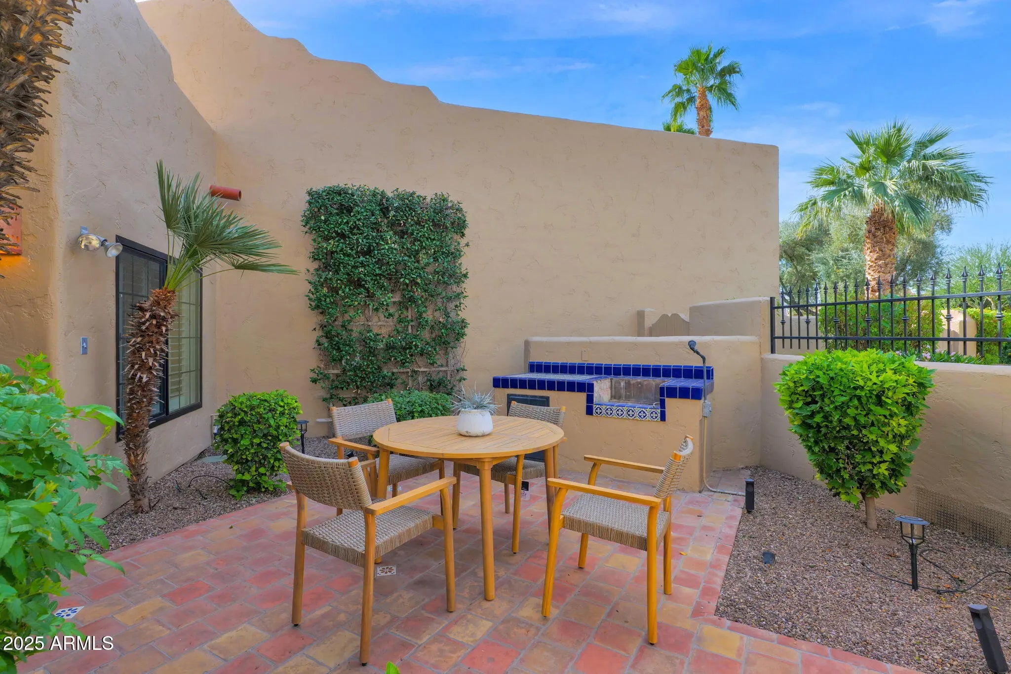 Welcome Home to your beautifully renovated residence tucked within the heart of Scottsdale's coveted gated community La Villita. Thoughtfully redesigned by the current owner with expert craftsmanship and modern comfort in mind, this home is bright, inviting, and perfectly positioned to take advantage of one of the community's best locations—offering stunning Camelback Mountain views, a large private yard ideal for entertaining, no rear neighbors with a peaceful greenbelt backdrop, and easy access to the community pool. Step inside to the glow of the Seller's remodel that highlights freshly painted baseboards, door jams, walls, new Kitchen Chandelier, outlets and light switches. The stunning flooring remodel is where Hickory Handscraped Sunglow planks create a seamless blend of luxury, texture, and comfort throughout the home. An elegant setting for both everyday living and stylish entertaining. The Kitchen showcases a true designer layout with granite countertops, abundant cabinetry, a center island, RO system, and beautifully upgraded finishes all accented by Stainless Steel appliances. The space overlooks your own backyard oasis, which flows seamlessly to the greenbelt and leads directly to the Community Pool. The Formal Dining Room is thoughtfully positioned for effortless entertaining, framed by refined style and an inviting atrium. The Living Room makes a striking impression with vaulted ceilings accented by wood beams, an inviting fireplace, and dual sliding doors that fill the space with natural light enhanced by automated security metal sliders for added peace of mind. The generously sized Ensuite Bedroom features exquisite floor-to-ceiling built-in cabinetry with a charming sitting area. The stunning ensuite Bathroom offers a luxe retreat complete with glass block shower, beautifully crafted cabinetry and flooring, custom mirrors, dual brass sinks, and a convenient built-in washer and dryer. The cozy second bedroom is highlighted by soft designer tones and creates a serene transition to the home's tranquil passageway that creates the home's stunning panoramic views. It can easily function as a Home Office or Study. The two-car garage boasts sleek epoxy flooring and full-length built-in cabinetry on both sides, creating a polished and highly functional storage space. A true standout of this home is the expansive private patio, completely reimagined with stone and designer xeriscape an ideal outdoor haven for relaxing, entertaining, or taking in the tranquil greenbelt surroundings and mountain vistas. Seller's are offering a credit to Buyers with an executed Purchase Contract for a new Grill. Located just seconds from the Community Pool and minutes from Scottsdale's premier destinations including Scottsdale Fashion Square, Camelback Park, Chaparral Park, and everyday conveniences --this home blends luxury, comfort, with an exceptional location!