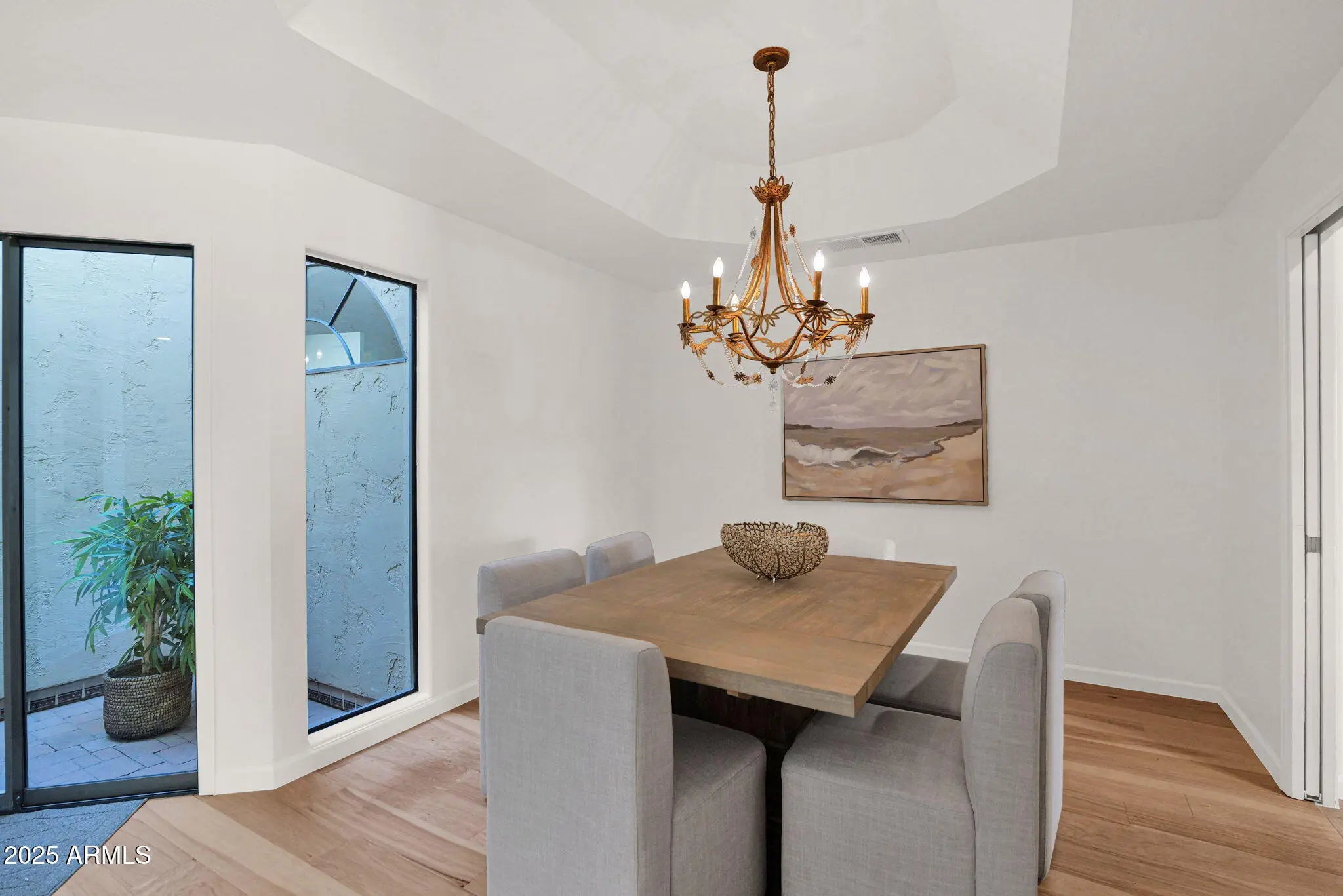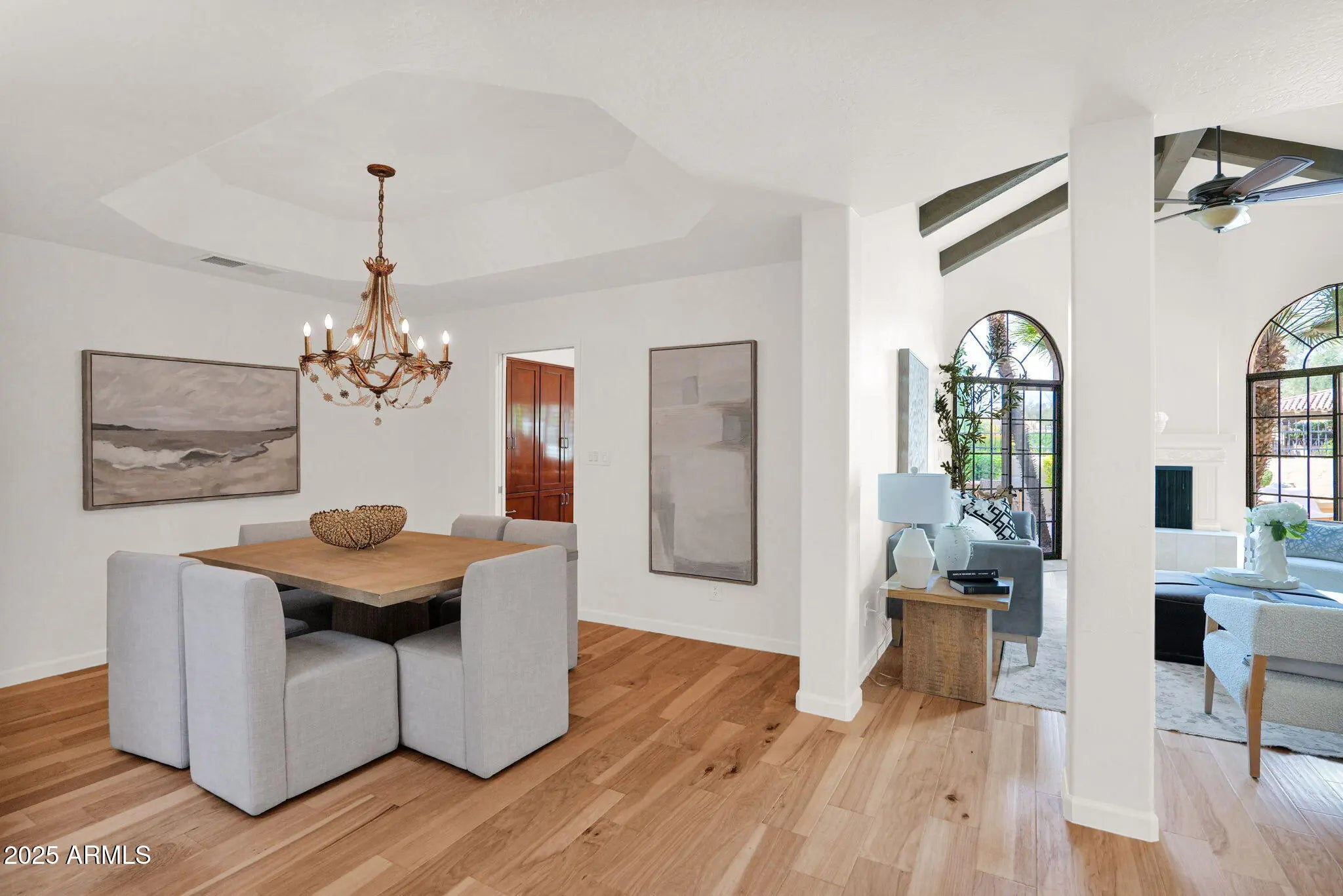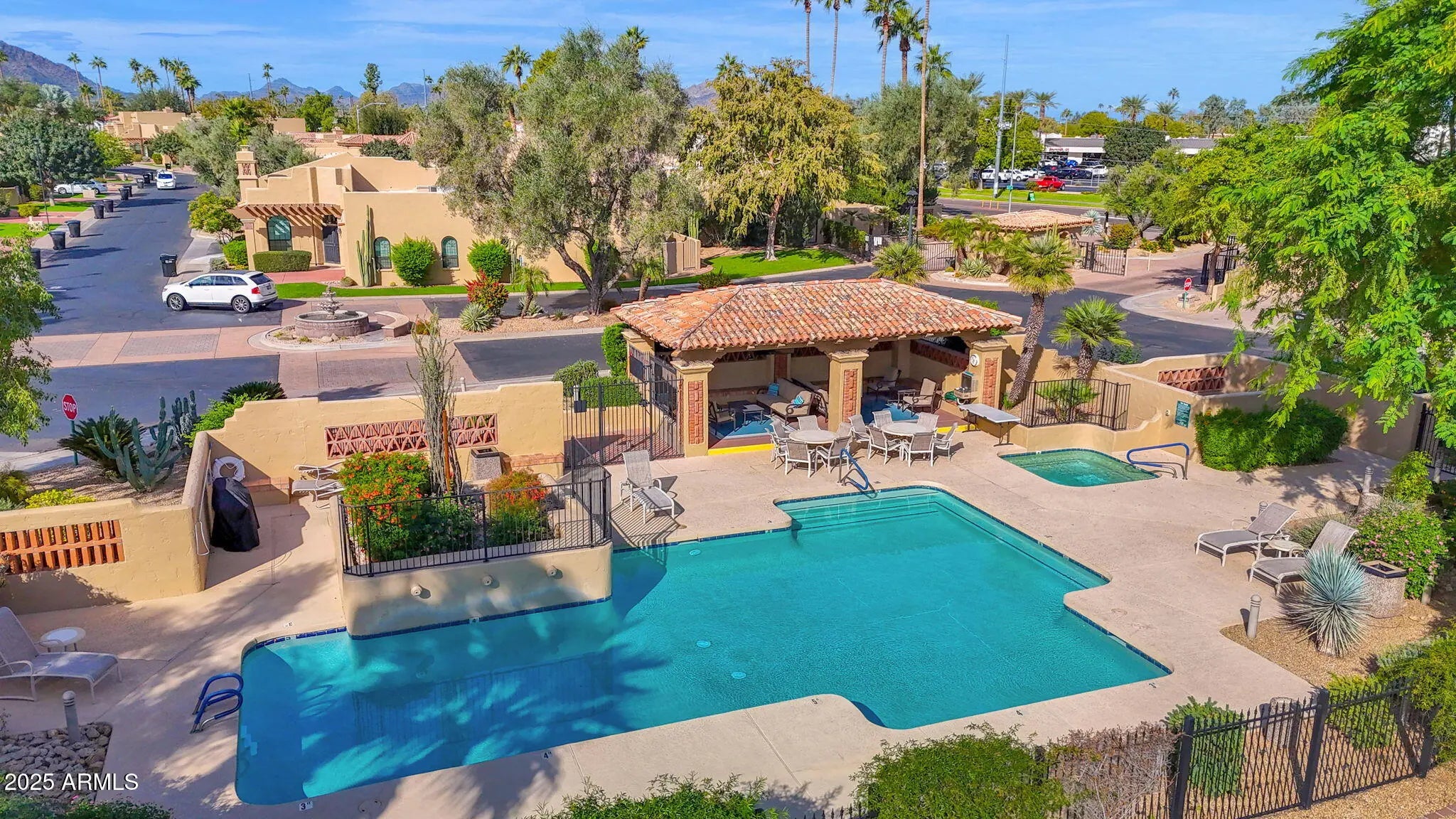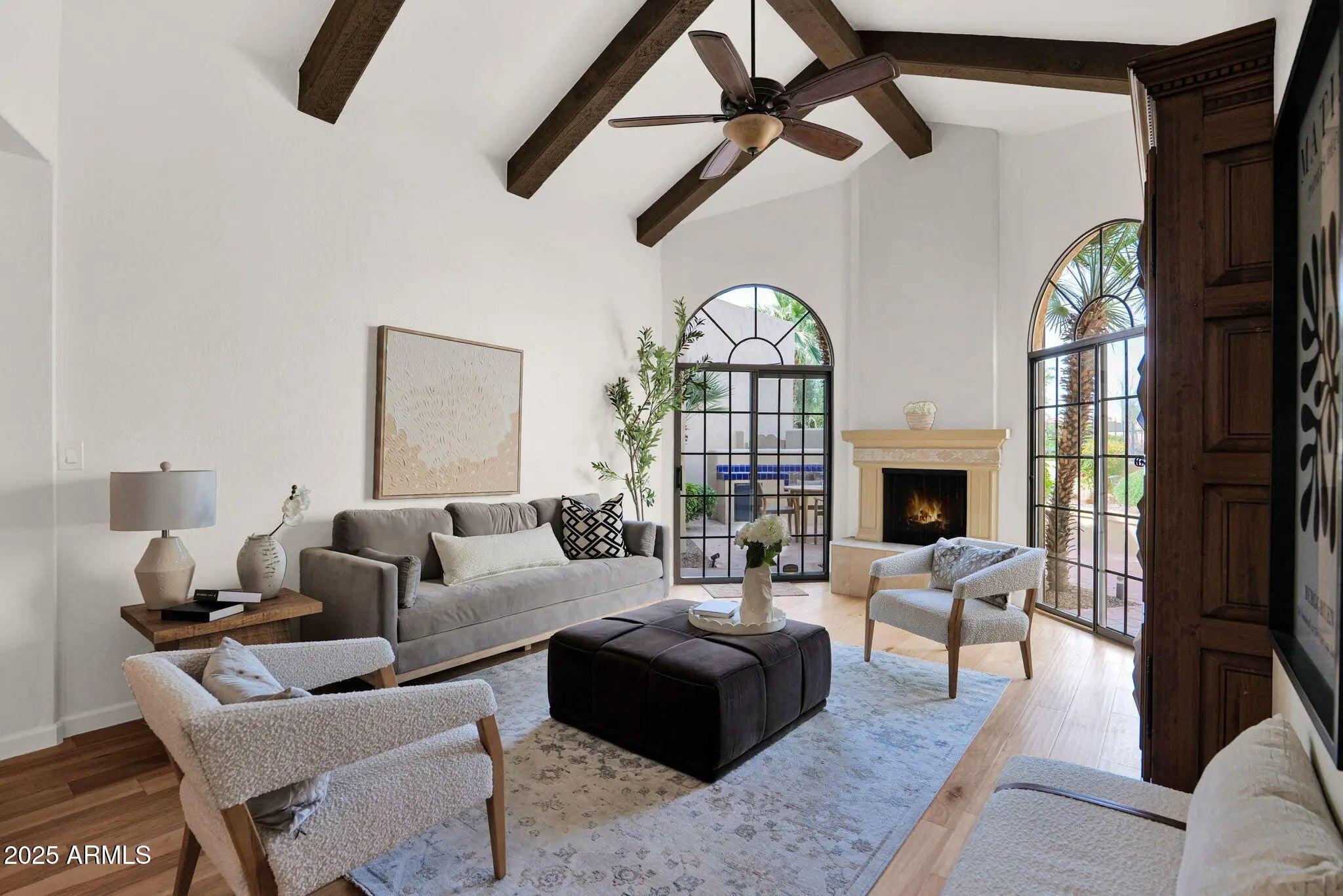 Welcome Home to your beautifully renovated residence tucked within the heart of Scottsdale's coveted gated community La Villita. Thoughtfully redesigned by the current owner with expert craftsmanship and modern comfort in mind, this home is bright, inviting, and perfectly positioned to take advantage of one of the community's best locations—offering stunning Camelback Mountain views, a large private yard ideal for entertaining, no rear neighbors with a peaceful greenbelt backdrop, and easy access to the community pool. Step inside to the glow of the Seller's remodel that highlights freshly painted baseboards, door jams, walls, new Kitchen Chandelier, outlets and light switches. The stunning flooring remodel is where Hickory Handscraped Sunglow planks create a seamless blend of luxury, texture, and comfort throughout the home. An elegant setting for both everyday living and stylish entertaining. The Kitchen showcases a true designer layout with granite countertops, abundant cabinetry, a center island, RO system, and beautifully upgraded finishes all accented by Stainless Steel appliances. The space overlooks your own backyard oasis, which flows seamlessly to the greenbelt and leads directly to the Community Pool. The Formal Dining Room is thoughtfully positioned for effortless entertaining, framed by refined style and an inviting atrium. The Living Room makes a striking impression with vaulted ceilings accented by wood beams, an inviting fireplace, and dual sliding doors that fill the space with natural light enhanced by automated security metal sliders for added peace of mind. The generously sized Ensuite Bedroom features exquisite floor-to-ceiling built-in cabinetry with a charming sitting area. The stunning ensuite Bathroom offers a luxe retreat complete with glass block shower, beautifully crafted cabinetry and flooring, custom mirrors, dual brass sinks, and a convenient built-in washer and dryer. The cozy second bedroom is highlighted by soft designer tones and creates a serene transition to the home's tranquil passageway that creates the home's stunning panoramic views. It can easily function as a Home Office or Study. The two-car garage boasts sleek epoxy flooring and full-length built-in cabinetry on both sides, creating a polished and highly functional storage space. A true standout of this home is the expansive private patio, completely reimagined with stone and designer xeriscape an ideal outdoor haven for relaxing, entertaining, or taking in the tranquil greenbelt surroundings and mountain vistas. Seller's are offering a credit to Buyers with an executed Purchase Contract for a new Grill. Located just seconds from the Community Pool and minutes from Scottsdale's premier destinations including Scottsdale Fashion Square, Camelback Park, Chaparral Park, and everyday conveniences --this home blends luxury, comfort, with an exceptional location!