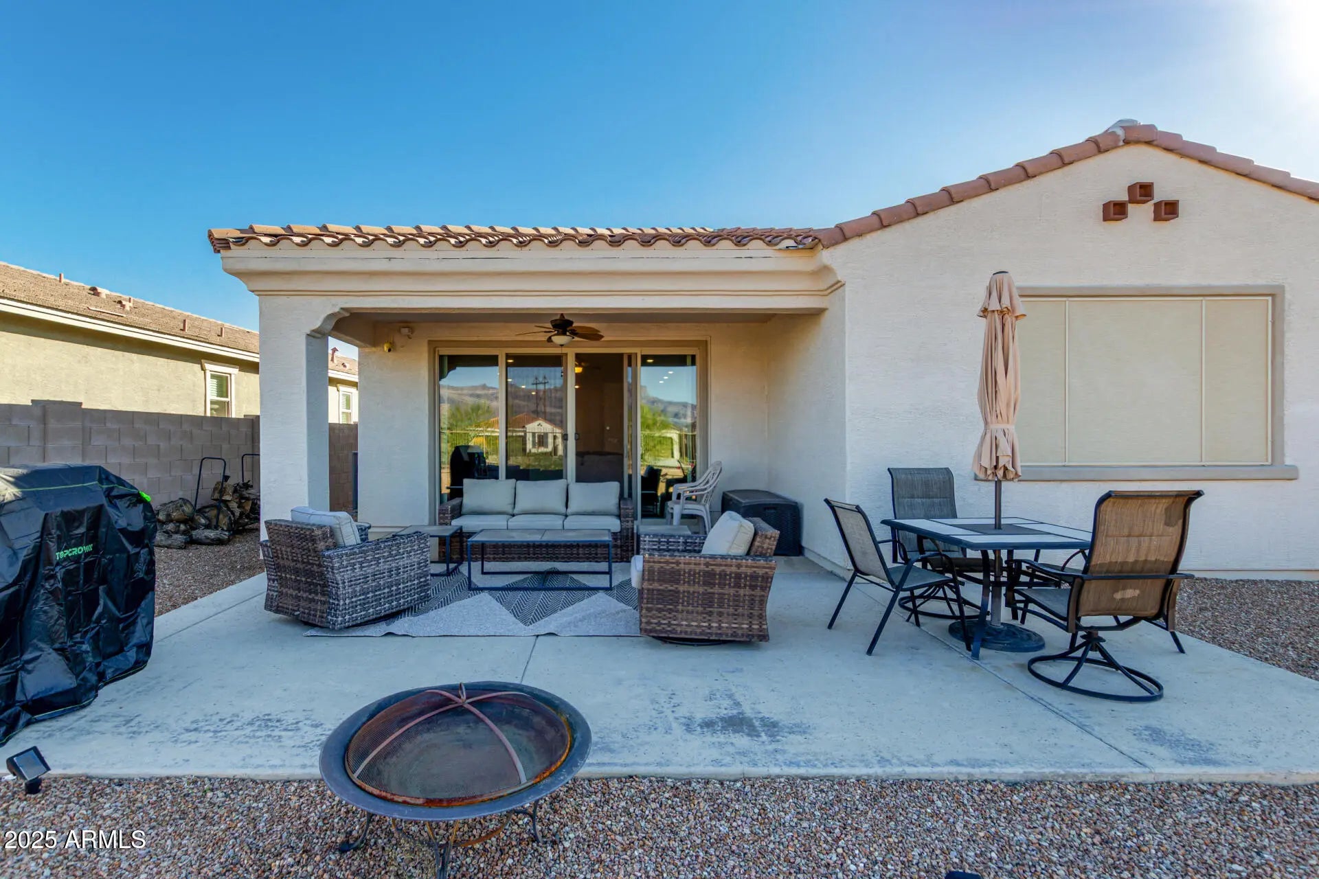 This energy efficient Lennar home also includes the following upgrades: a beautiful security screen door, ceiling fans, sunscreens, and driveway extended 2ft each side located in Peralta Canyon in Gold Canyon! A covered porch leads to a custom security door with sunscreens and opens to a captivating open floor plan with high ceilings, recessed lighting and durable tile flooring as well as plush carpeting in all the bedrooms. 5 interior ceiling fans have been added to this lovely home and one on the patio creating wonderful airflow inside and out. The impeccable kitchen comes with granite counters, abundant wood cabinetry with crown molding, stainless steel appliances including stove, microwave, dishwasher and LG Refrigerator w/ 2 ice makers (purchased in 2024), reverse osmosis, a pantry and an island with a breakfast bar (stools included). All the appliances convey, including the refrigerator in the garage, washer and dryer. The primary bedroom features an ensuite with dual sinks, walk-in shower and a walk-in closet. Each bathroom has a handrail installed in the shower. The backyard boasts majestic mountain views and a spacious extended patio which include patio furniture and grill! Garage floors have been conveniently coated. Soft water system installed!! Sunscreens have been added throughout!! Gold Canyon offers majestic mountain views of the Arizona desert with award-winning golf courses and walking trails for outdoor enthusiasts. Close to shopping and dining. Come and see!!