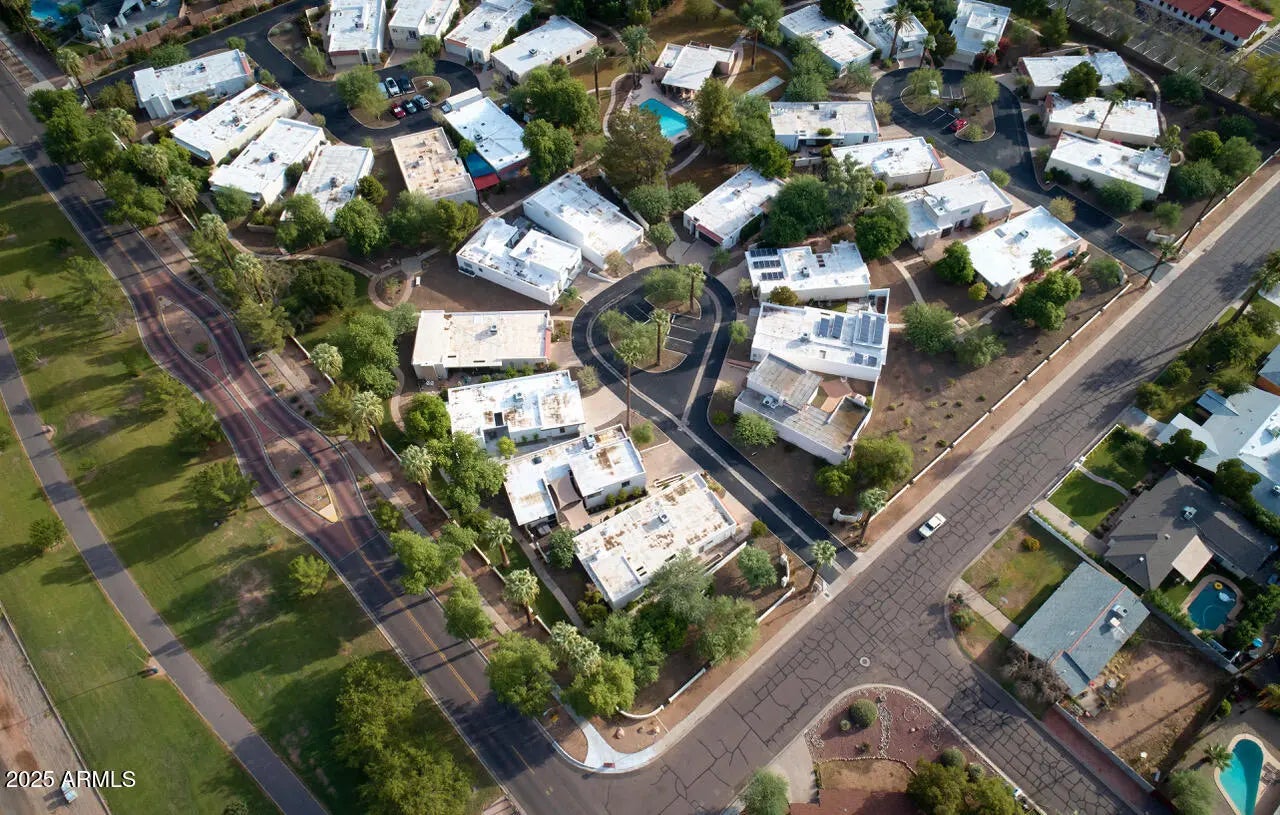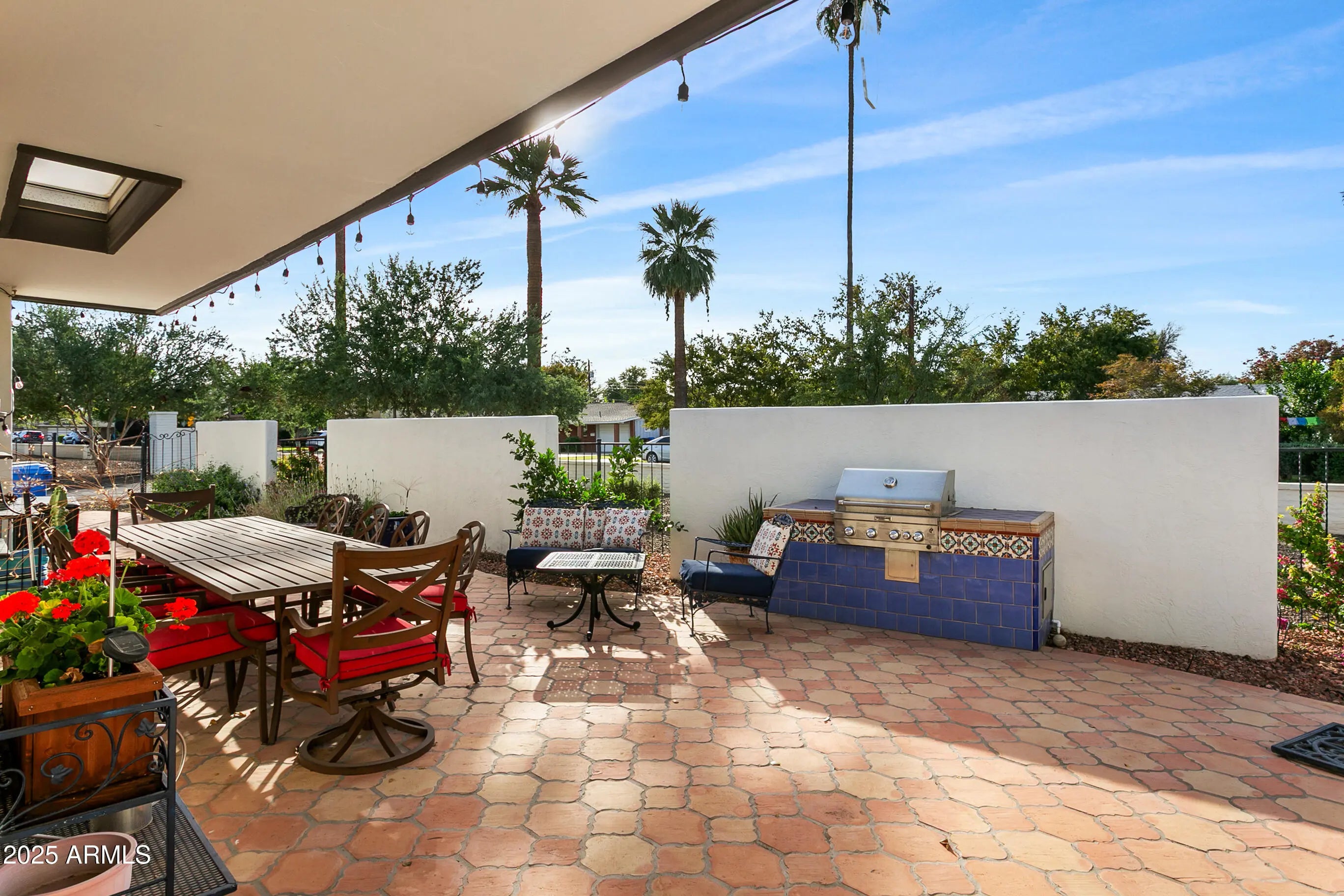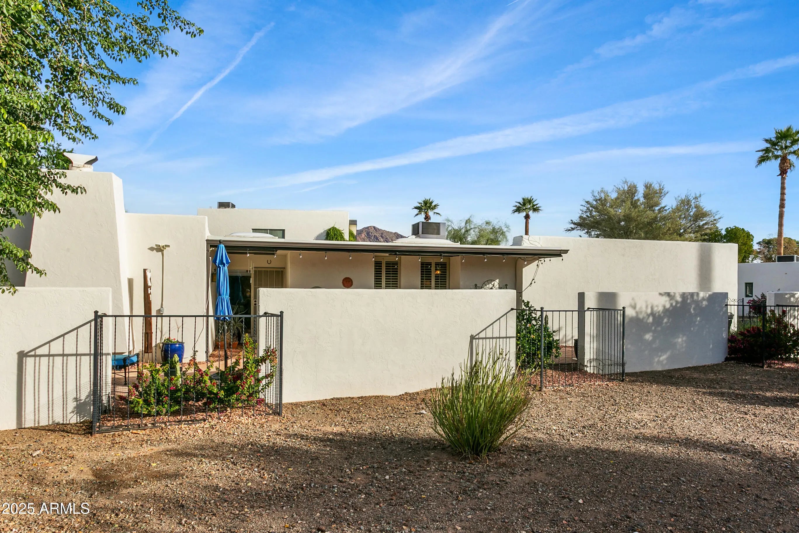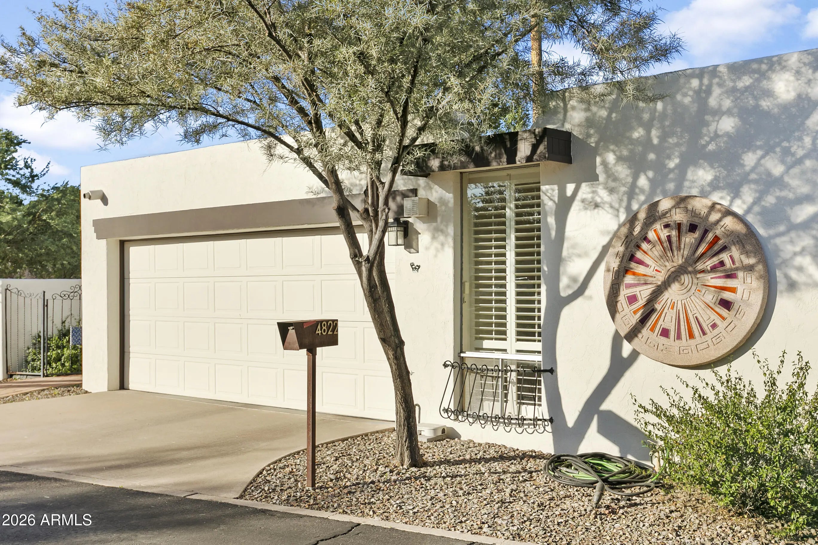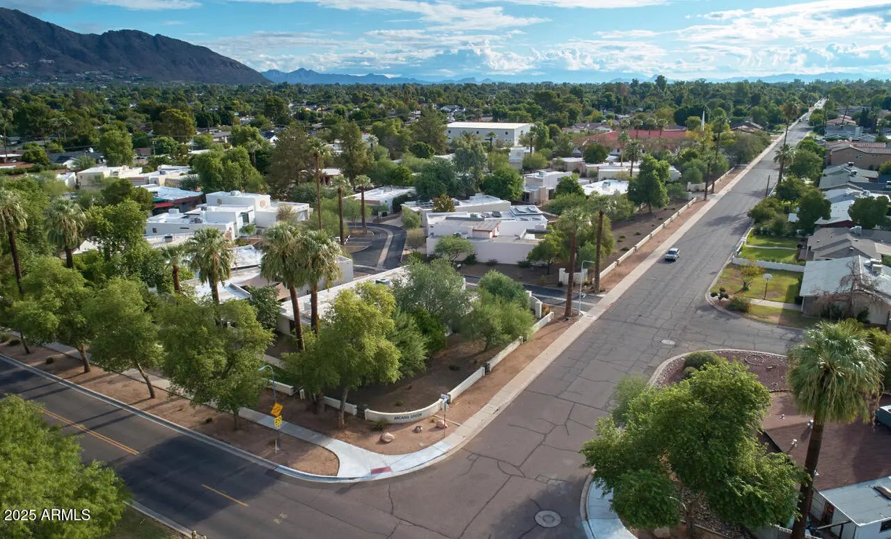 Highly sought after Arcadia Green, a mid-century community of 38 detached patio homes on 10 park-like acres with walking paths, clubhouse, pool, and heated spa. This charming single level 3BR home invites you in through a private courtyard paved with terracotta tile and a built-in BBQ. The open floorplan gives a feeling of warmth with wood-look tile, hand-crafted touches and cozy gas fireplace. The kitchen features a Wolf gas range, brushed marble countertops and plentiful storage. Updated colorful bathrooms with handmade Mexican tile and sinks. Plantation shutters throughout. Generous storage, large 2-car garage, and an office nook. Great Lower Arcadia location; walk or bike to nearby shops, dining, schools, greenbelt and canal trails. Minutes to Old Town and Sky Harbor Airport. Many updates including HVAC 2022, Roof 2022, Water heater 2024, Sewer lines replaced 2018.