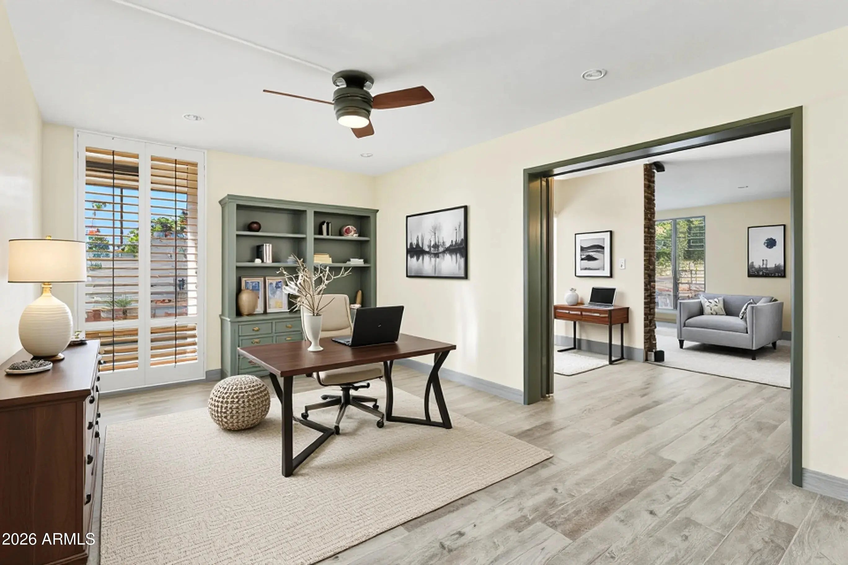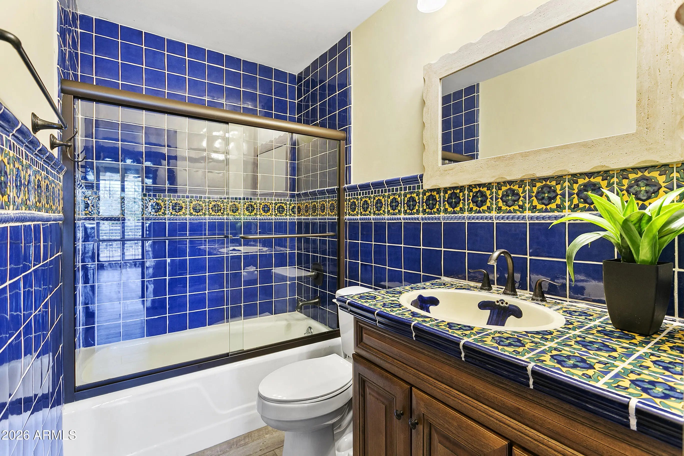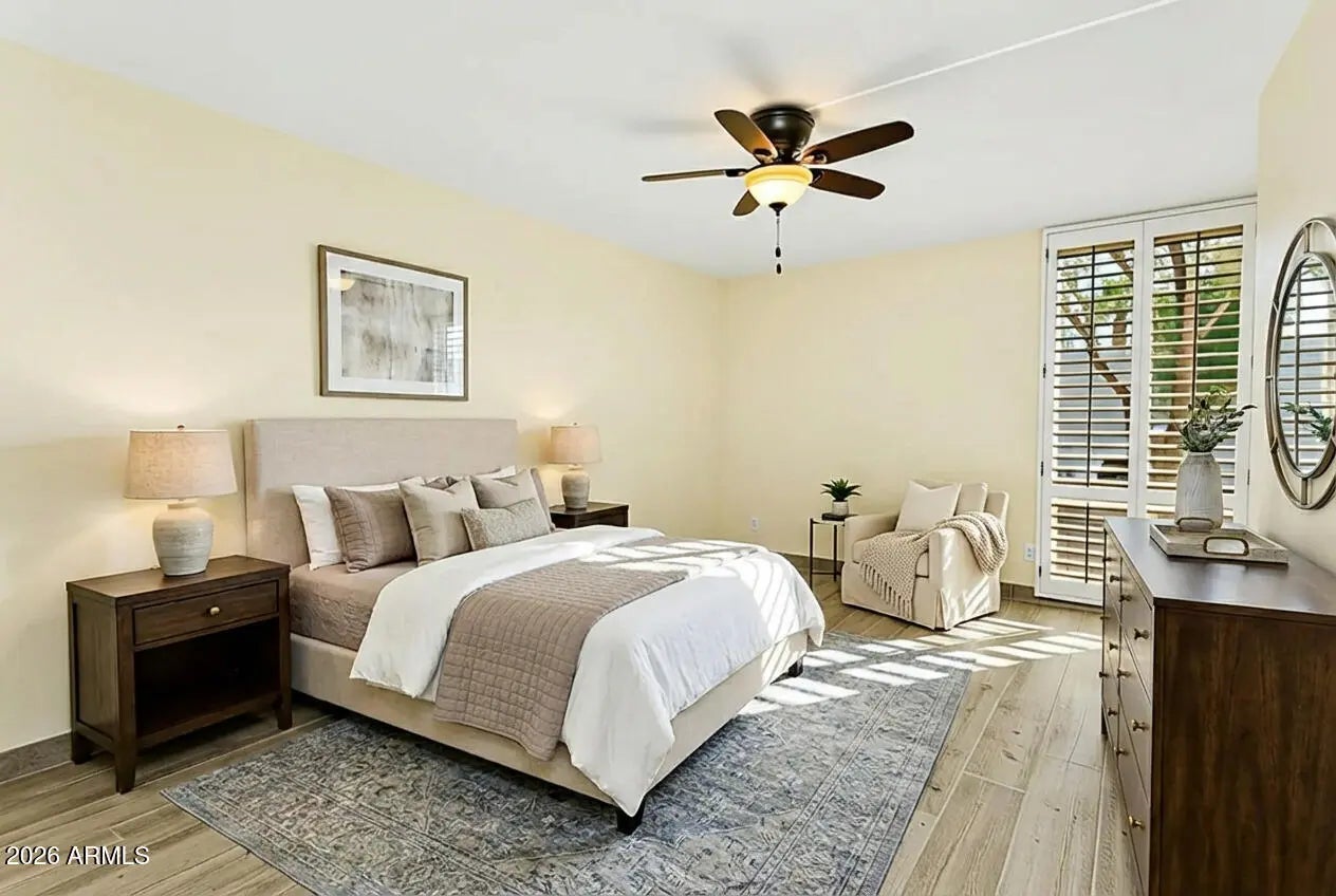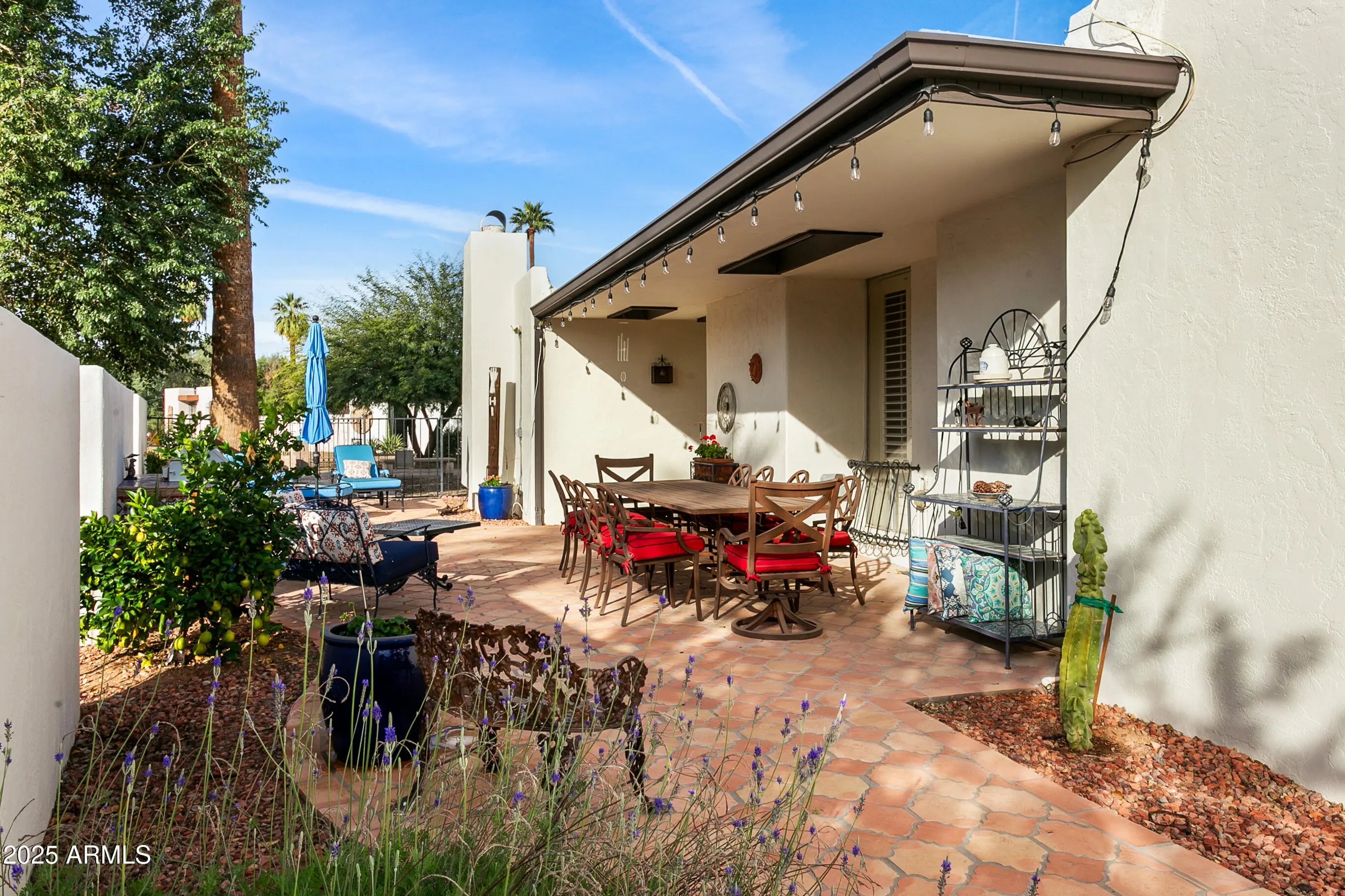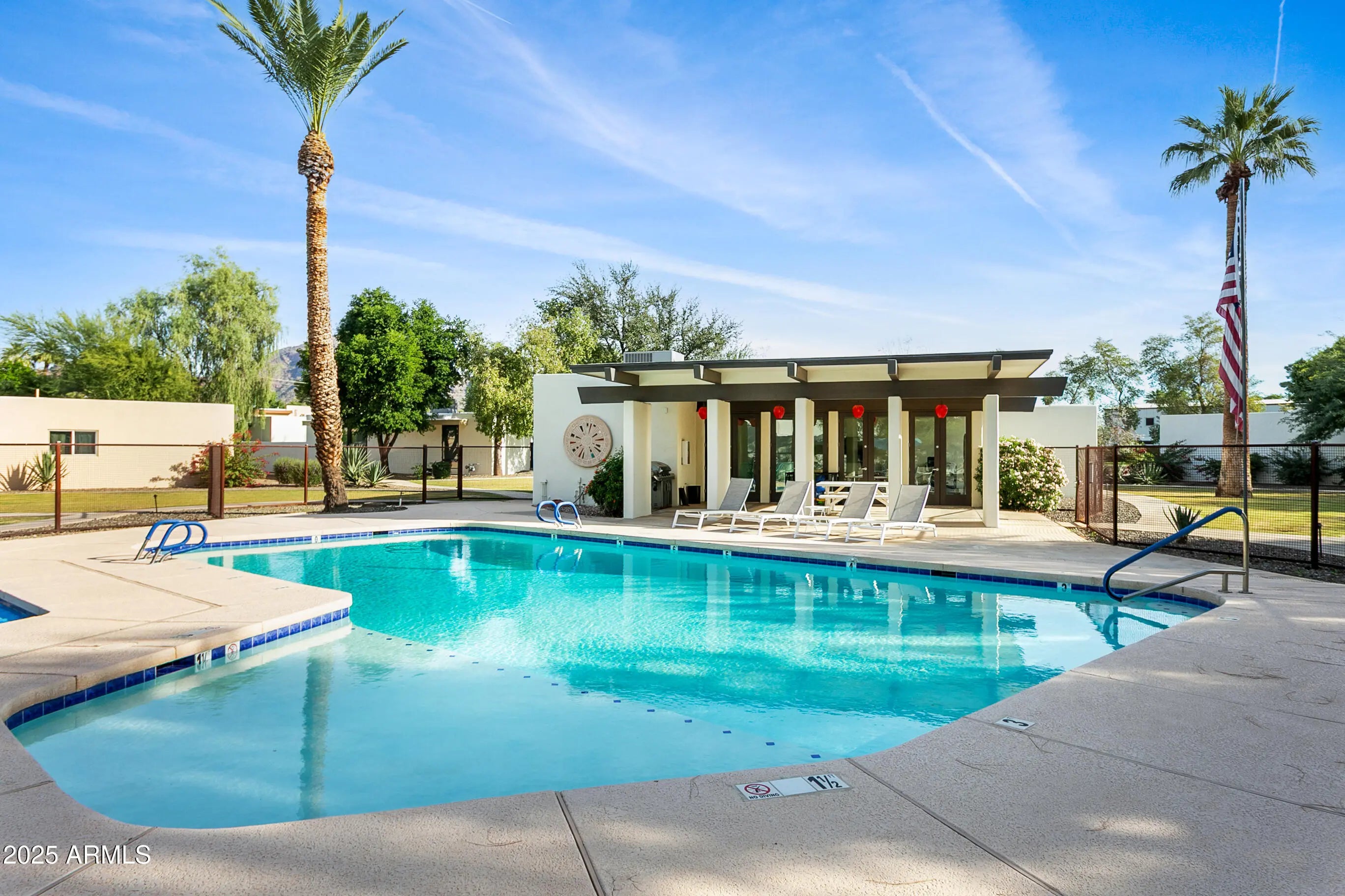 Highly sought after Arcadia Green, a mid-century community of 38 detached patio homes on 10 park-like acres with walking paths, clubhouse, pool, and heated spa. This charming single level 3BR home invites you in through a private courtyard paved with terracotta tile and a built-in BBQ. The open floorplan gives a feeling of warmth with wood-look tile, hand-crafted touches and cozy gas fireplace. The kitchen features a Wolf gas range, brushed marble countertops and plentiful storage. Updated colorful bathrooms with handmade Mexican tile and sinks. Plantation shutters throughout. Generous storage, large 2-car garage, and an office nook. Great Lower Arcadia location; walk or bike to nearby shops, dining, schools, greenbelt and canal trails. Minutes to Old Town and Sky Harbor Airport. Many updates including HVAC 2022, Roof 2022, Water heater 2024, Sewer lines replaced 2018.