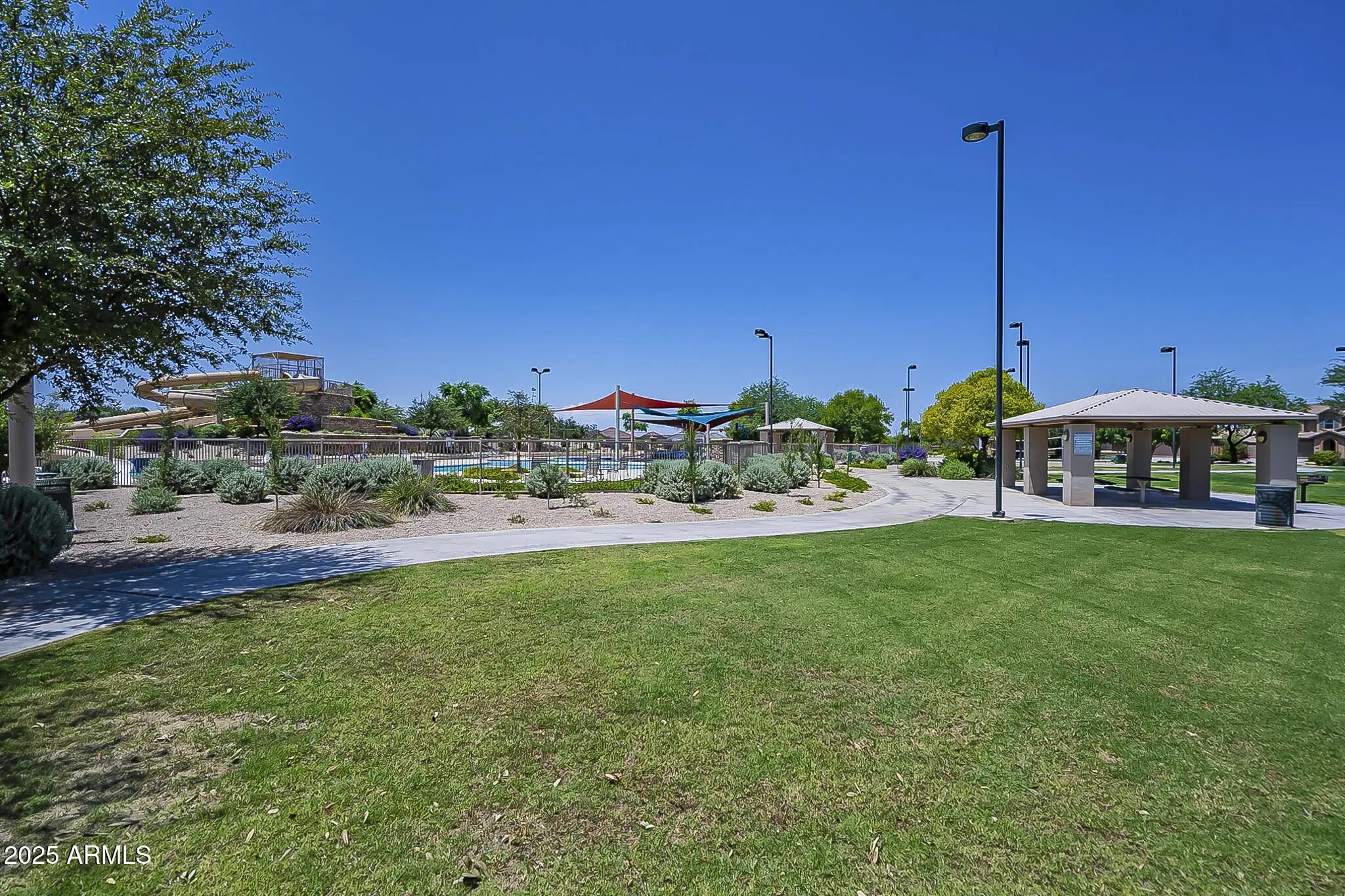 Resort living in Casa Grande! This 4-bed dream home features a heated pool, water softener and new luxury vinyl plank flooring! Located directly across from a park and a water park for instant fun and relaxation. Inside, enjoy an open-concept living area, a cozy family room, and a chef's kitchen. OWNED SOLAR keeps energy bills low! The backyard is perfect for entertaining with a covered patio, metal pergola, spa/hot tub, gazebo, fire pit and sparkling HEATED pool. This home blends comfort, style, and outdoor living in one beautiful package!