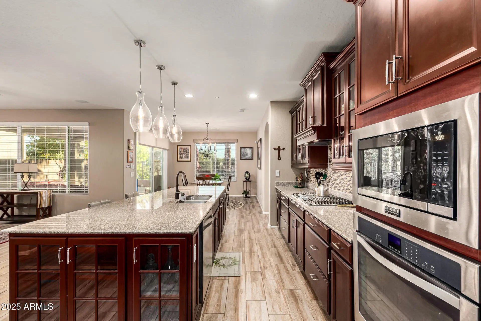Nestled in Litchfield Park's most desirable communities, this well maintained 2-bedroom, 2.5-bath home offers the perfect blend of comfort, privacy, & low-maintenance living. This open floor plan seamlessly connects the family room, dining room/den/office, eat-in kitchen, & breakfast area. Kitchen features rich cabinetry, granite countertops, spacious island & abundant storage. Tile flooring throughout common areas; bedrooms offer soft carpet. Large Primary Suite has a large walk-in closet. Secondary bedroom has its own en-suite for convenience. Enjoy exceptional privacy & picturesque views, thanks to the home's premium location within the community. Garage is equipped with built-in cabinets. HOA maintains front yard & exterior paint. Patio has built-in BBQ. Enjoy the community pool!