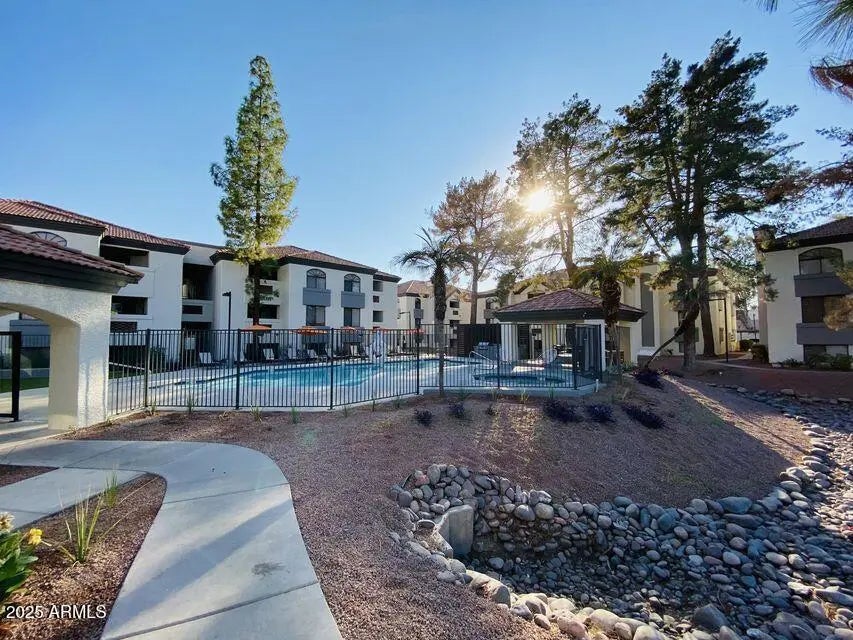 Beautifully updated 2-bedroom, 2-bath condo in a gated community with recently renovated amenities. This home offers laminate wood flooring in the living areas and bedrooms, tile in the kitchen and bathrooms, and walk-in closets in both bedrooms. The spacious living room features a charming fireplace, ceiling fans, and a large decorative mirror. The modern kitchen includes a walk-in pantry, and the private balcony provides a relaxing space with great views. The community showcases lush landscaping, a pool, spa, and peaceful walkways. Conveniently located within walking distance to Mesa Community College, Banner Desert Hospital, and numerous dining options. Quick access to the 60 and 101 freeways makes commuting easy.