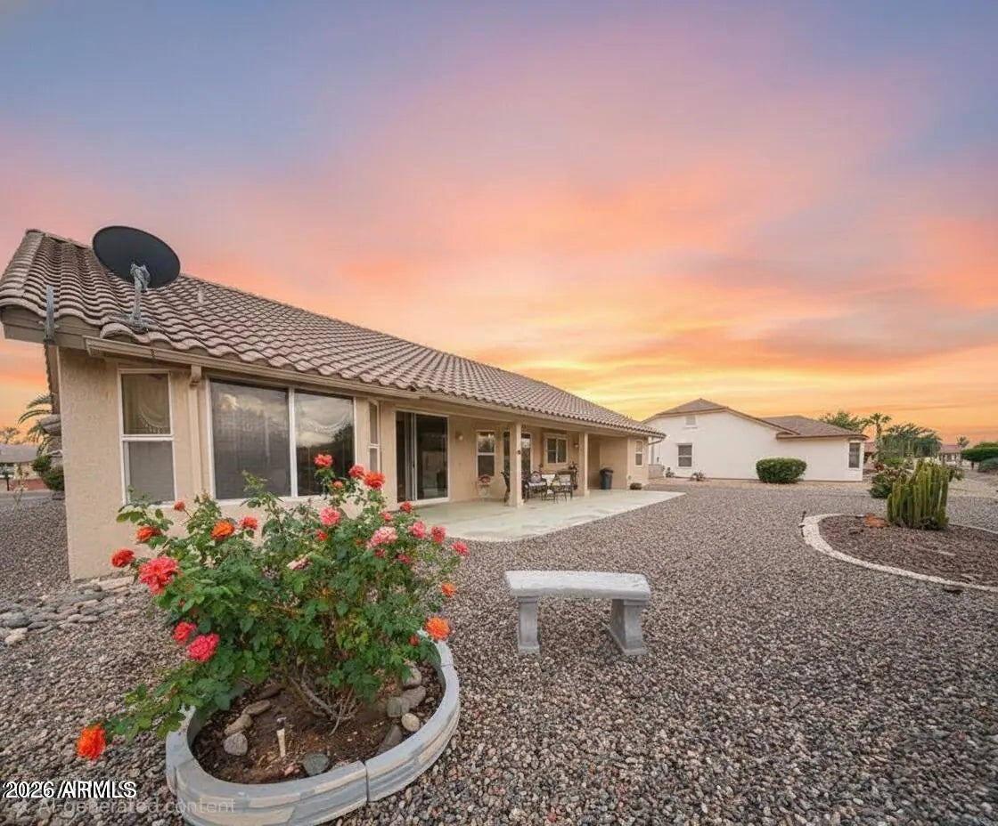 FULLY PAID OFF SOLAR - This bright Ventura floor plan offers exceptional natural light and a smart, open layout. The extended primary suite features a cozy bay window with space for a sitting area. A versatile office/hobby room adds flexibility, while both the family room and living room provide great gathering spaces. Enjoy a sunny kitchen with a bay-window breakfast nook. The formal living and dining areas flow beautifully for entertaining. Step outside to a covered, extended patio perfect for year-round outdoor living. Located near four golf courses, shopping, dining, and full medical services. Community perks include two recreation centers with heated pools and spas. Home also offers an assumable 2.5% rate