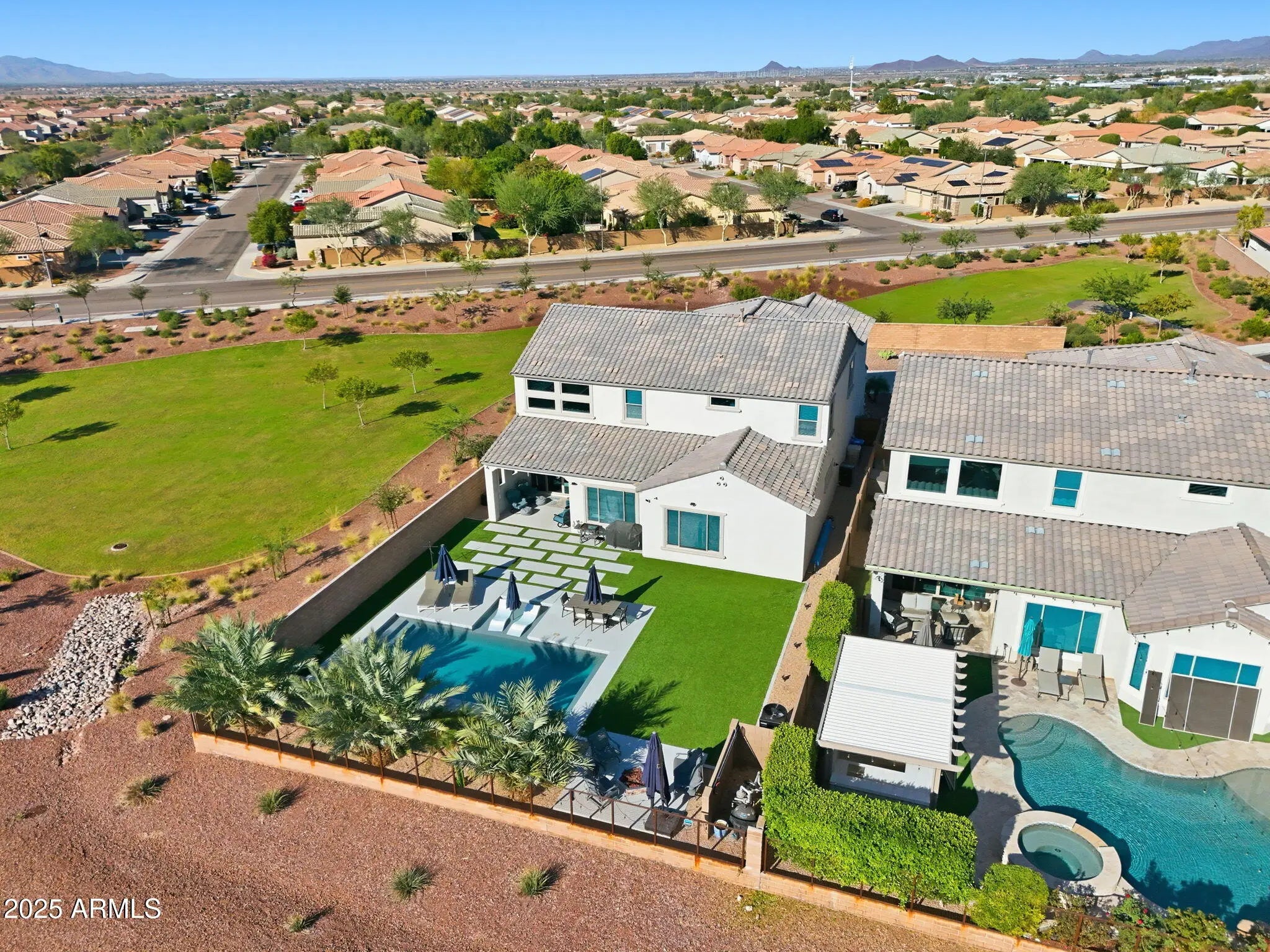 Welcome home to this stunning 3,624 sq ft, 5-bedroom + oversized loft residence set on the best 12,990 sq ft premium cul-de-sac lot with a view fence, open space behind, and only one neighbor. The first-floor primary suite offers a custom built-in closet, dual sinks, and a walk-in super shower, while a dedicated downstairs office with French doors adds flexibility. A bright great room flows into the gourmet kitchen with a waterfall quartz island, KitchenAid stainless steel appliances, and upgraded cabinetry. The spacious dining room opens to the kitchen and features a slider to the covered patio for effortless alfresco dining. Upstairs you'll find all additional bedrooms plus the oversized loft. Outside is a heated play pool, lush turf, fire pit area, sun-shaded patio, and a 4-car garage. Nestled in the highly desirable community of The Meadows, this home offers access to exceptional neighborhood amenities and a vibrant lifestyle. Residents enjoy a beautiful Community Center, resort-style pool & spa, pickleball courts, and outdoor basketball courts, along with nearby Liberty Park for additional recreation. The community is conveniently located near top-rated A-rated schools, including Liberty High School, Sunset Heights Elementary, and Basis Peoria. Easy access to the Loop 101 freeway provides quick connectivity to shopping, dining, and Valley hot spotsperfect for anyone seeking comfort, convenience, and a premier Peoria location.