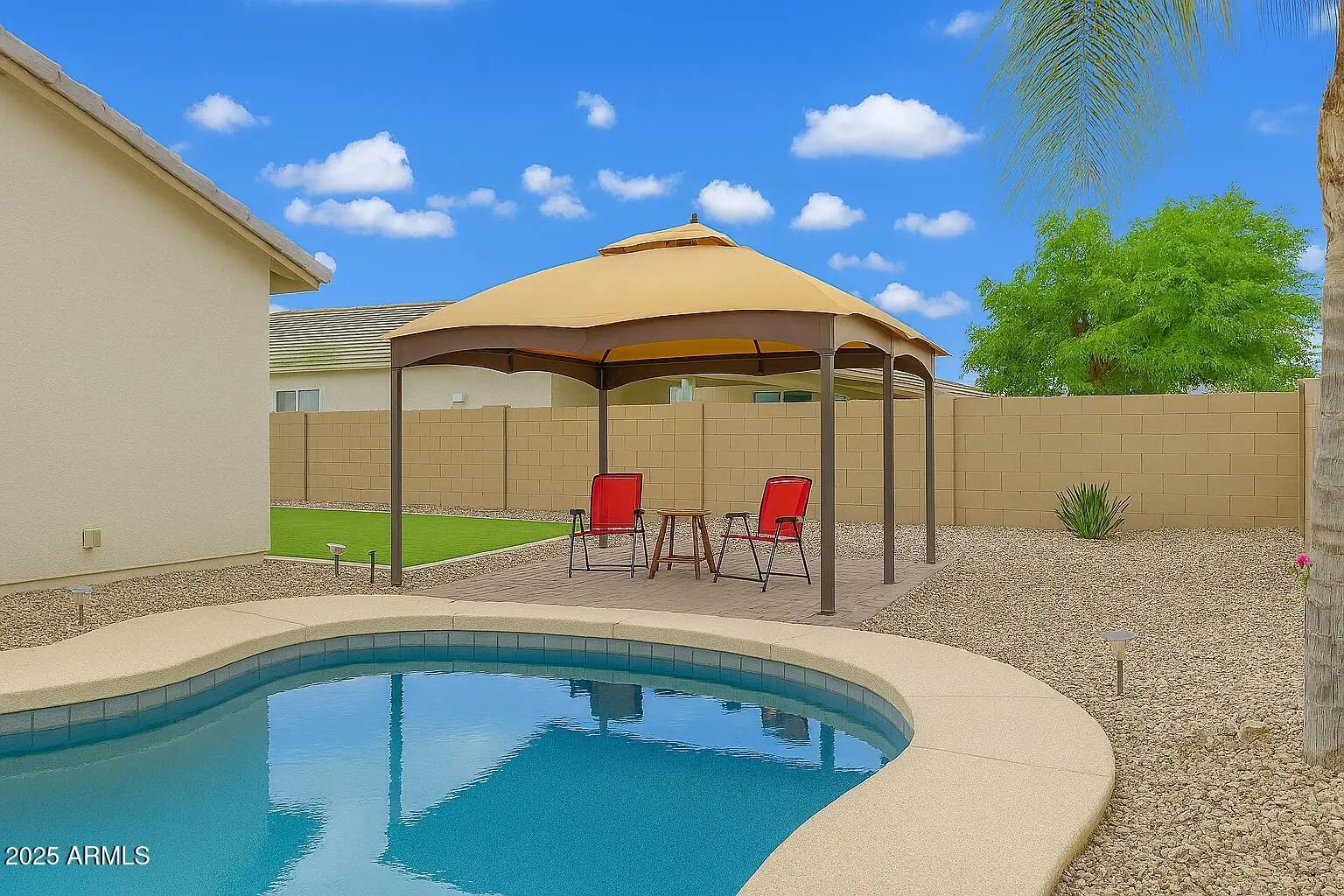 ShamRockin' Style meets everyday comfort! Packed with buyer favorites--pool, gazebo, new turf, new carpet, shutters, a versatile front flex space, 4-beds, primary split, new water heater and a warm custom interior palette all wrapped with newer exterior paint. A rare find that feels like striking gold in a home that's lucky from every angle. low $50 HOA + HOME WARRANTY INCLUDED! Welcome home! This beautiful single-level residence offers 4 spacious bedrooms, 2 baths, and a 3-car garage. At the front of the home, you'll find a versatile flex spaceperfect for an office, game room, library or sitting area. Let your imagination make it your own! The Primary ensuite is thoughtfully split from the other bedrooms for added privacy. Fresh new carpet in all the bedrooms, while tile flooring extends throughout the rest of the home. Elegant plantation shutters add style and energy efficiency throughout. The open-concept floor plan flows effortlessly from the living area to the kitchen, ideal for gatherings and everyday living. Enjoy newer exterior paint for great curb appeal and step outside to your private backyard oasis complete with a sparkling pool, new artificial turf perfect for relaxing or entertaining. New Water Heater too! Legacy Traditional School and American Leadership Acadamy nearby! Located near local favorites like Schnepf Farms, the Queen Creek Olive Mill, Fat Cats, and Pecan Lake Entertainment, this home combines comfort, style, and convenience.