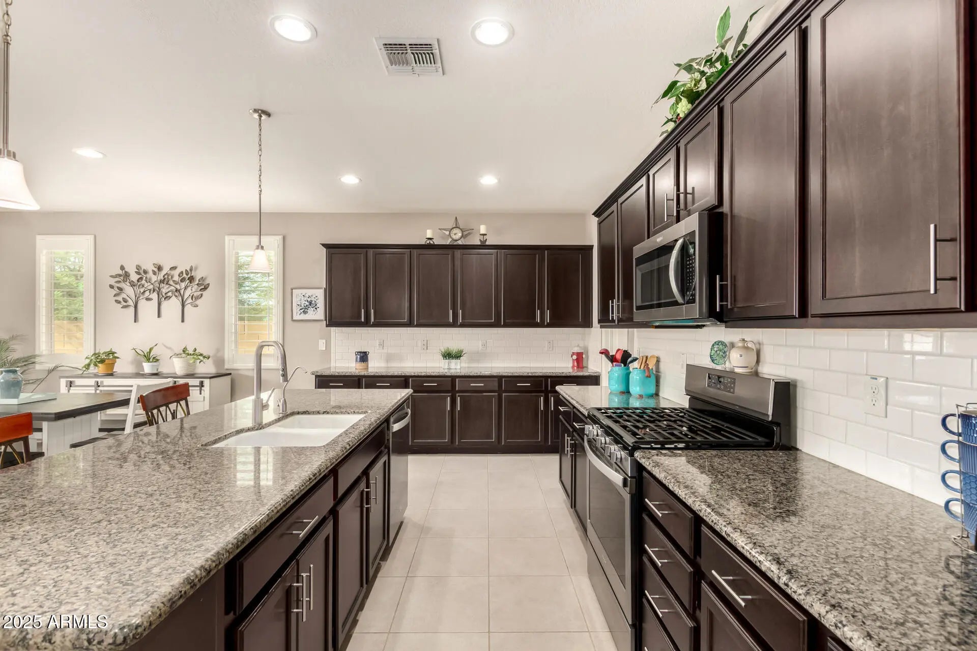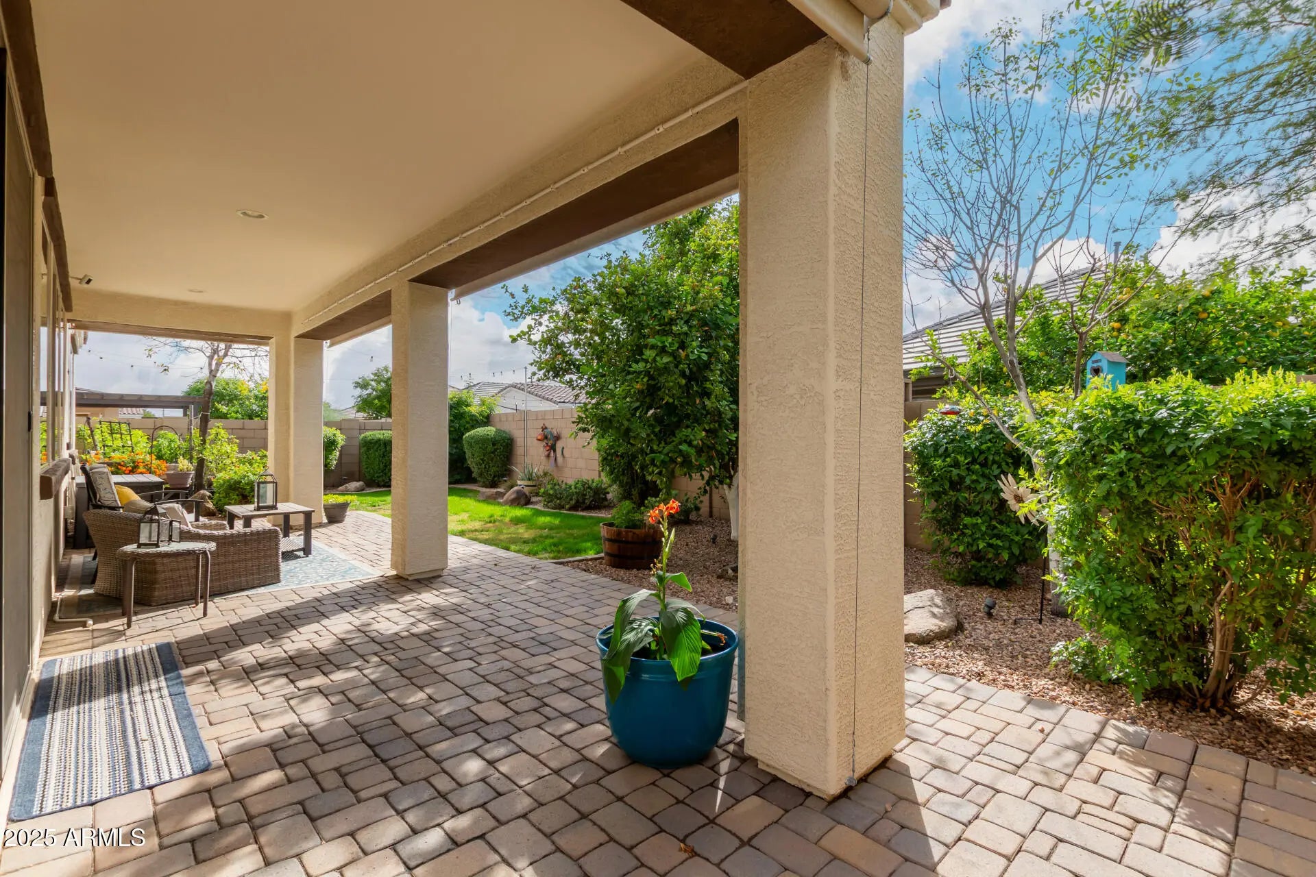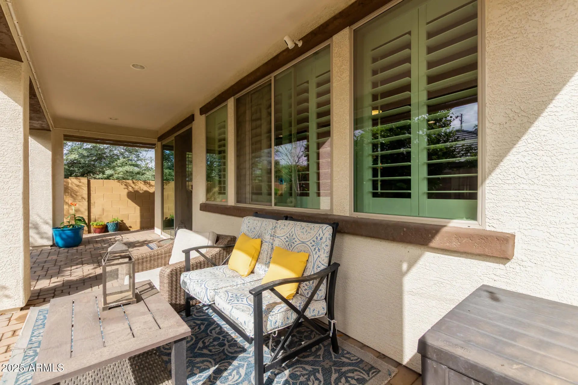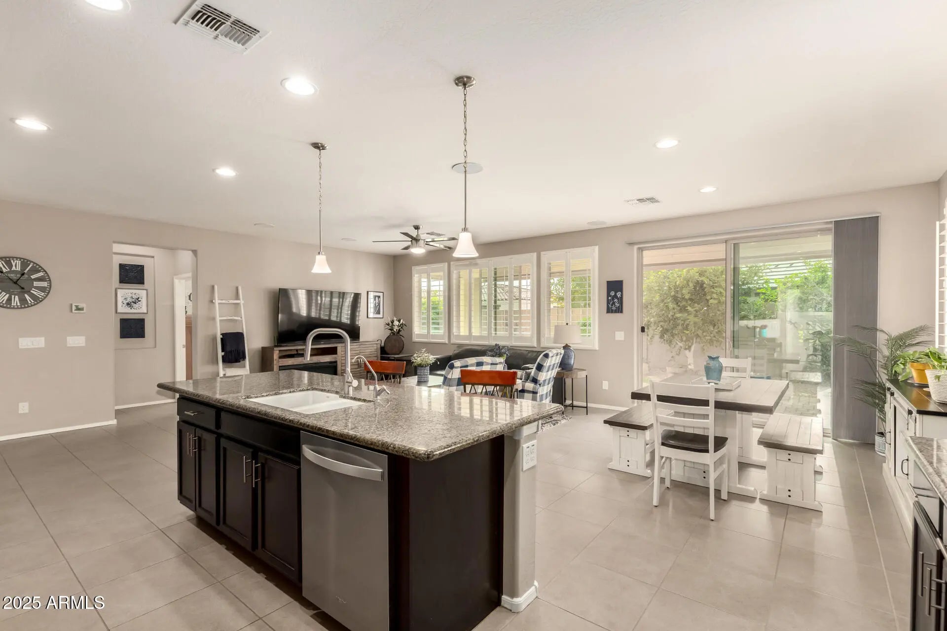 Home, sweet home! Nestled in a desirable corner lot next to a park, and a short walk to the community pool, main park and garden. Step inside to explore the sizable living spaces with tile flooring, high-efficiency windows throughout with plantation shutters, while the surround system in the living room creates the perfect opportunity for entertaining, plus the stereo and base station can convey. The gourmet kitchen boasts ample recessed lighting, cabinetry adorned with crown molding, subway tile backsplash, granite countertops, a large walk-in pantry and an island with a breakfast bar for those quick meals and casual conversations. SS appliances and R/O system at the sink and fridge. The tranquil main bedroom hosts a bathroom with double sinks for convenience and a walk-in closet for easy organization. Both spacious bathrooms feature a porcelain countertop, while every room has a walk-in closet for added storage. High-efficiency A/C and ceiling fans in every room, as well as a gas tankless water heater to keep the temperature just right year-round. The whole home has a water filtration system and a water softener. You'll find several smart wall switches and timers, as well as USB outlets in each room. Let's not forget the 7-camera ring surveillance system for peace of mind (5 outdoors, 2 indoors). The bonus room can be used as a gym, and the flooring can convey. Step outside to your relaxing backyard, complete with a large covered patio with well-laid pavers where you can enjoy your morning brew and dine al fresco with the lovely view of the park, a water feature with refill valve, a full-patio misting system, retractable sunshades, wired landscaping lighting, raised garden beds with irrigation and timers, a fully mature lemon tree, an infant peach tree, and shade trees that create the coziest vibe. The 2-car garage features a 240V hookup for EV charger, metal cabinets, and an overhead rack for extra storage, a work bench, plenty of wall-mounted utility hangers, an overhead kayak storage rack, and a Genie smart garage door opener. SO many features you will just LOVE! Hurry up, this gem won't last!