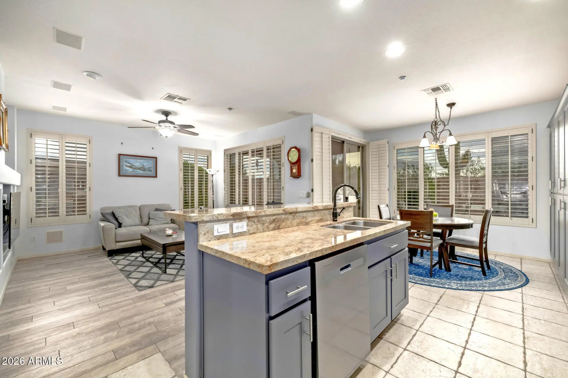 Welcome to the kind of home people move to Anthem Country Club for. Backing a natural desert wash with open mountain views, this single-level retreat blends privacy, beauty, and effortless living. Owner has just replaced roof underlayment and redone patio roof! Inside the split floor plan offers a updated faux wood flooring in all the right places & plantation shutters frame a bright, open feel and a see-through fireplace. The fully remodeled 2023 kitchen feels fresh and modern with new cabinetry, granite counters, stainless appliances, and extra storage. Outside the home offers an extended paver patio, a 15-foot water feature, and view fencing create a tranquil outdoor living space perfect for sunset dinners, morning coffee, or hosting friends after a round of golf. The split primary off generous walk-in closet and updated bath, shower area. With a 2018 HVAC, epoxy garage, and low maintenance landscaping, this is a true lock and leave home designed for ease. All within Anthem Country Club a gated, resort style community with golf privileges, fitness centers, pools, dining, and a full social calendar. This is where lifestyle meets comfort.