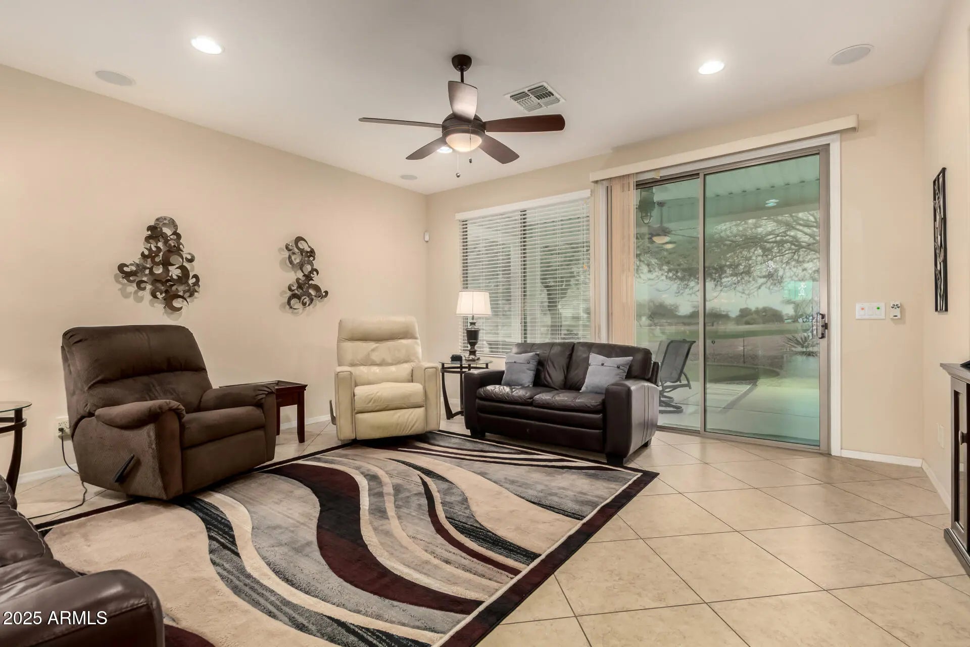 Discover your dream home! This stunning 2-bedroom residence with a den offers a 2-car garage, RV gate, and elegant stone accents. The welcoming front patio leads to a bright living room featuring high ceilings, recessed lighting, and tile flooring. The eat-in kitchen is a chef's delight with granite counters, ample cabinetry, pendant lighting, a tile backsplash, stainless steel appliances, and a breakfast bar. Relax in the den, perfect for an office or lounge.The primary bedroom has soft carpeting, direct backyard access, an ensuite with double sinks, and a walk-in closet. Golf course views, scenic sunsets, and a beautiful fountain off the green in the backyard, complete with a covered patio and a putting green. Walking distance to clubhouse. convenient golf cart gate completes this home
