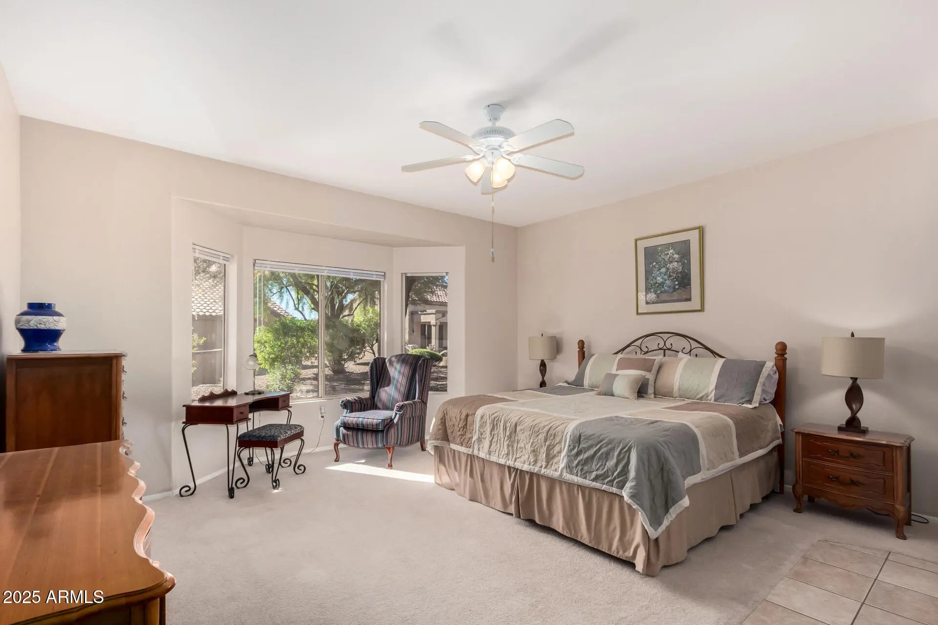 This highly sought-after Palo Verde model features an open floor plan with split bedrooms, offering 2 bedrooms, 2 bathrooms, and a versatile office or flex space. The eat-in kitchen boasts upgraded cherry cabinets, and tile runs throughout all common areas. Enjoy a bay window in the primary bedroom, an extended patio, and an extended garage with built-in cabinets. A brand-new roof/underlayment was added in April 2025. Home is being offered fully furnished with separate bill.