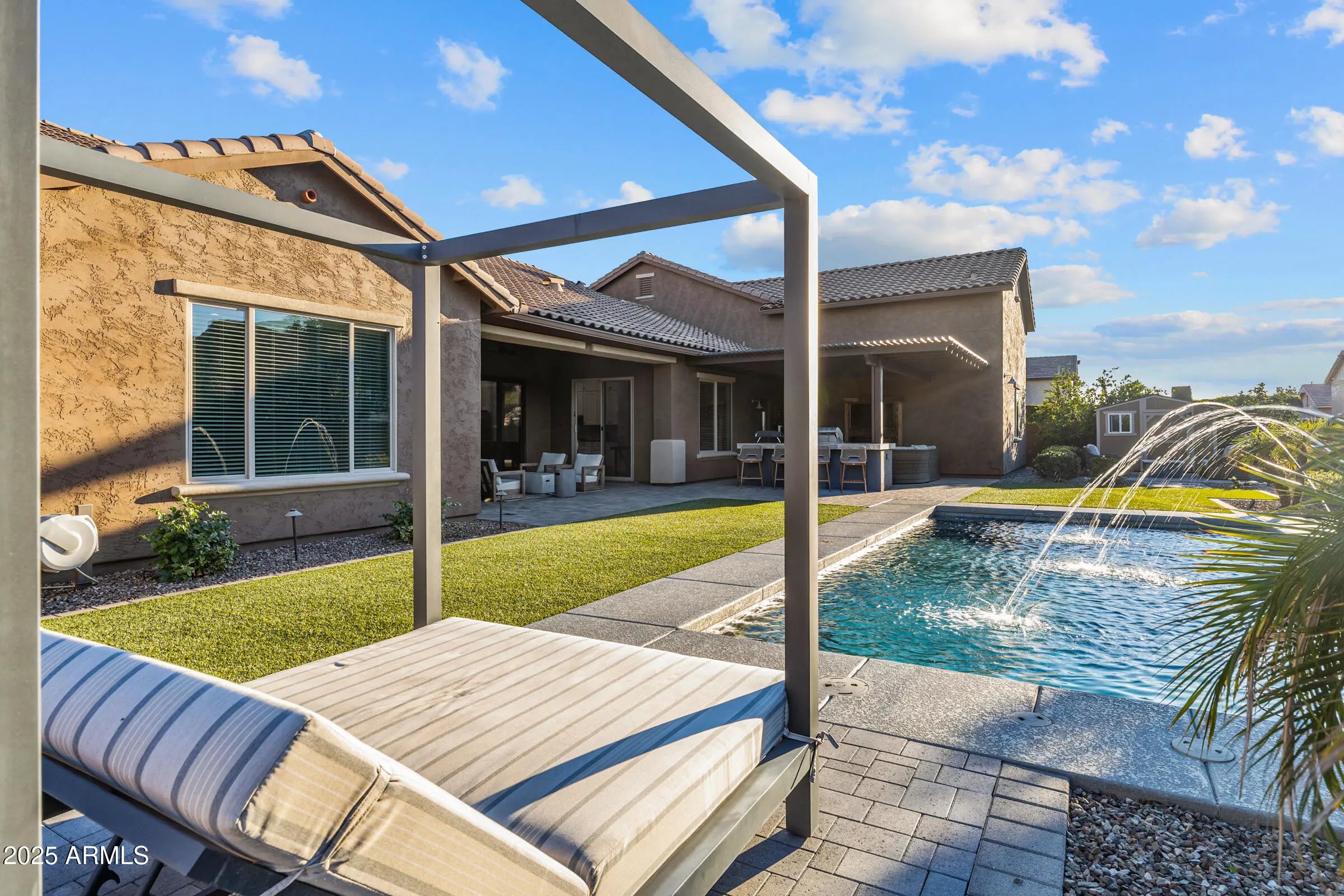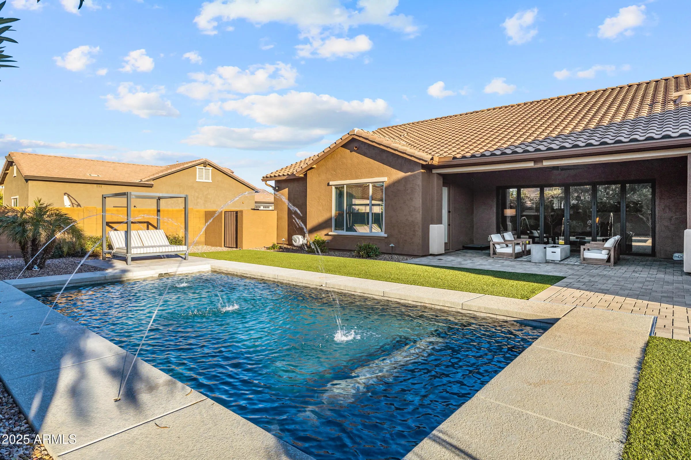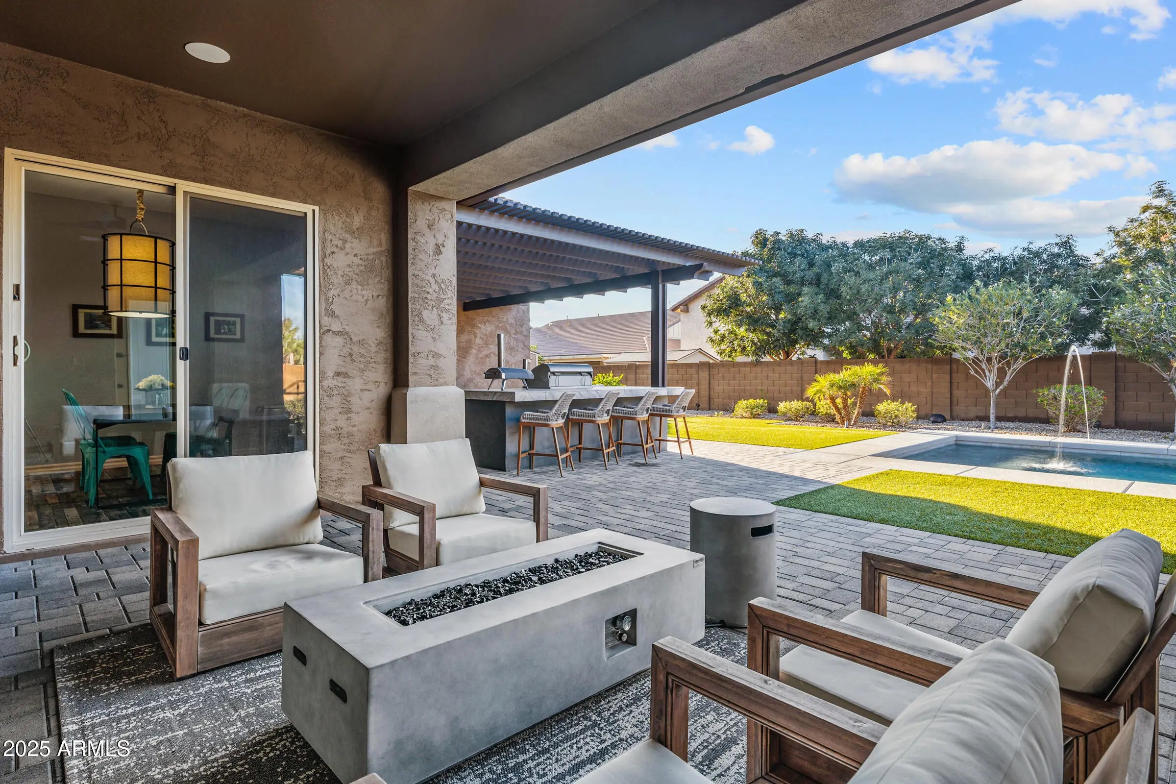 Fantastic single-level home packed with upgrades! Inside you'll find 4 bedrooms, den, 8'interior doors, and a gorgeous kitchen with to-the-ceiling cabinets, quartz counters, upgraded appliances and farm sink. Custom stacking doors create a dramatic indoor-outdoor flow. The backyard features a built-in BBQ, beautiful pool surrounded by turf, outdoor fireplace and firepit, shaded areas perfect for entertaining. A convenient interior bath opens to the backyard. Completing the home are the 24'x52' AC RV garage w/mezzanine loft and an additional 2-car garage with epoxy floors and built-ins. Oh, and year-round holiday lighting in all colors-no ladders, just press a button! It's time to grab your things and get over quick-this is a good one!