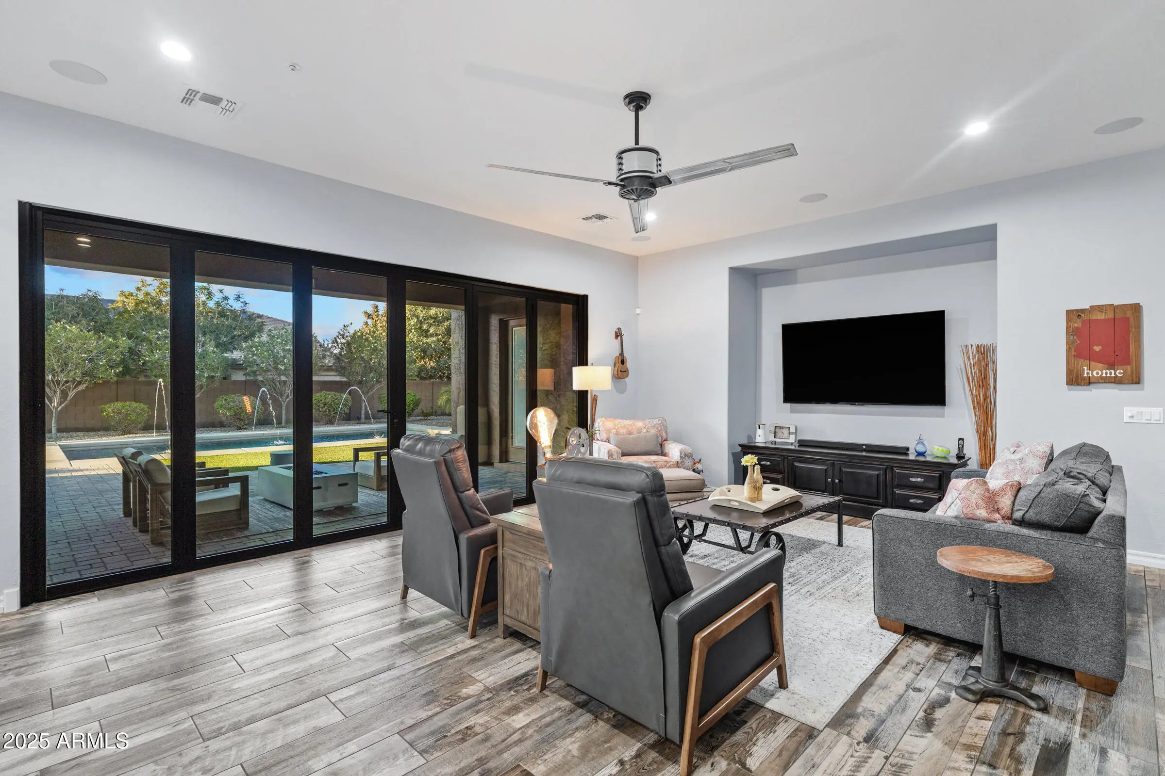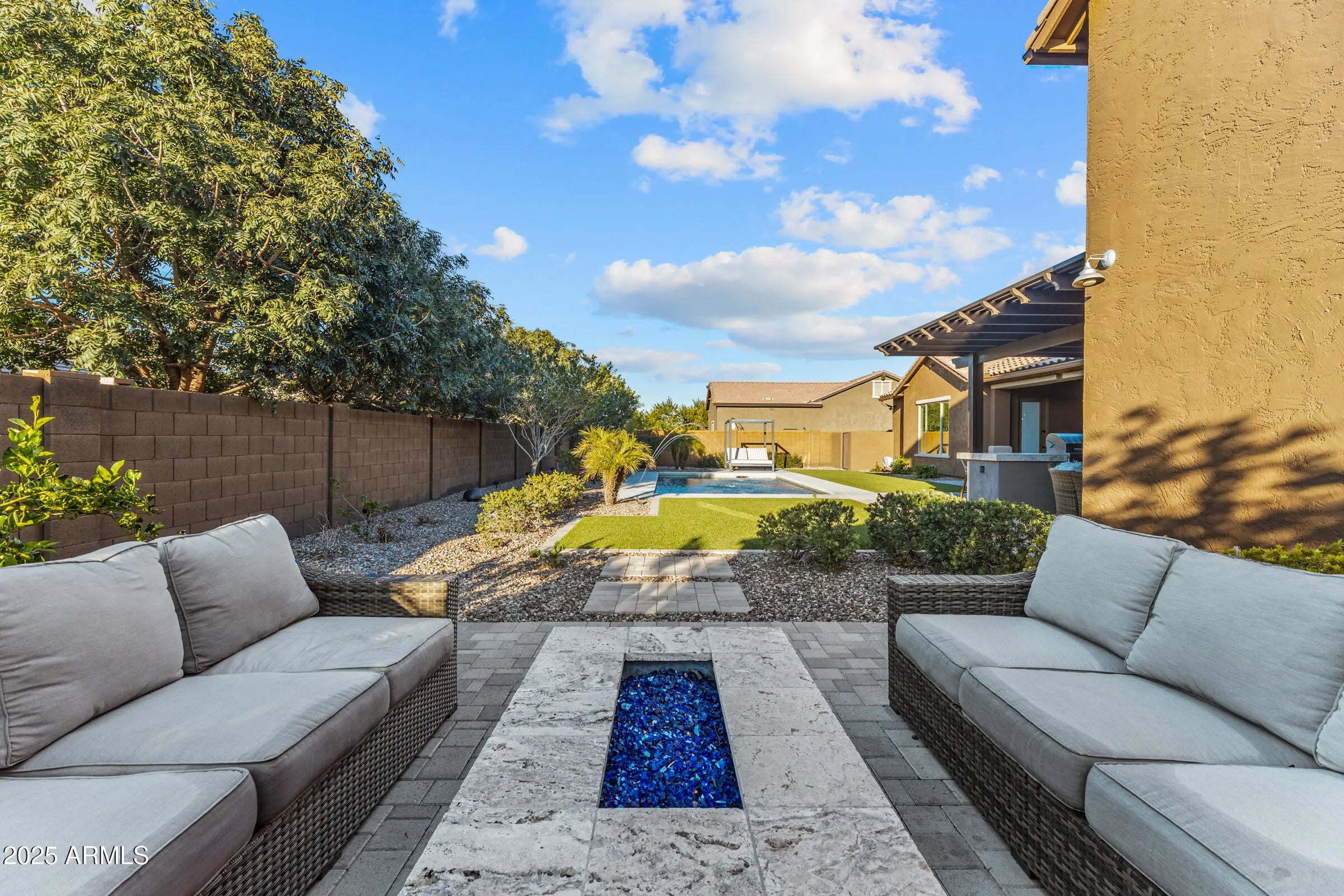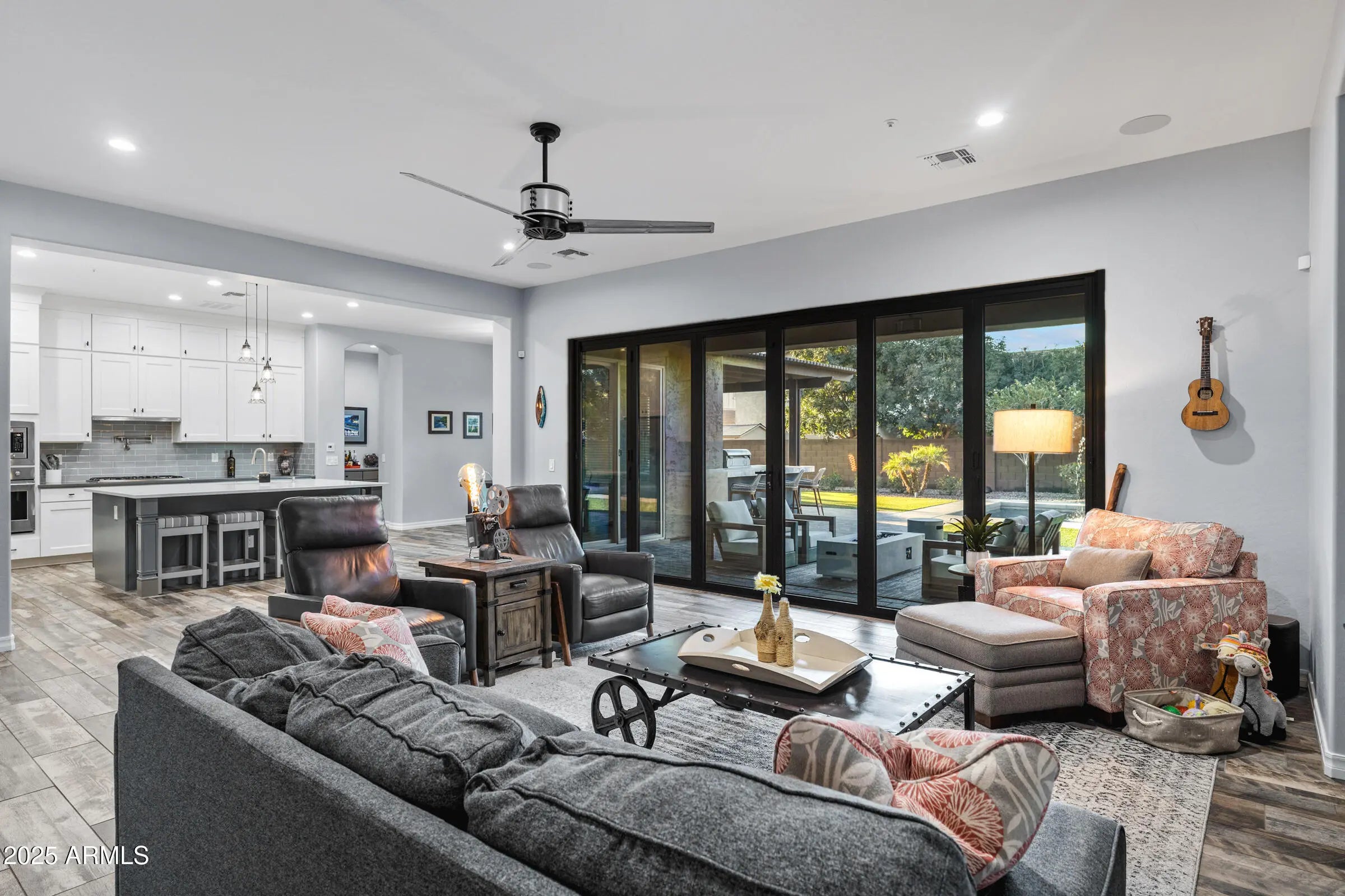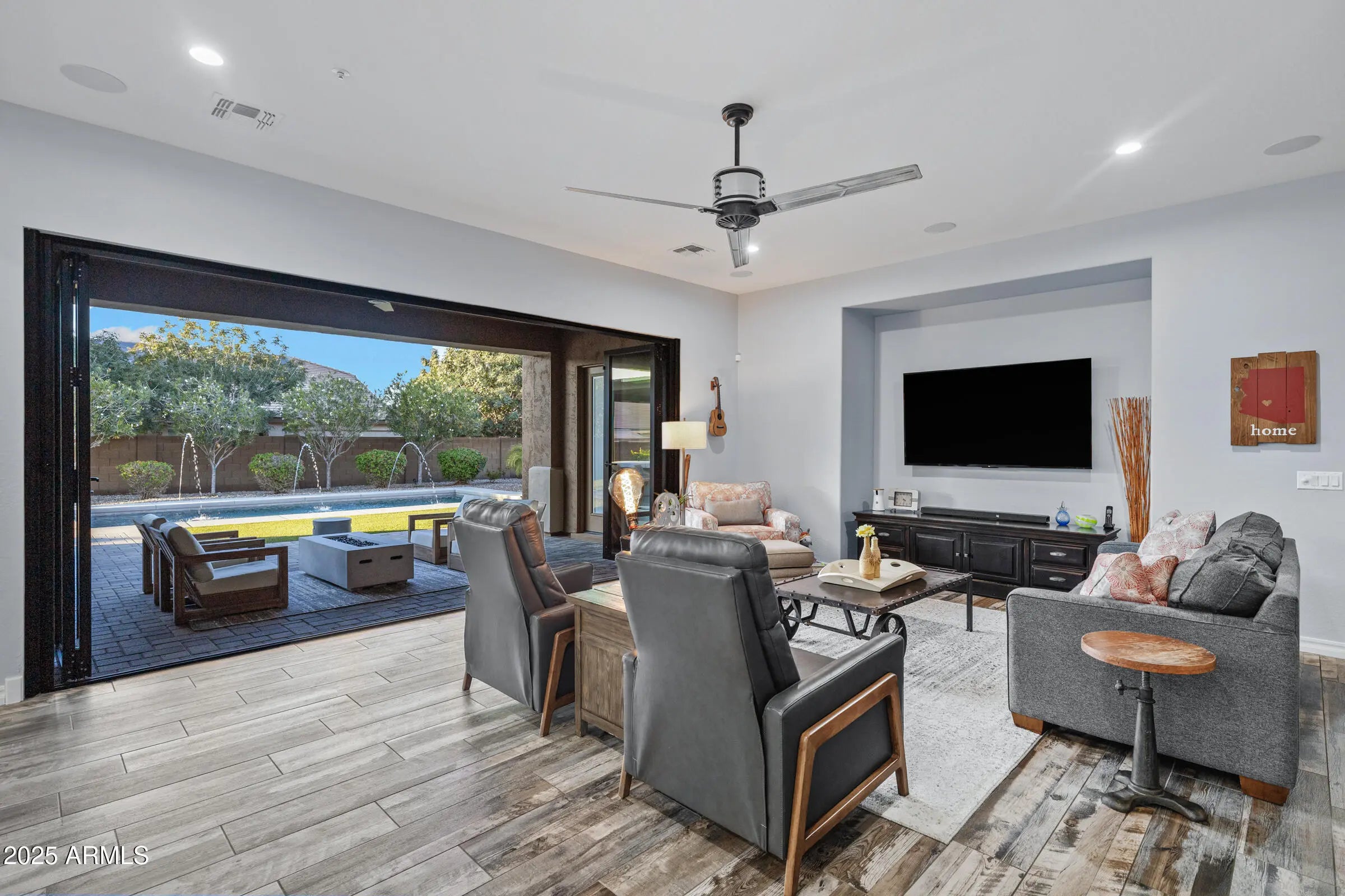 Fantastic single-level home packed with upgrades! Inside you'll find 4 bedrooms, den, 8'interior doors, and a gorgeous kitchen with to-the-ceiling cabinets, quartz counters, upgraded appliances and farm sink. Custom stacking doors create a dramatic indoor-outdoor flow. The backyard features a built-in BBQ, beautiful pool surrounded by turf, outdoor fireplace and firepit, shaded areas perfect for entertaining. A convenient interior bath opens to the backyard. Completing the home are the 24'x52' AC RV garage w/mezzanine loft and an additional 2-car garage with epoxy floors and built-ins. Oh, and year-round holiday lighting in all colors-no ladders, just press a button! It's time to grab your things and get over quick-this is a good one!