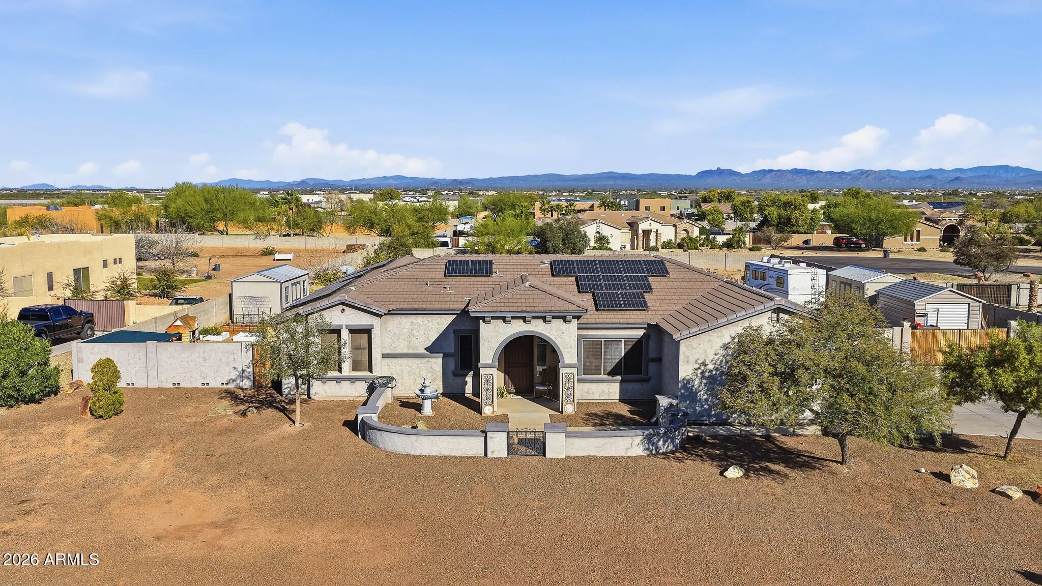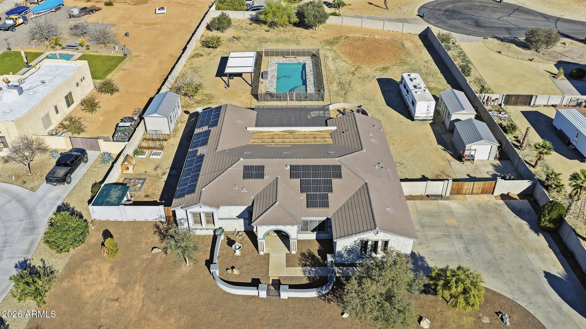 A rare opportunity to own the perfect blend of space, functionality, and modern comfort—ready to sell now! Situated on a full acre, this expansive 5-bedroom, 4-bath home offers over 3,155 sq. ft. of flexible living space ideal for multigenerational living, guests, or working from home. The layout includes two primary suites (or a private guest suite with its own entrance), Jack-and-Jill bedrooms, and a dedicated office or formal dining room. The heart of the home is the spacious kitchen featuring granite countertops, a cooktop, double ovens, a walk-in pantry, and abundant counter space—perfect for entertaining and everyday living. contd.. The open floor plan flows seamlessly into the family and great rooms, anchored by a beautiful stone fireplace that creates a warm, inviting atmosphere. Step outside to your own private backyard retreat with a stunning pool, powered ramada, and ample space for outdoor dining, entertaining, or simply relaxing while enjoying peaceful views. Owned solar adds both efficiency and long-term savings. A dream setup for RV owners, hobbyists, and car enthusiasts: The 3-car garage is plumbed for a shop sink with hot and cold water and waste, and includes a 50-amp outlet for RV or EV charging. The backyard features a plumbed RV dump station, along with an RV gate, RV parking, slab parking for additional vehicles, and a separate workshopideal for storage, projects, or toys. Homes with this level of space, utility, and flexibility are raredon't miss your opportunity to make this one yours.