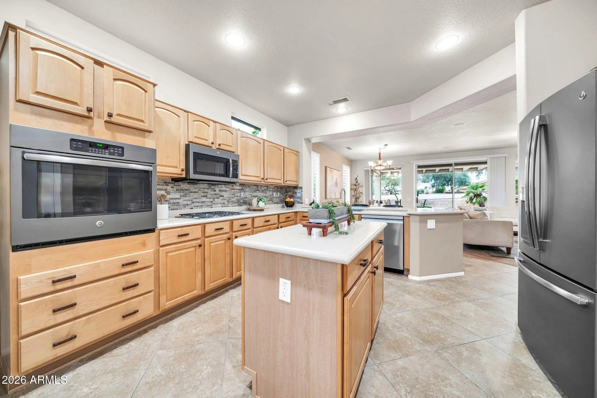 Enjoy 2 bedrooms + den, 2 baths, and a 2.5-car garage with golf cart bay—all designed for comfort and convenience. Set on the Granite Falls North Course, this home offers expansive views and unforgettable sunsets. Inside, the kitchen impresses with Corian counters, stainless appliances, and a gas cooktop. The family room features a cozy electric fireplace, while the private den adds flexibility. The primary suite bathroom pampers with dual sinks, a walk-in shower, and a soaking tub. Extras include washer/dryer, garage cabinets and an expanded patio with built-in BBQ—perfect for entertaining or relaxing under Arizona skies. Move-in ready and waiting for you! Staged Furniture available for sale!!
