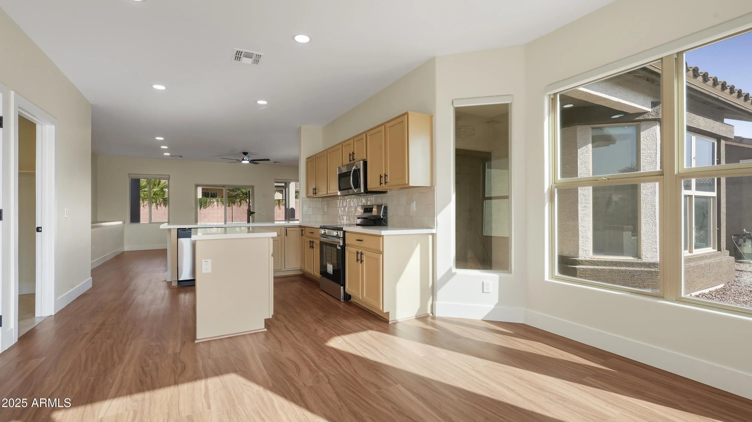 Price Drop!! Beautiful REMODELED Daybreak floor plan, 2B/2B + den. Major interior changes w/ contemporary style! Your new kitchen has quartz countertops w/island, beautiful tile backsplash, new sink, disposal, refinished cabinets and All NEW stainless-steel appliances. Family room redesigned w/ single shelf for TV or decor. New LED can light fixtures in every room and new ceiling fans. Exterior and Interior paint throughout. Inside walls refinished to a smooth, modern finish in a soft neutral palate plus new baseboards, trim and door hardware. New remote window blinds. Primary en-suite makeover w/ stunning tiled shower and doors, quartz counter and fixtures. Guest bath also updated. Newer HVAC. New carpet in bedrooms. See full Upgrade List in Documents Tab above Solera is a 55+ Resort-style Community with 18-hole Championship Golf, Clubhouse, Heated Pools, Fitness Center, Pickleball, Tennis and more. Pick up a copy of the Dreamcatcher community magazine when you visit with events and activities. Welcome Home ~