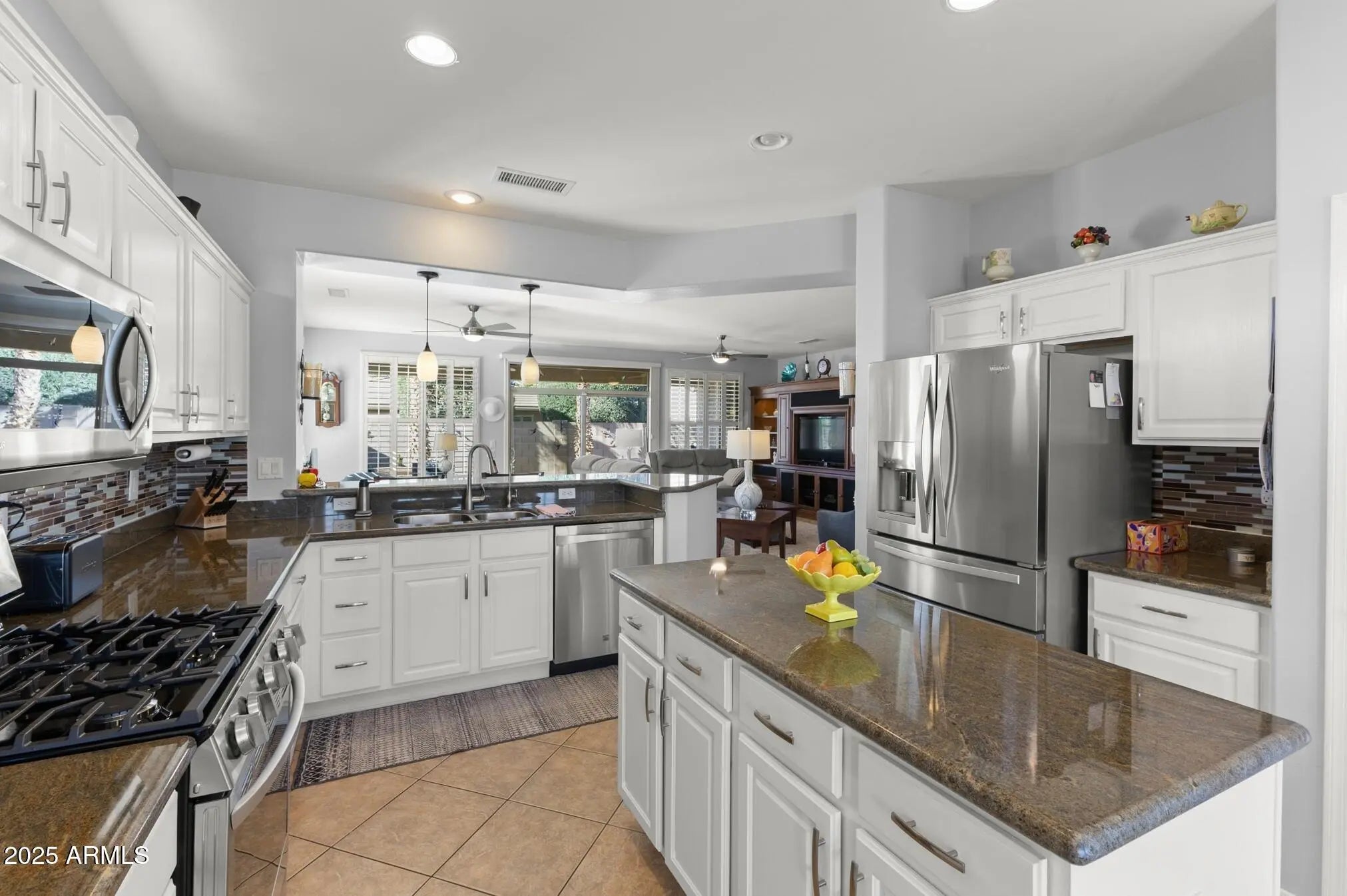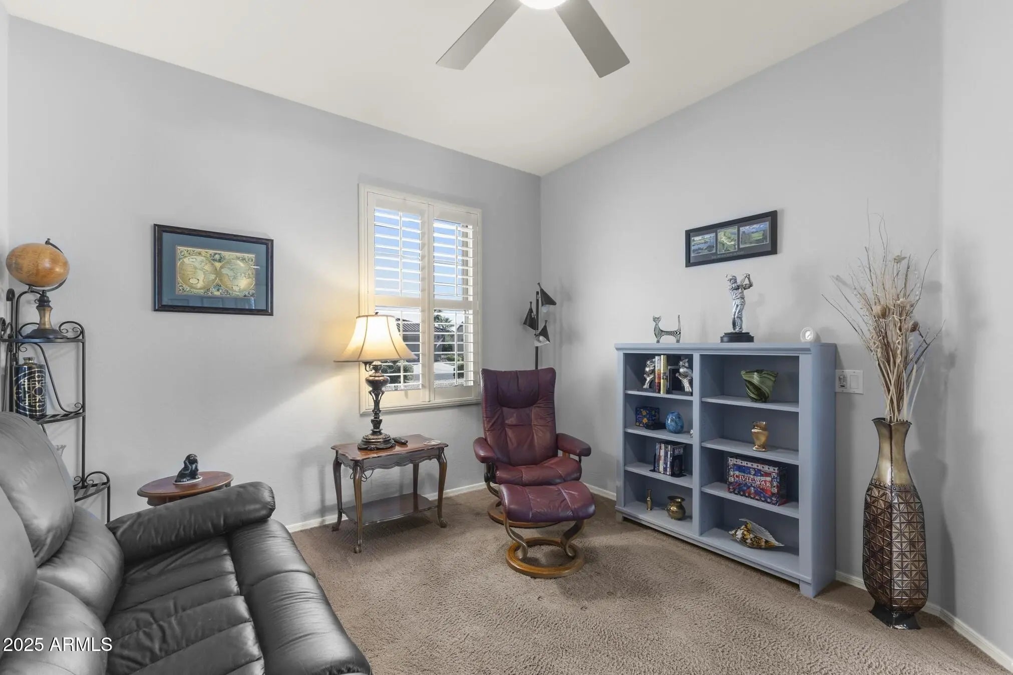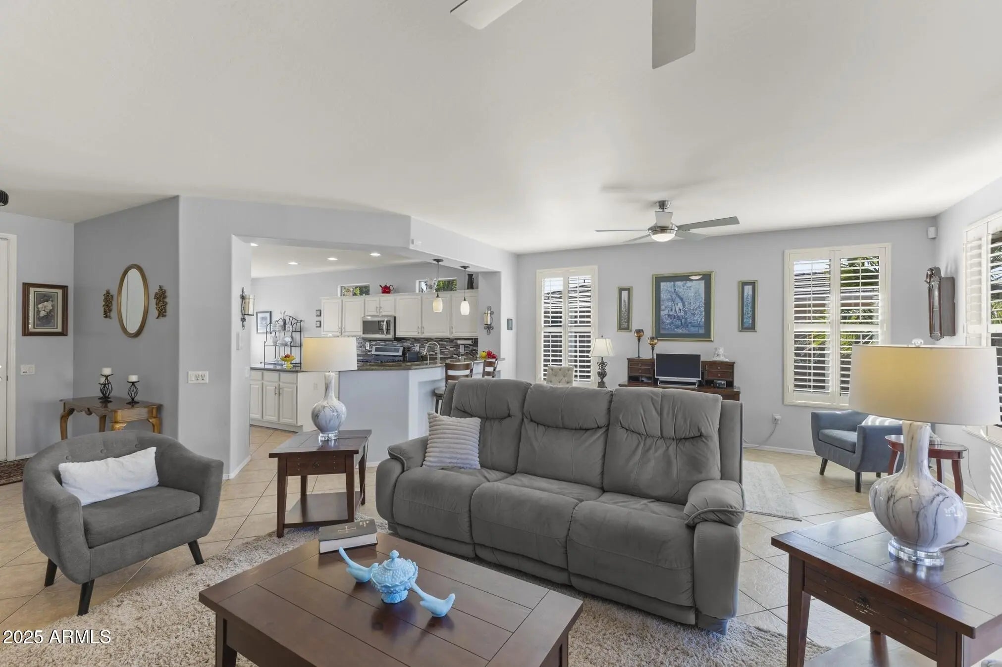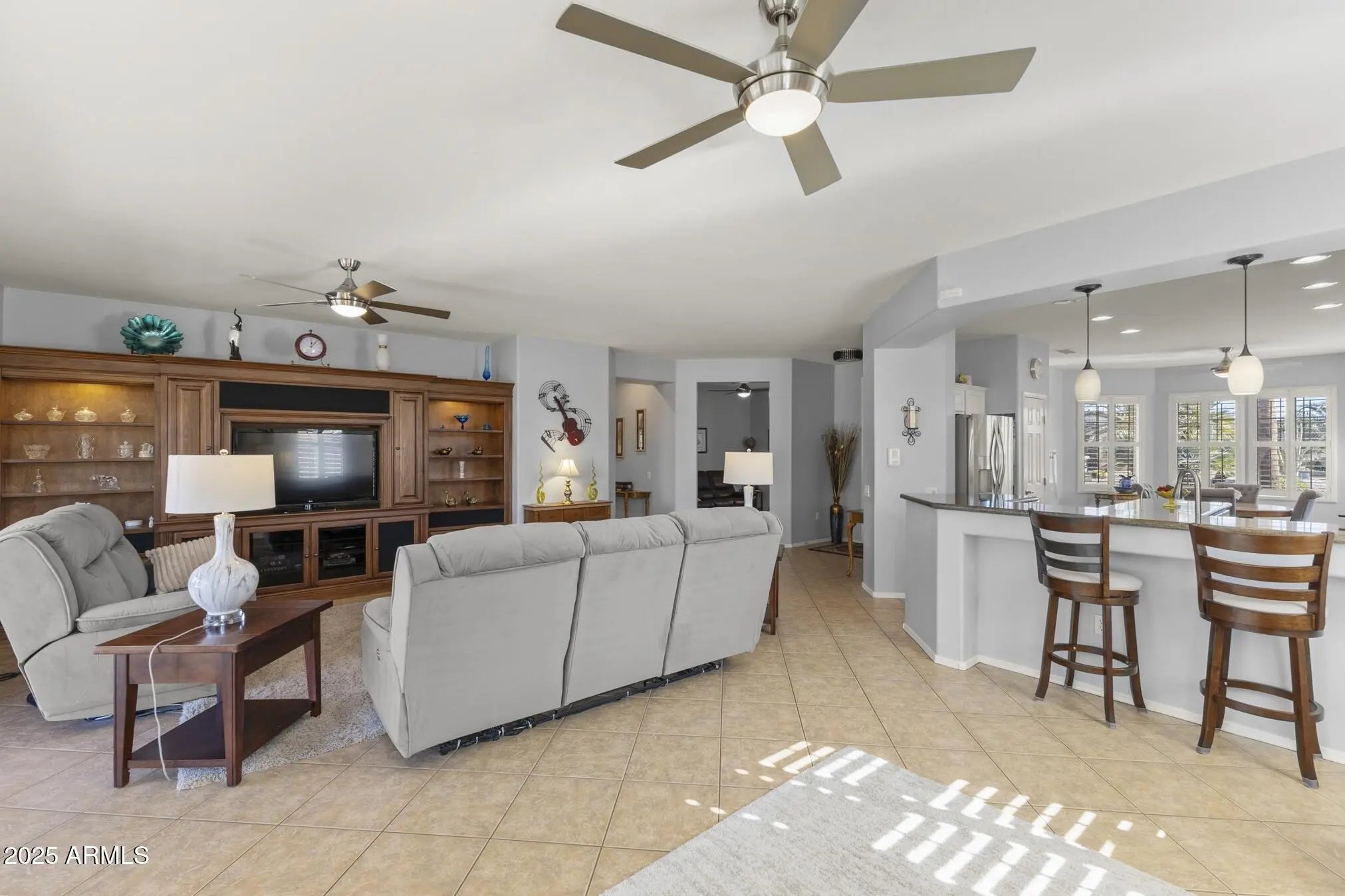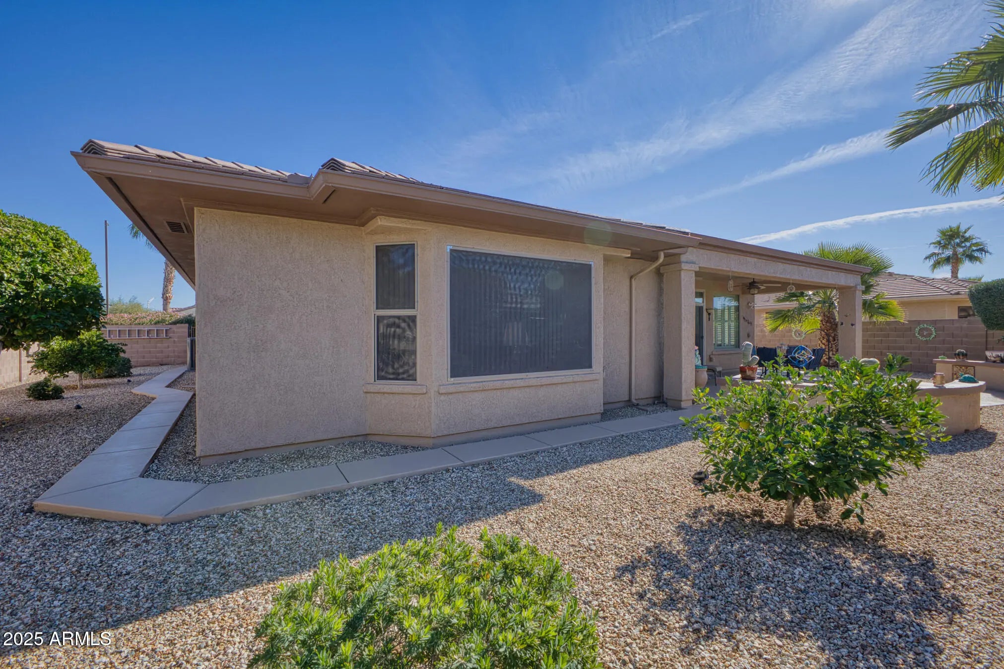 TURN-KEY GEM HAS STYLE & SPACE! This 2 bedroom, 2 bath Sierra is move-in ready. A bright, spacious kitchen features white cabinets, granite counters, glass-tile backsplash, stainless appliances, a bay-window in the breakfast nook, a large island, deep undermount sink, brushed-nickel faucet and an R/O system. A custom built-in media wall in the Great Room, plantation shutters and 16'' diagonal tile adds extra flair. The oversized primary suite with bay window is a perfect retreat. The updated bath features tiled shower, quartz counters, dual undermount sinks, new faucets, and toilet. The updated guest bath has a quartz top, tiled shower/tub combo, glass door, and new fixtures. Carpeted bedrooms and den, newer interior paint, and LED lighting throughout add comfort and style. Additional Upgrades include: Energy-efficient HVAC (2022) Newer gas water heater Whole-home water softener Inside laundry with cabinets, hard surface countertop, and stainless utility sink Extended 2-car garage with epoxy floor, newly painted walls, and painted cabinets for storage Coated driveway Security door Central alarm system Gutters & Downspouts( Extended covered patio, coated surface and ceiling fans, perfect for relaxing or entertaining Block-walled yard offers plenty of privacy LED landscape lighting PVC irrigation system Lemon and orange trees