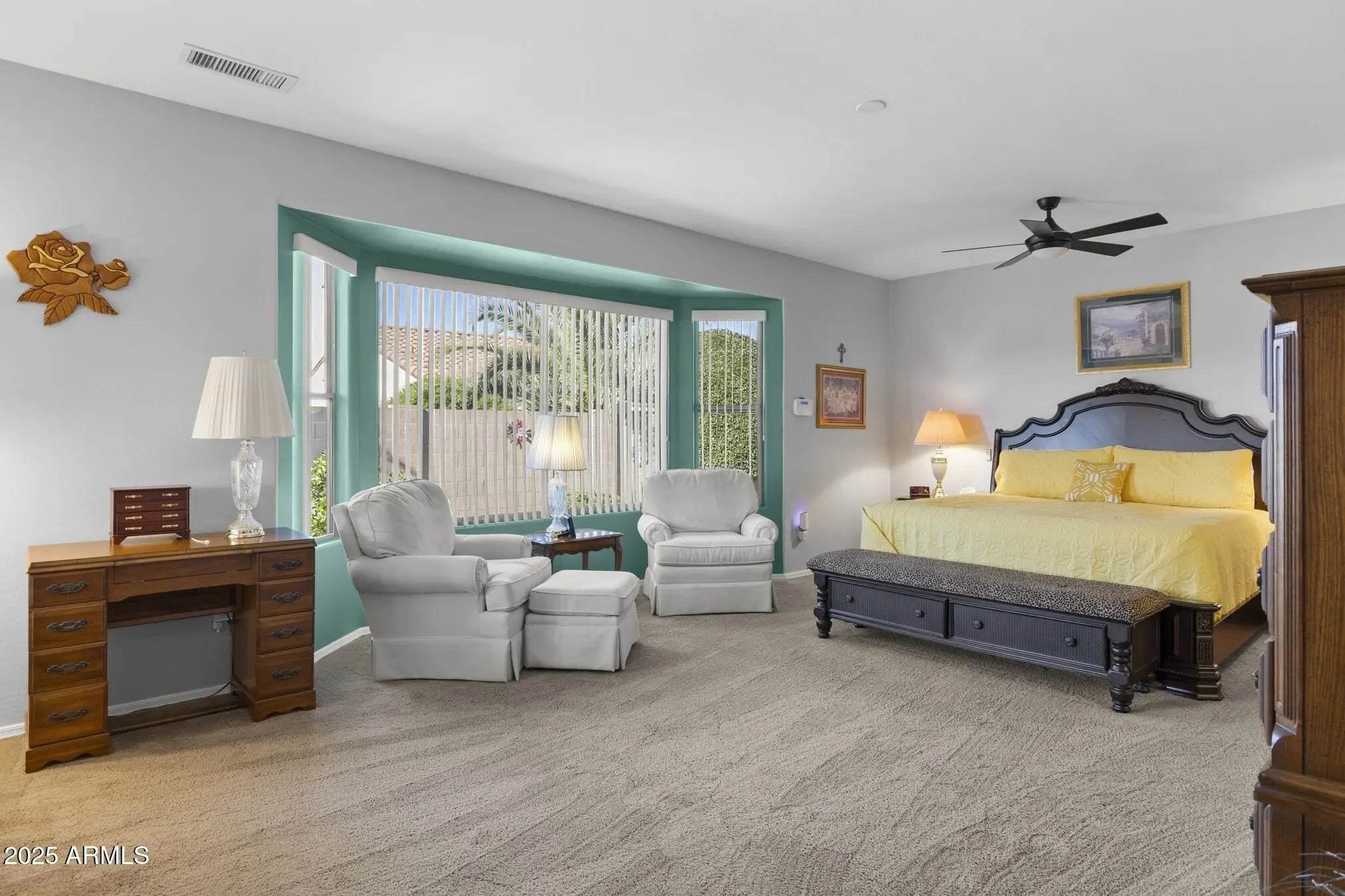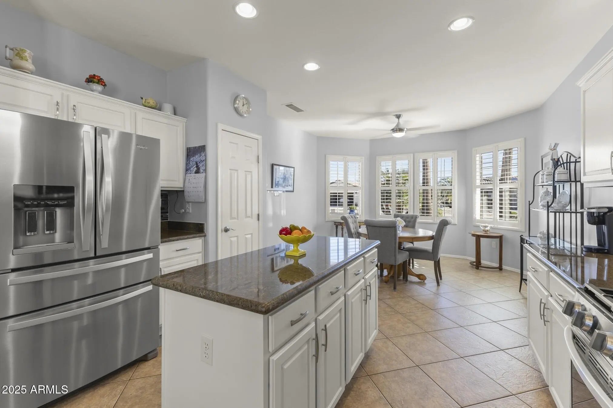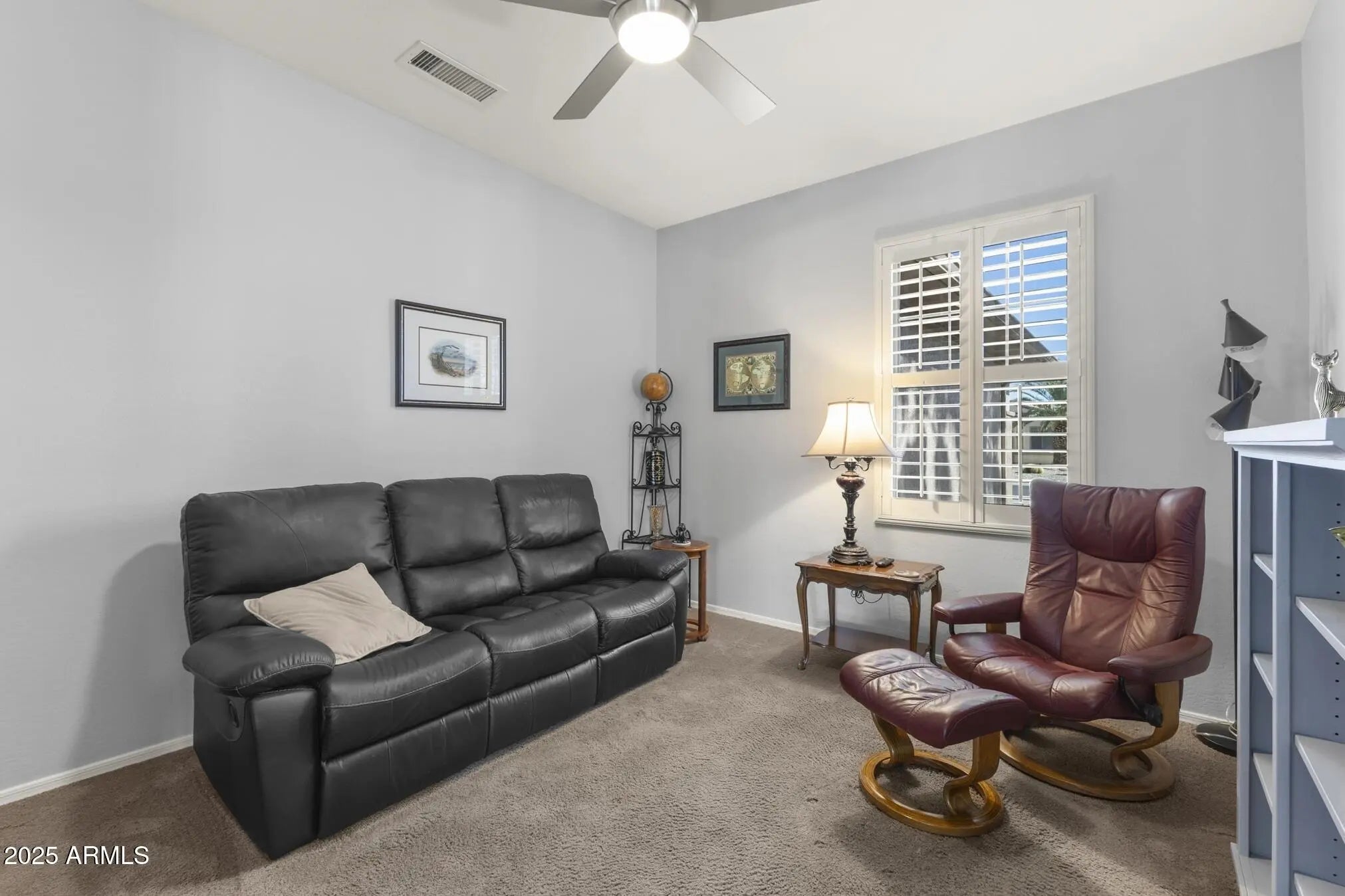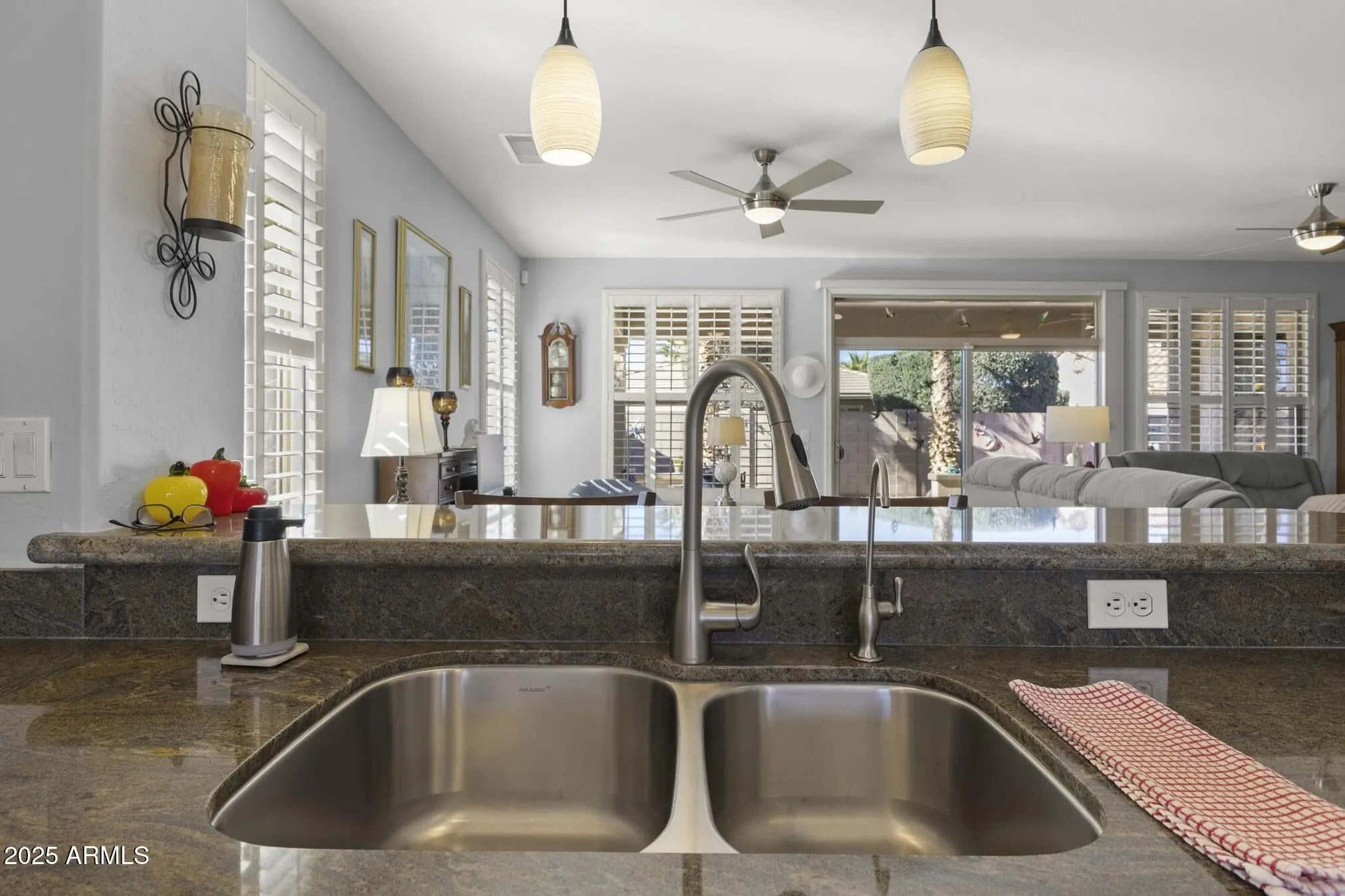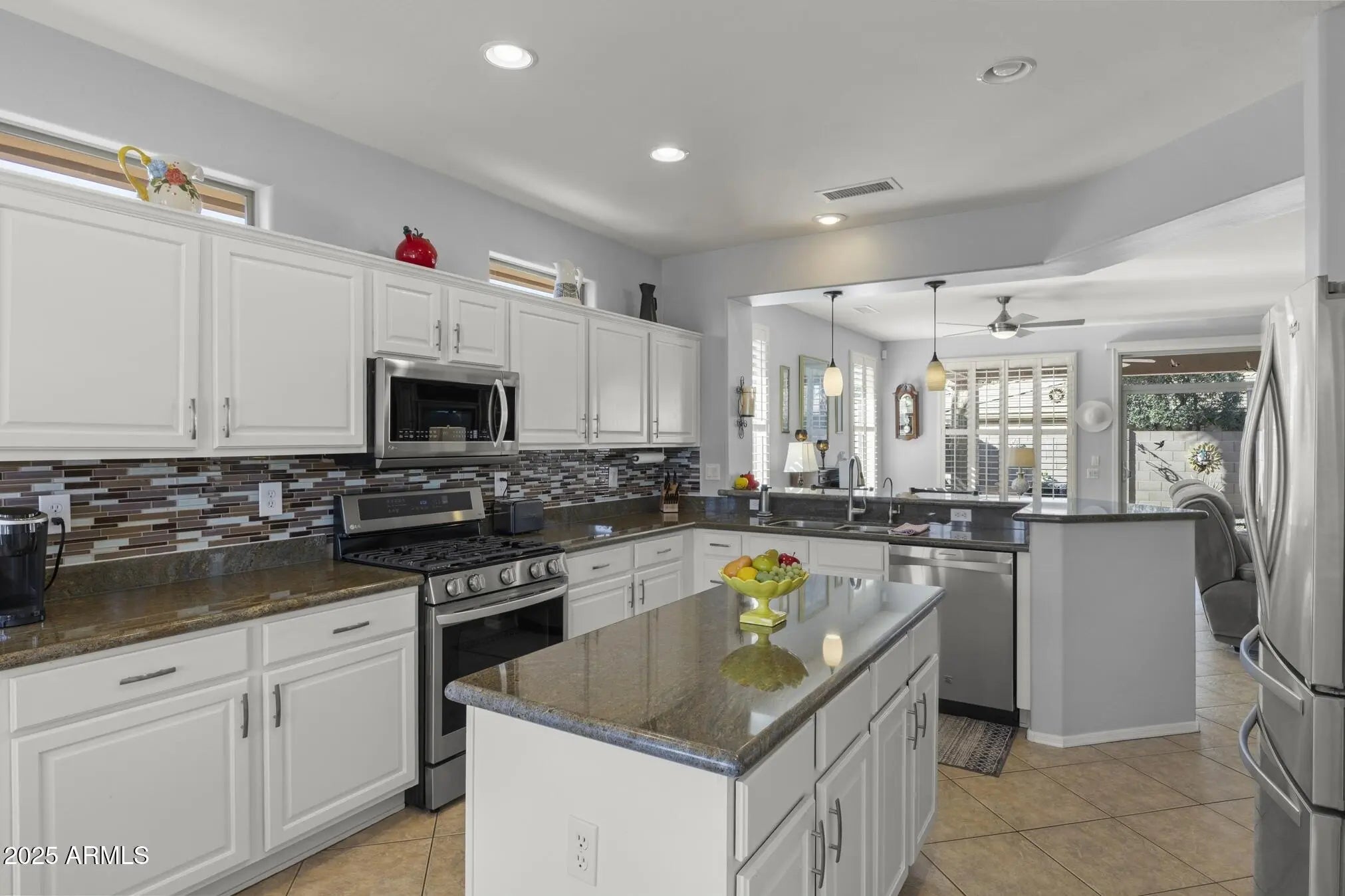 TURN-KEY GEM HAS STYLE & SPACE! This 2 bedroom, 2 bath Sierra is move-in ready. A bright, spacious kitchen features white cabinets, granite counters, glass-tile backsplash, stainless appliances, a bay-window in the breakfast nook, a large island, deep undermount sink, brushed-nickel faucet and an R/O system. A custom built-in media wall in the Great Room, plantation shutters and 16'' diagonal tile adds extra flair. The oversized primary suite with bay window is a perfect retreat. The updated bath features tiled shower, quartz counters, dual undermount sinks, new faucets, and toilet. The updated guest bath has a quartz top, tiled shower/tub combo, glass door, and new fixtures. Carpeted bedrooms and den, newer interior paint, and LED lighting throughout add comfort and style. Additional Upgrades include: Energy-efficient HVAC (2022) Newer gas water heater Whole-home water softener Inside laundry with cabinets, hard surface countertop, and stainless utility sink Extended 2-car garage with epoxy floor, newly painted walls, and painted cabinets for storage Coated driveway Security door Central alarm system Gutters & Downspouts( Extended covered patio, coated surface and ceiling fans, perfect for relaxing or entertaining Block-walled yard offers plenty of privacy LED landscape lighting PVC irrigation system Lemon and orange trees