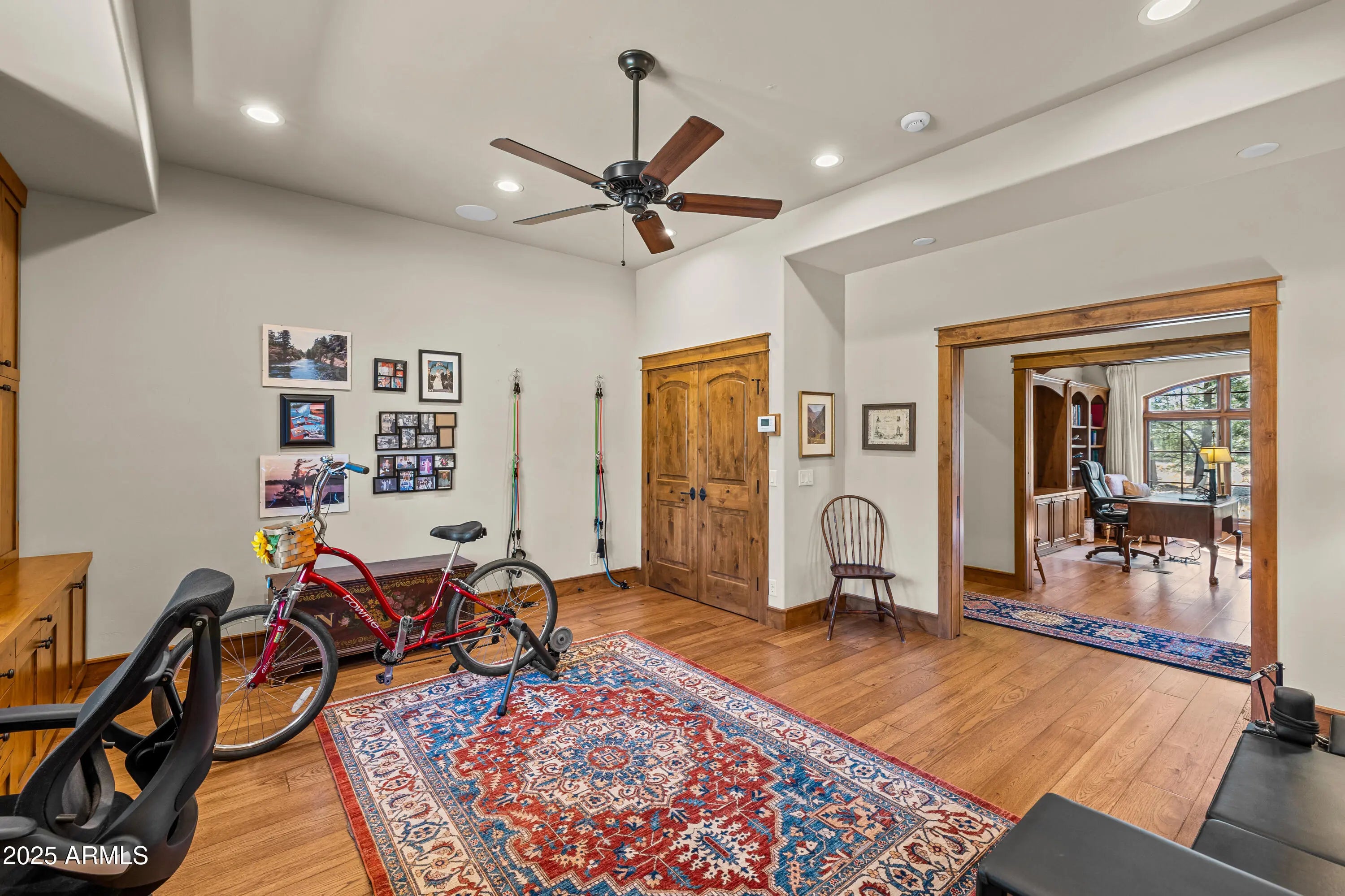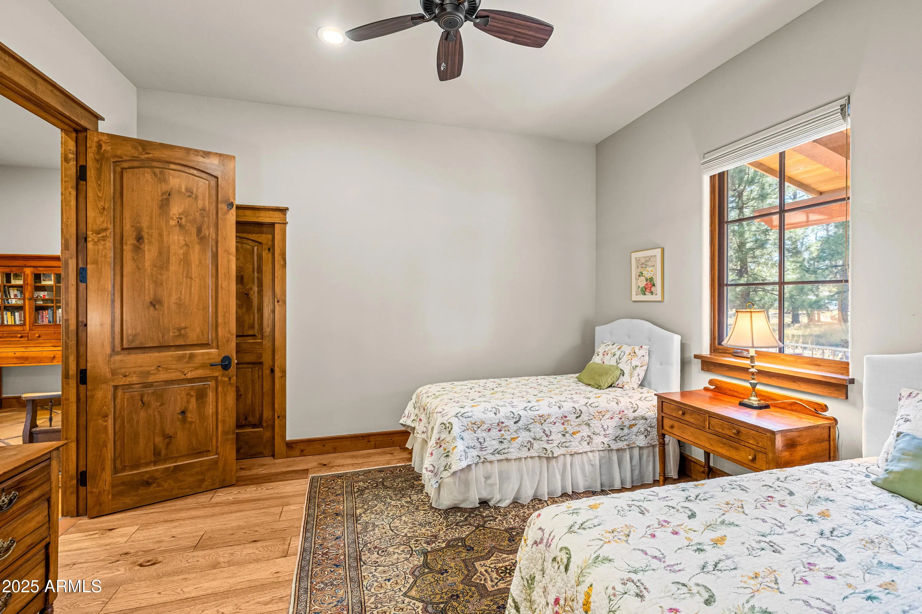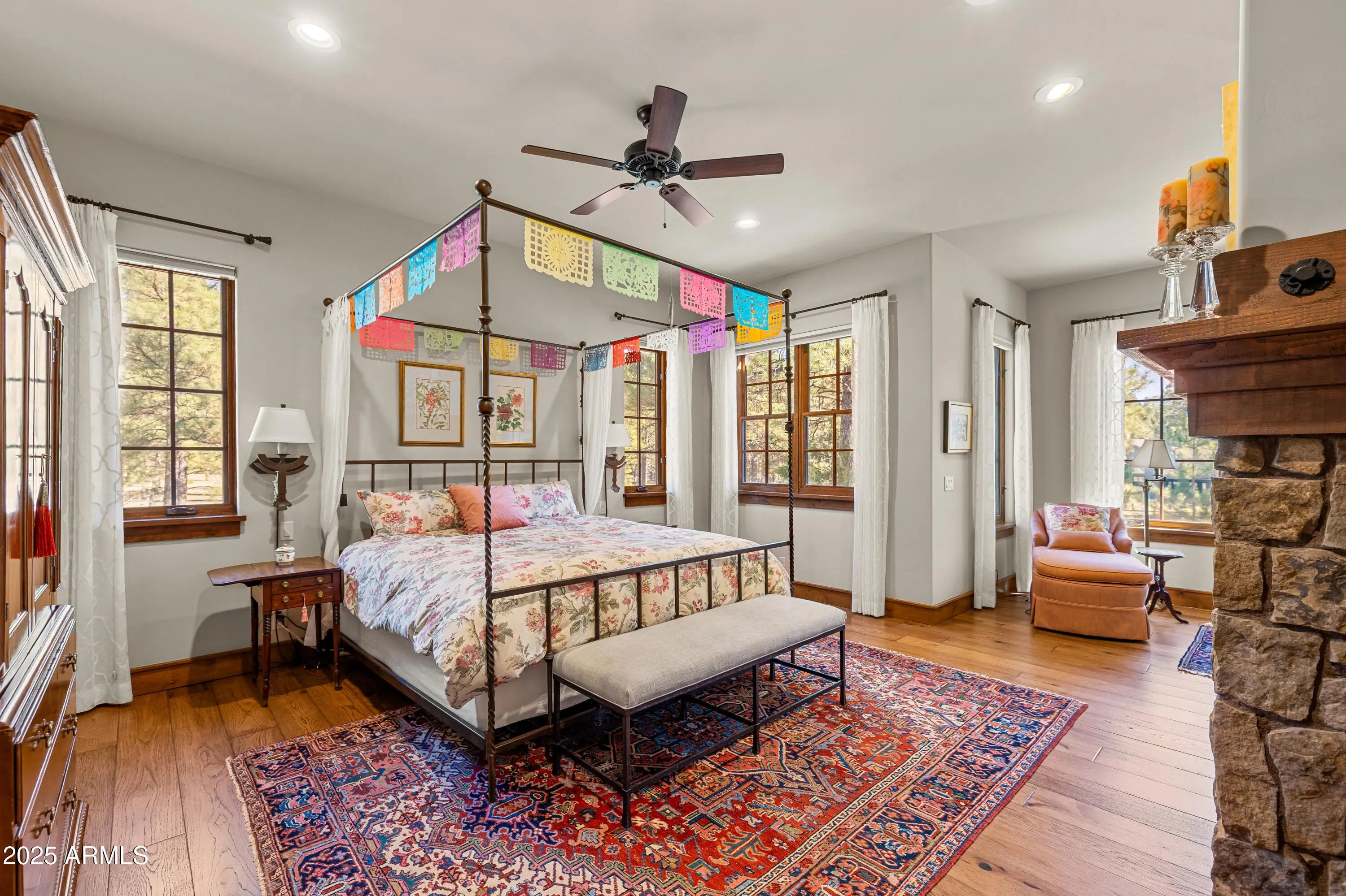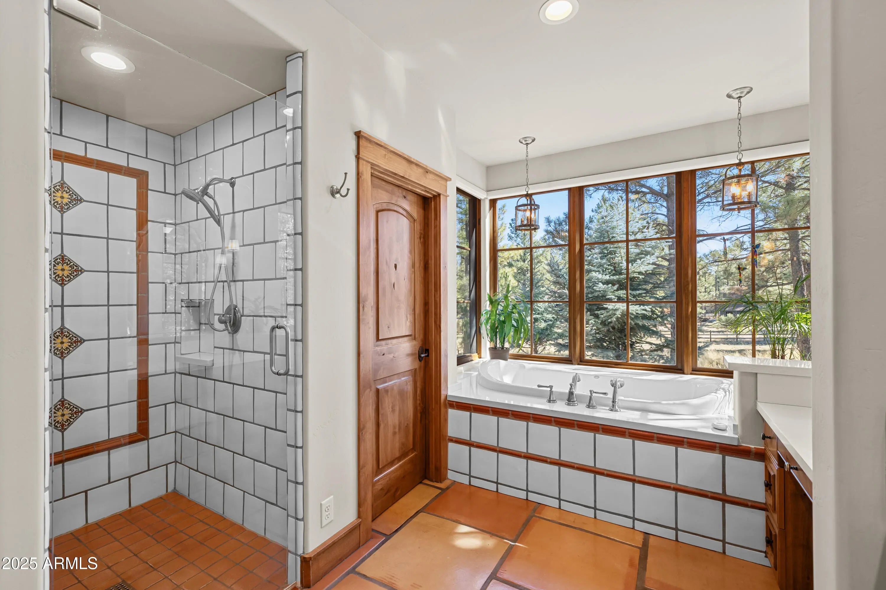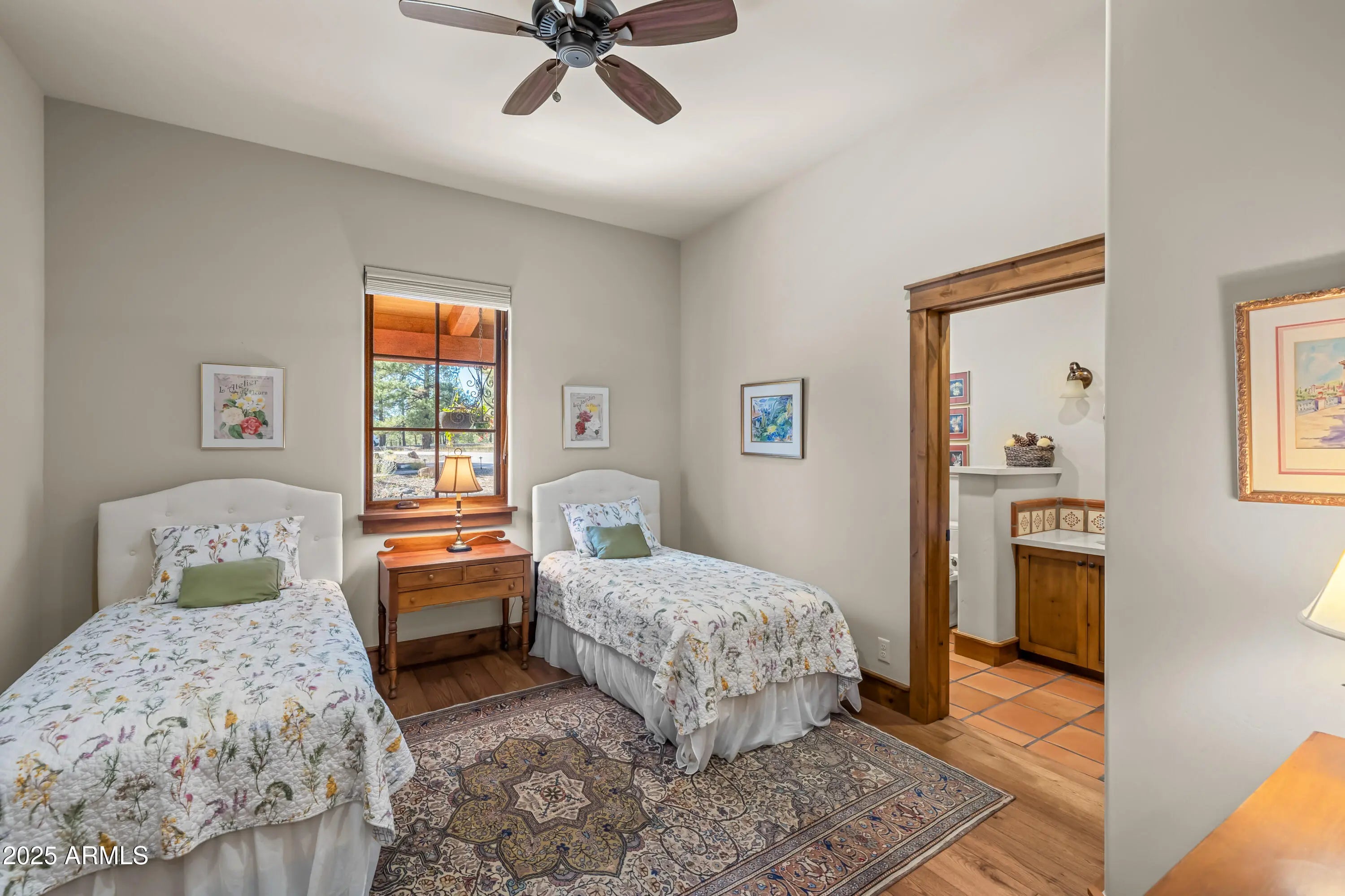 When the owners first wandered across this 4.4-acre homesite in Lockett Ranches, they felt the land speak—its sweeping pines, its quiet strength, its breathtaking beauty. Moved by that moment, they shared their vision with architect Christopher Alexander and together they shaped a home that rises from the landscape like a piece of art—luxurious yet grounded, rustic yet refined, infused with the soul of the Southwest. 550 Hattie Greene is a uniquely stunning single-level home on 4.24 forested and meadowed acres. Built by Flagstaff premier custom home builder, Harmony Builders, it is a blend of rustic luxury and traditional southwest charm. With 4 bedrooms, 4 bathrooms, radiant heat, a 3-car garage and a shared, deep-aquifer well, it's a magnificent home, mountain retreat or equestrian estate. A facade of malpais stone, bold timber beams, and vivid red windows welcome you with a presence both timeless and unique, even among the fine custom homes that surround it. Step into the great room and the outside pours in: colorful gardens, tall pines, light spilling generously through a wall of glass. Every detail throughout the home reveals the careful hand of an artisan - wide beam wood and terra-cotta floors, sculptural millwork, dramatic ceilings, gentle archways, and Southwest tilework that brings warmth, texture, and story to each room. At the heart of the home, the kitchen is warm and inviting,with its central island and breakfast nook, custom southwest tile accents and a stove with a rock-surround vent hood that stands as a beautiful tribute to the land that inspired it all. The spacious primary suite is a sanctuary where light dapples across a peaceful sitting area. Two additional ensuite bedrooms offer comfort and privacy for family and friends. Mirroring offices with built-ins and large windows are peaceful havens for work, exercise, yoga or art. One office is also designed as a fourth bedroom. Perfect. On the private back patio, the forest opens wide. Here, beyond vibrant gardens, the pines whisper in the mountain air. Mountains rise in the distance, their silhouettes shifting with each passing hour -blue at dawn, golden by late afternoon, and violet as evening settles in. This outdoor haven is a place to breathe deeply, relax, and entertain while deer and elk wander quietly through. It is a space where home and the land meet in perfect harmony, offering quiet mornings, star-drenched nights, and an ever-present sense of peace.