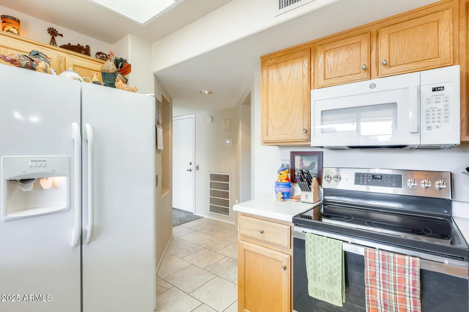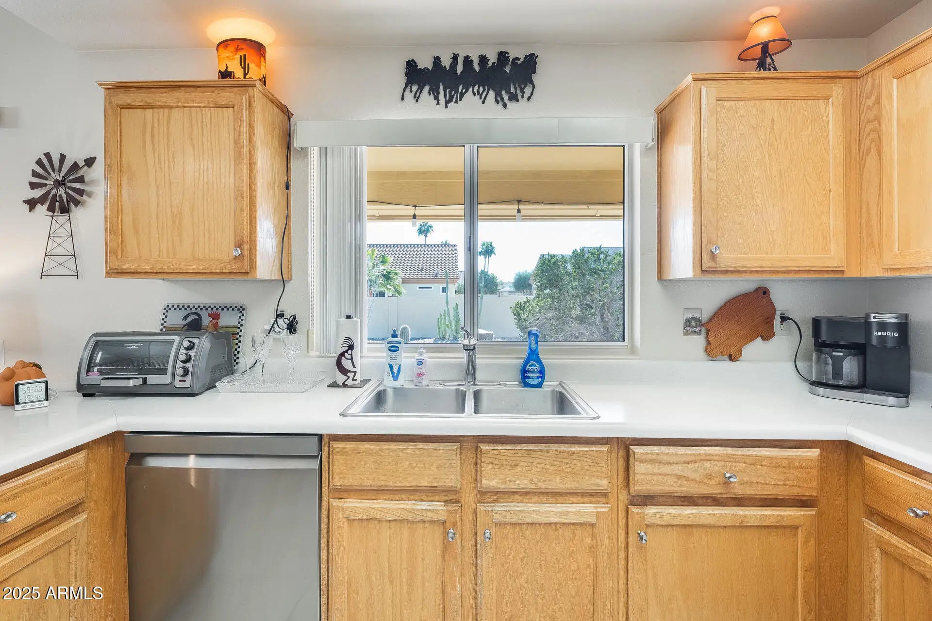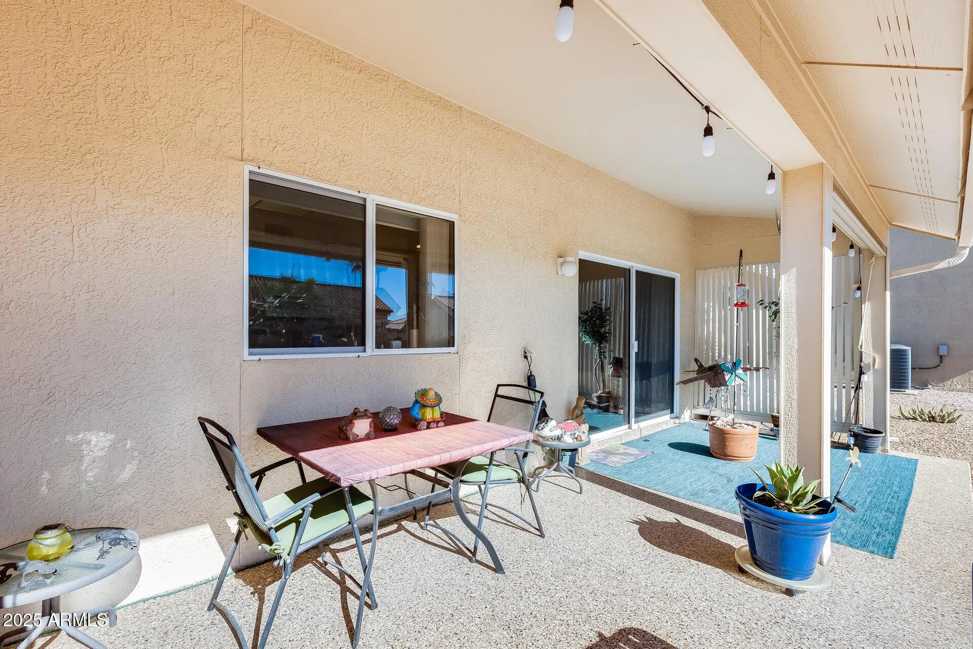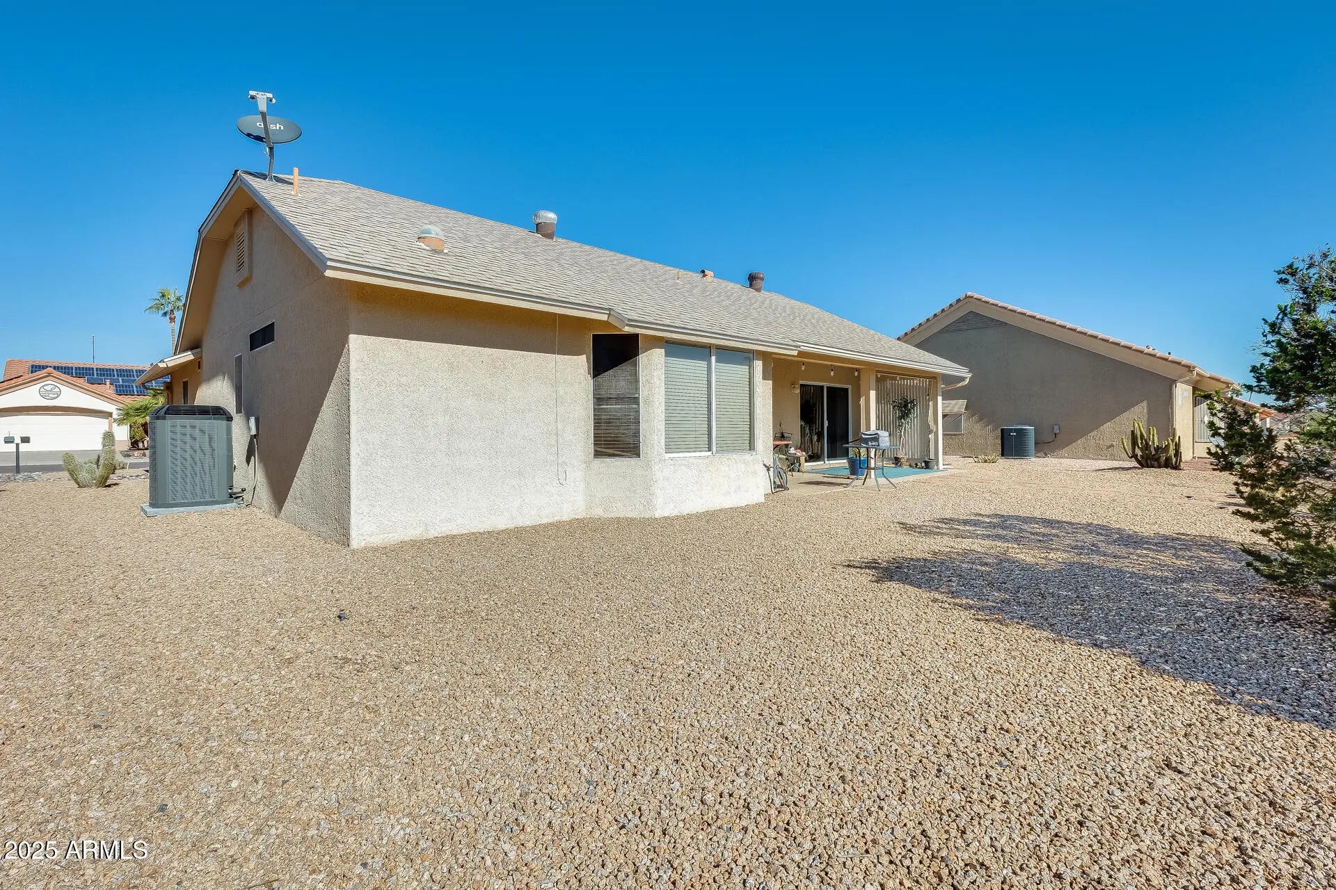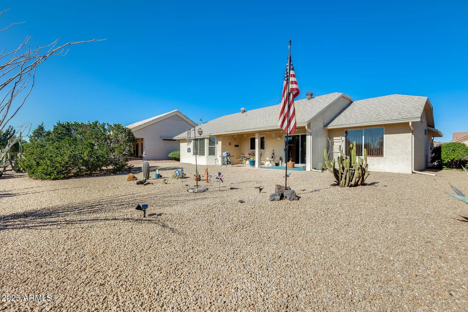 Welcome to this impeccably cared-for home offering incredible value and peace of mind with big-ticket updates already completed—including a 2014 roof, 2021 HVAC system, and a brand-new 2024 garage door. The curb appeal shines with an epoxied driveway, low-maintenance desert landscaping, mature cactus, and a welcoming front entry. Step inside to a bright, inviting interior highlighted by vaulted ceilings, updated flooring, and abundant natural light. The front dining/living area features a large bay window overlooking the front yard, creating a warm and open feel perfect for hosting or relaxing. The kitchen offers solid cabinetry, tile flooring, a a gas range, built-in microwave, and easy access to the main living area. The spacious living room opens directly to the back patio through a large sliding door, making indoor/outdoor living effortless. All bedrooms are generously sized, with the primary suite offering updated flooring, a large closet, and plenty of natural light. The guest bedrooms are perfect for visitors, crafts, or an office setup. Bathrooms are clean and well maintained, with walk-in shower access in the primary bath. Step outside to a huge, private backyard with beautiful desert landscaping, paver walkways, and an extended covered patioideal for enjoying Arizona mornings and evenings. This oversized lot provides plenty of space without the upkeep.
