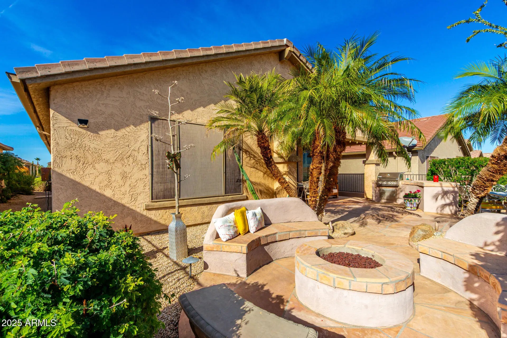 Live the lifestyle you've dreamed of in Solera at Johnson Ranch, a premier 55+ gated community! This 2bed, 2bath beauty features a kitchen with granite countertops SS appliances, RO system, and breakfast nook. The primary suite offers double sinks, a walk-in shower, and a spacious walk-in closet. Added touches include a water softener, shutters throughout and a garage with epoxy and built-in cabinets Enjoy AZ sunrises and mountain views from your east facing backyard with a built-in BBQ, firepit, water feature, lime tree, and extended flagstone patio overlooking the 15th tee box of San Tan Highlands Golf Club. Solera's resort amenities include heated pools and spa, fitness center, pickleball, community activities, and more!
