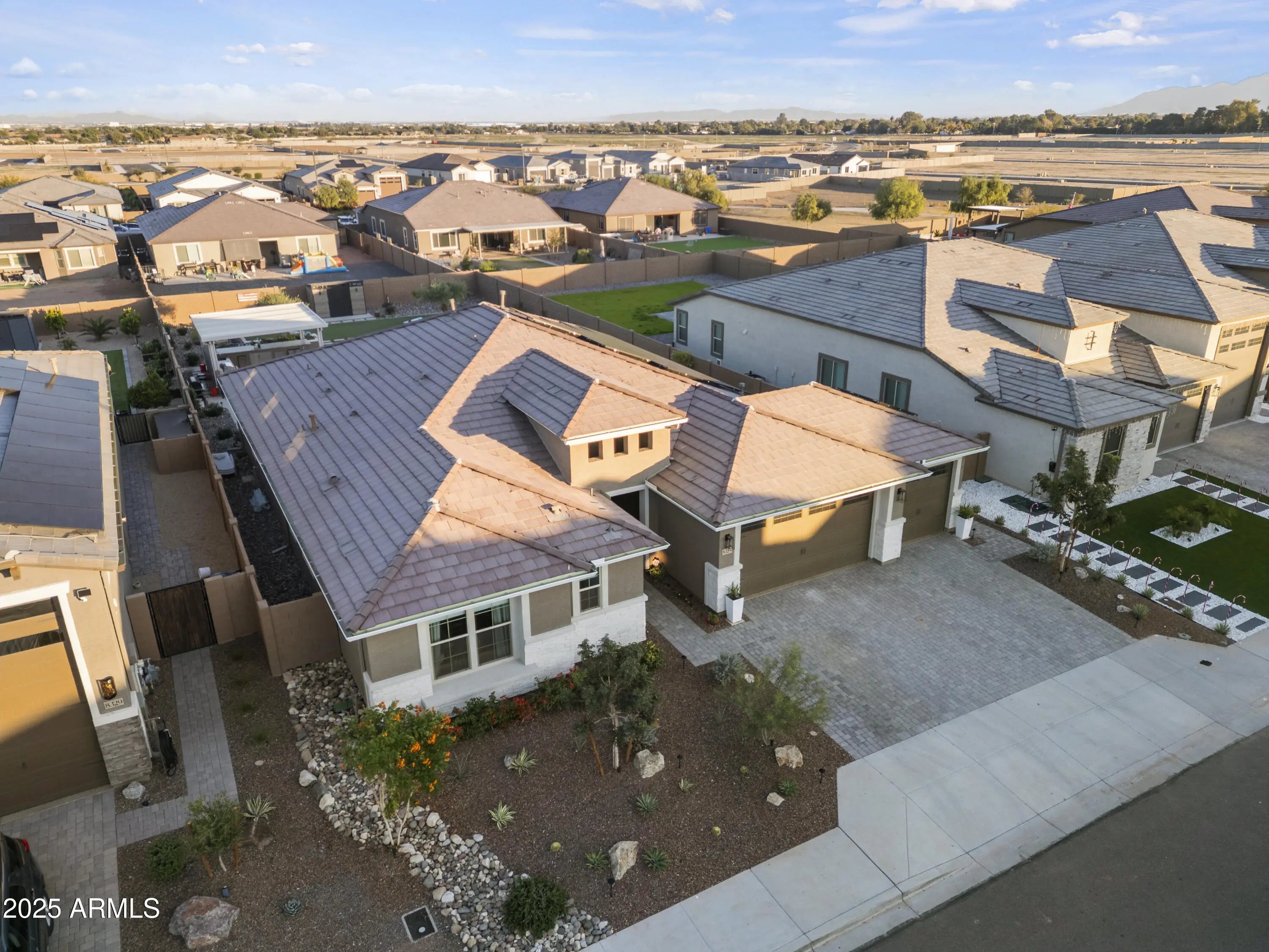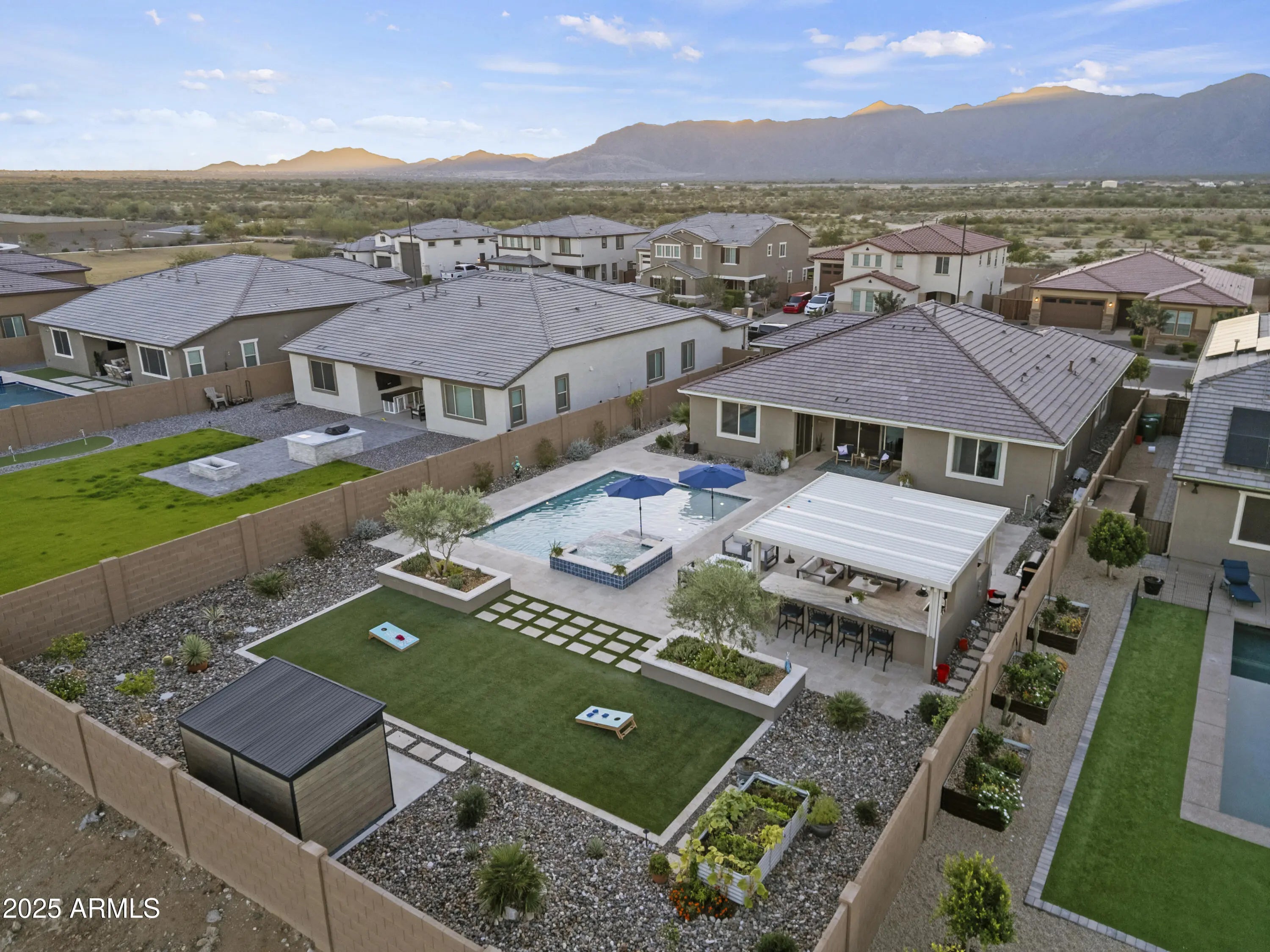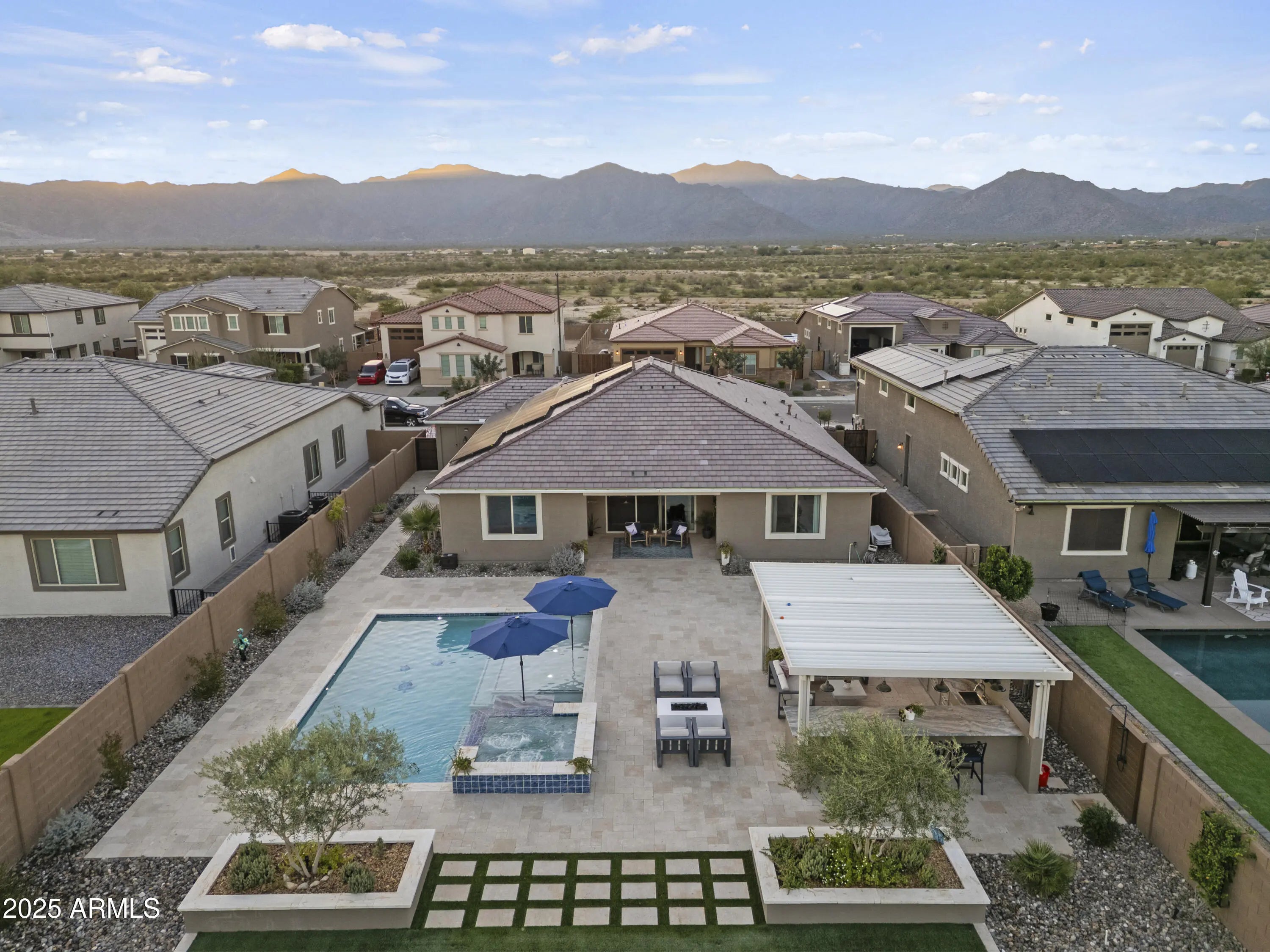 Welcome to this stunning, immaculately designed and maintained, craftsman-style single story home. Located in the desirable White Tank Foothills community in Waddell, Arizona. Built in 2023, this spacious 3-bedroom, 2.5-bath, 3 car garage home offers 2,516 sq. ft. of modern living on a generous 12,250 sq. ft. homesite. Located in a cul-de-sac, offering minimal traffic and enhanced privacy. A few steps away from the walking/biking trails. Step inside from the covered porch into the front entryway and enter a spacious open-concept floor plan. Discover a bright gathering room with windows with a beautiful backyard view, a stacked stone fireplace, and a casual social dry bar/game area. The chef's kitchen boasts stainless steel appliances, a large pantry, walk-thru coffee bar and ... ... ample counter spaceperfect for entertaining and large family dinners. The primary suite includes a luxurious tile and glass enclosed shower with a walk-in closet and linen storage shelving. Additional bedrooms and versatile Den provide flexible living options for guests, hobbies and a home office. Enjoy Arizona living at this impressive property with a stunning resort-style, east facing, backyard. Walk out through the stacked sliding glass doors and guide across the covered patio with misters that provide a relaxing mist and onto the backyard paved with Travertine. A sparkling Ozone pool with an oversized reef with bubblers, water table and a raised spa with a waterfall, welcomes you to a rejuvenating sensory experience. Entertain in your own outdoor covered BBQ Kitchen and keep the Chef cool with the built-in mister system in a conversation-friendly oasis. All including granite countertops, stainless steel sink, built-in light fixtures, ceiling fan, ice maker, a seated bar area, stainless steel storage pantry and refrigerator, gas fire pit, turf game area, desert scape plants, trees, a raised vegetable garden bed and built-in planters. The home also features energy-efficient solar, central air, and a front security screen door and side gate for peace of mind. A 3-car garage offers plenty of storage. Located near White Tank Mountain Regional Park, this property combines tranquility with convenience and luxury.