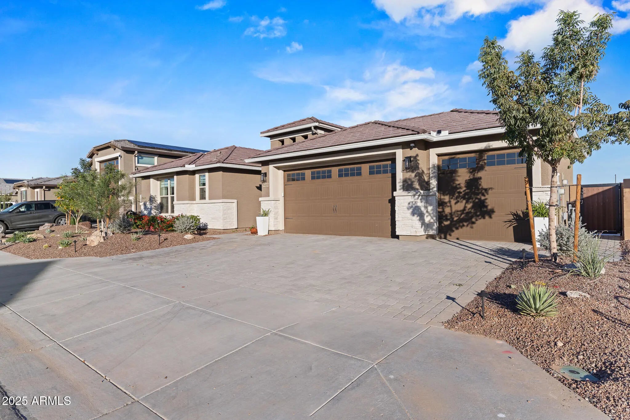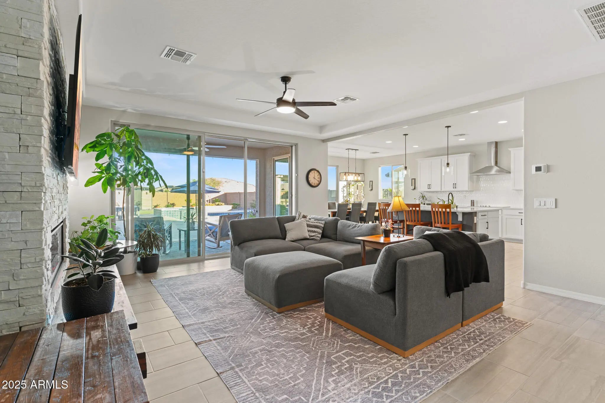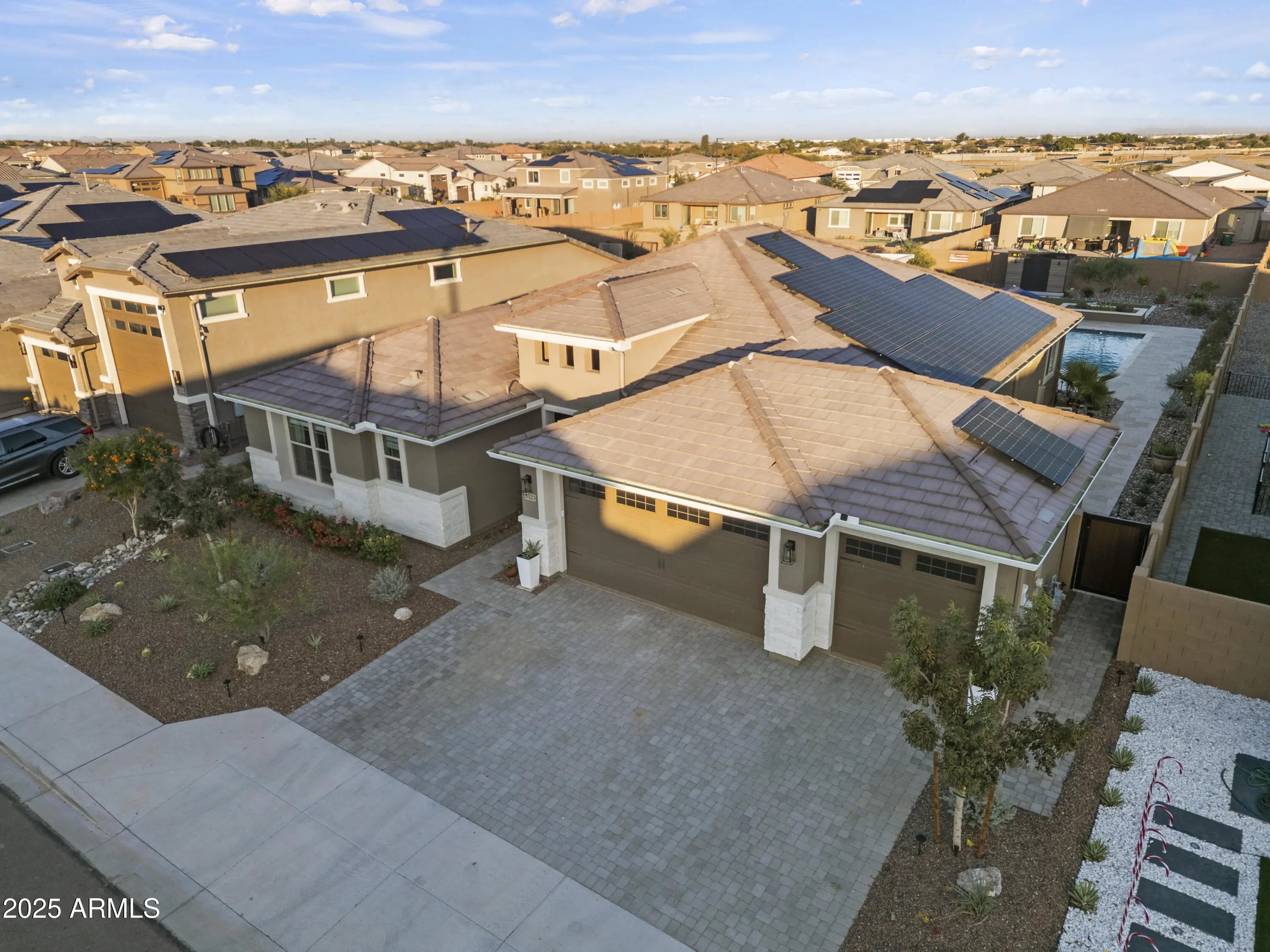 Welcome to this stunning, immaculately designed and maintained, craftsman-style single story home. Located in the desirable White Tank Foothills community in Waddell, Arizona. Built in 2023, this spacious 3-bedroom, 2.5-bath, 3 car garage home offers 2,516 sq. ft. of modern living on a generous 12,250 sq. ft. homesite. Located in a cul-de-sac, offering minimal traffic and enhanced privacy. A few steps away from the walking/biking trails. Step inside from the covered porch into the front entryway and enter a spacious open-concept floor plan. Discover a bright gathering room with windows with a beautiful backyard view, a stacked stone fireplace, and a casual social dry bar/game area. The chef's kitchen boasts stainless steel appliances, a large pantry, walk-thru coffee bar and ... ... ample counter spaceperfect for entertaining and large family dinners. The primary suite includes a luxurious tile and glass enclosed shower with a walk-in closet and linen storage shelving. Additional bedrooms and versatile Den provide flexible living options for guests, hobbies and a home office. Enjoy Arizona living at this impressive property with a stunning resort-style, east facing, backyard. Walk out through the stacked sliding glass doors and guide across the covered patio with misters that provide a relaxing mist and onto the backyard paved with Travertine. A sparkling Ozone pool with an oversized reef with bubblers, water table and a raised spa with a waterfall, welcomes you to a rejuvenating sensory experience. Entertain in your own outdoor covered BBQ Kitchen and keep the Chef cool with the built-in mister system in a conversation-friendly oasis. All including granite countertops, stainless steel sink, built-in light fixtures, ceiling fan, ice maker, a seated bar area, stainless steel storage pantry and refrigerator, gas fire pit, turf game area, desert scape plants, trees, a raised vegetable garden bed and built-in planters. The home also features energy-efficient solar, central air, and a front security screen door and side gate for peace of mind. A 3-car garage offers plenty of storage. Located near White Tank Mountain Regional Park, this property combines tranquility with convenience and luxury.
