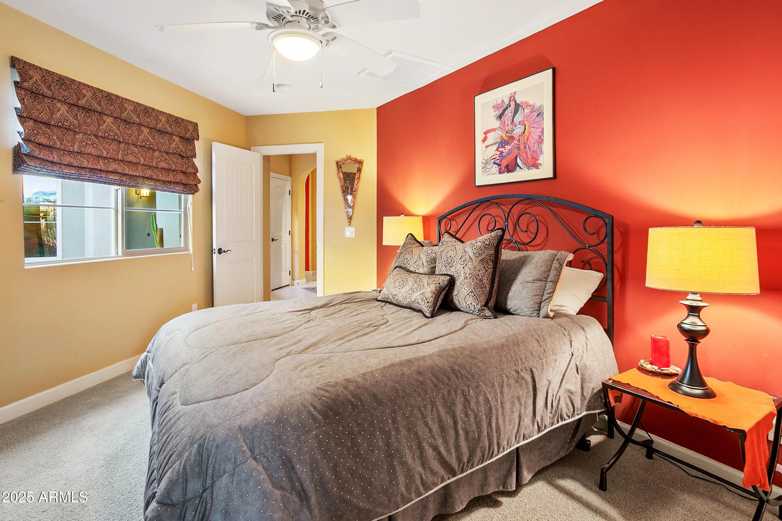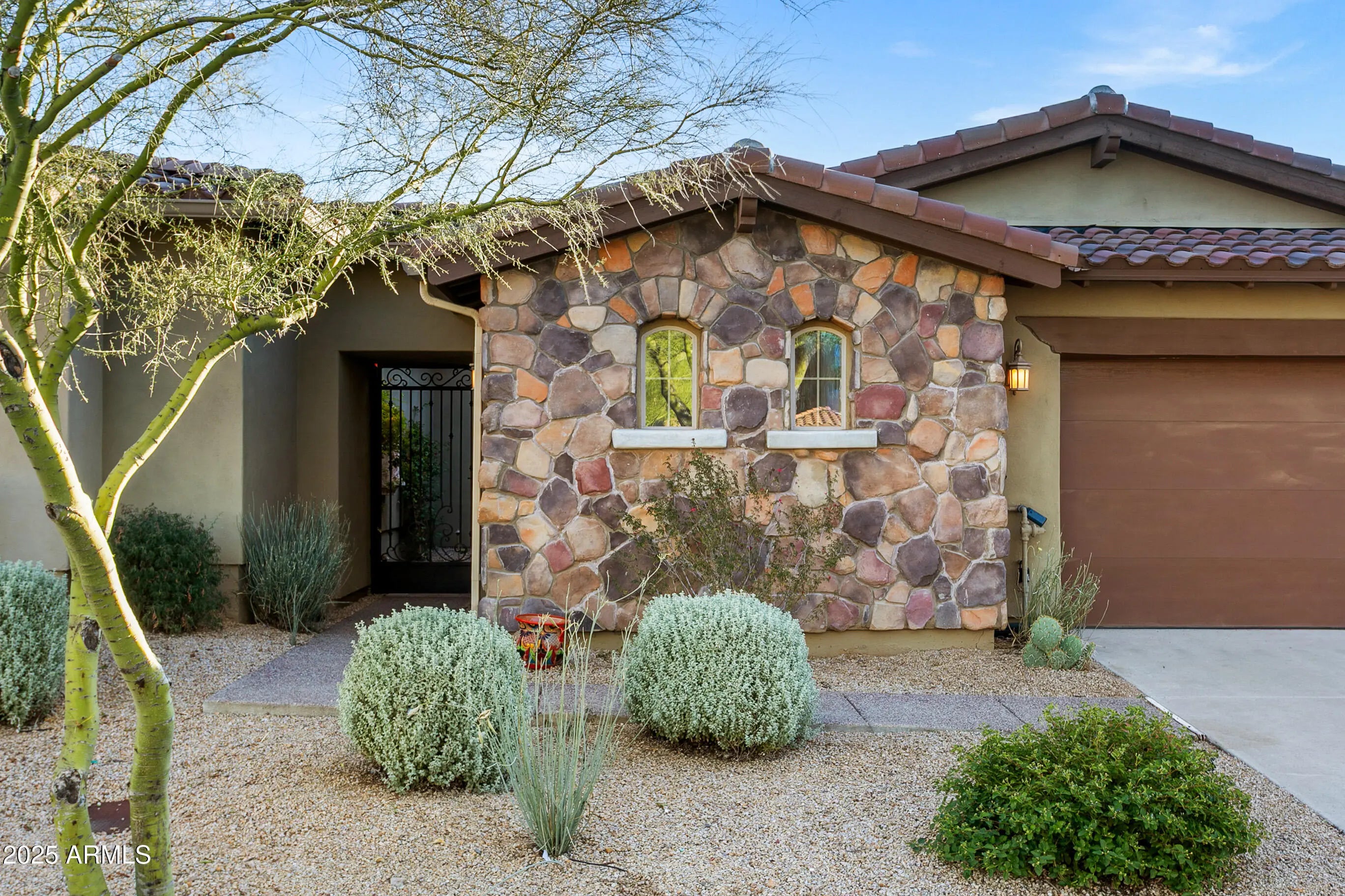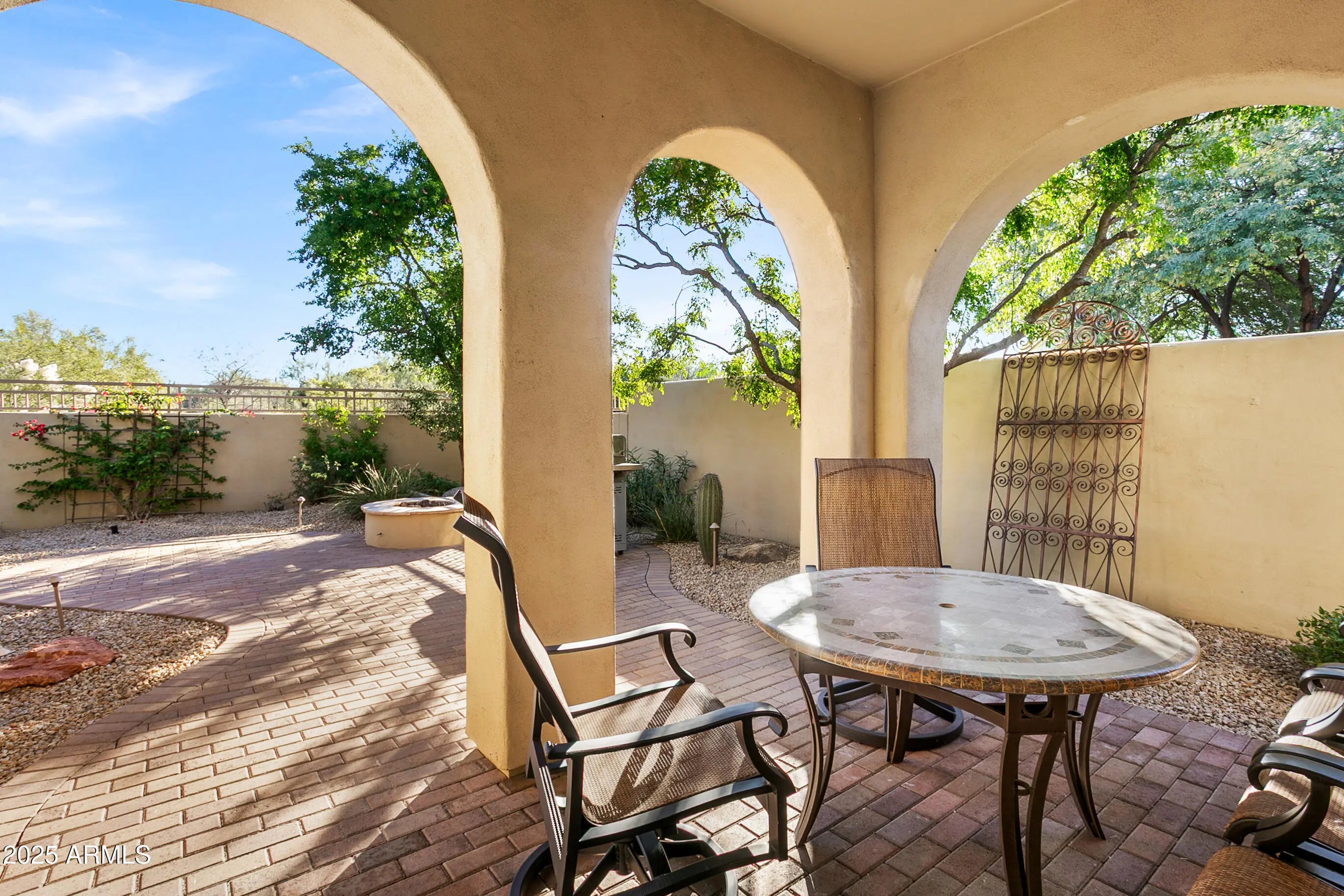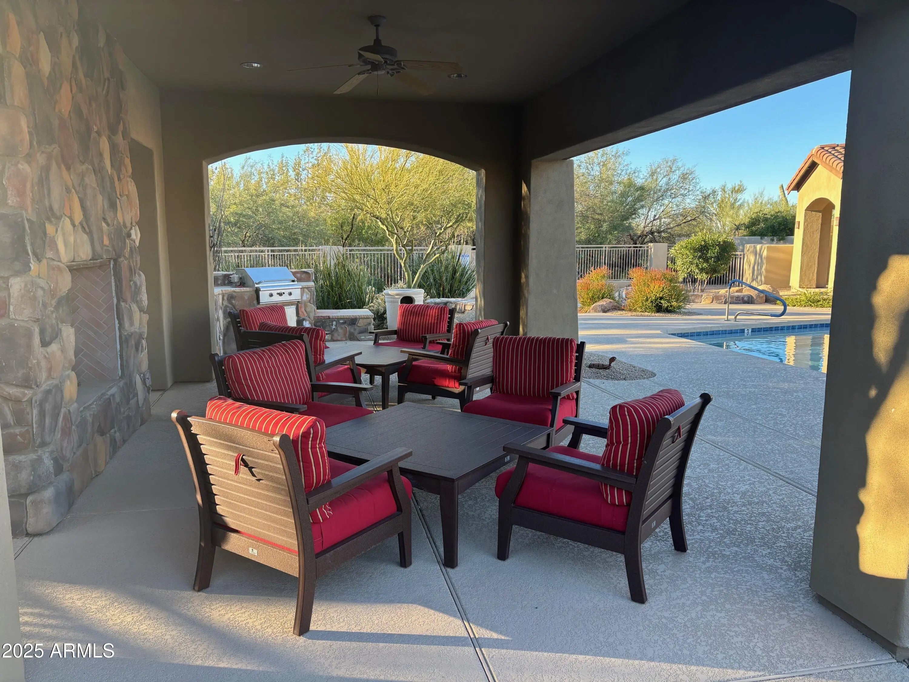 Fully furnished charming home in an incredible setting.3bd,3ba (or den) 2,246 sqft. Located at the end of the street through a gated entrance. Not only is there a patio, but a covered patio is included which is perfect for the Arizona summers. There is also a fireplace located in the backyard which is a great feature for the peaceful winters. In this gated community, there is a community pool and spa which are wonderful amenities that can be enjoyed year-round. Tenant through 4/30/2026 buyer to honor lease.