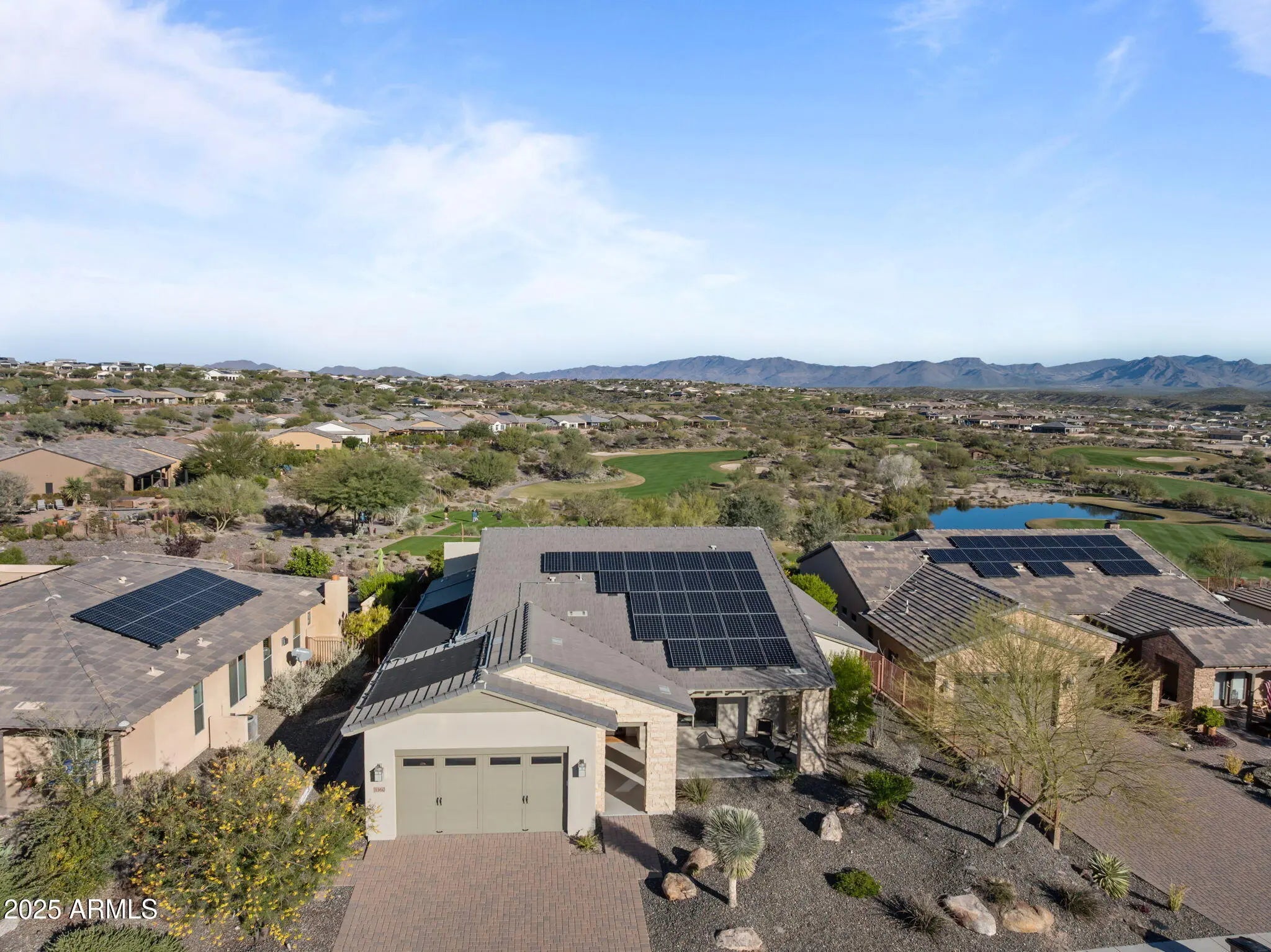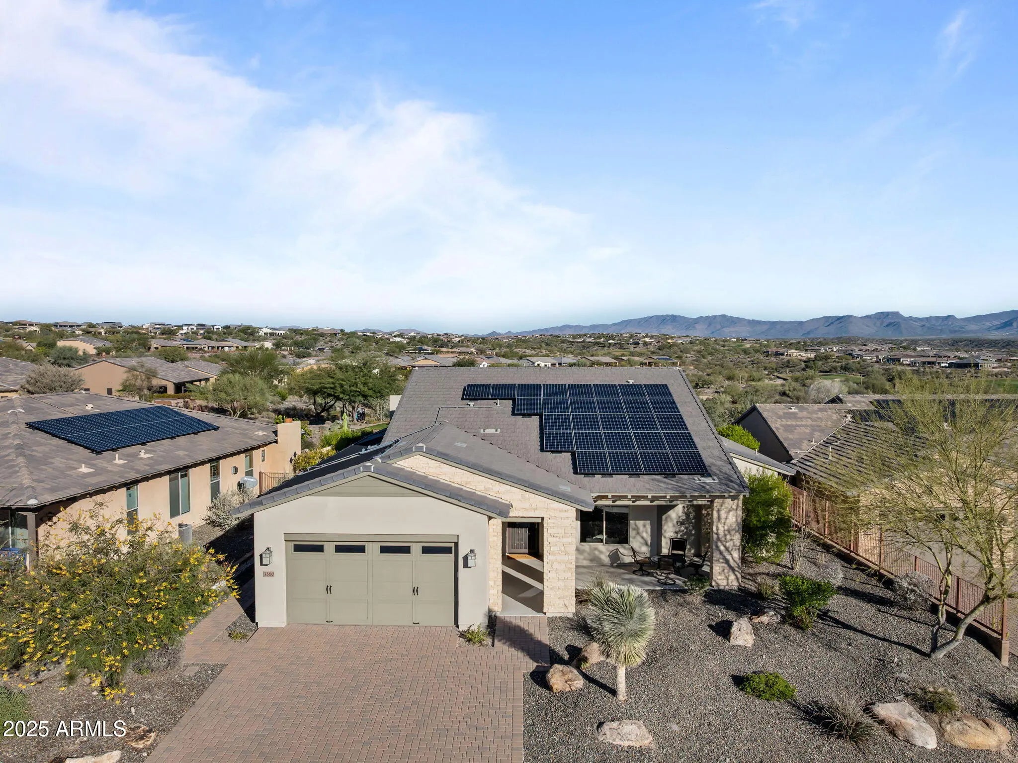 VIEWS! Pristine Brasada home sits on a premium golf course lot and has been gently used as a second residence, offering exceptional quality and breathtaking views of five golf holes from its beautifully designed pool and spa. Inside, the home is generously upgraded with a gourmet kitchen featuring stainless steel appliances, solid granite counters, a large center island with custom pendant lighting, a subway tile backsplash, upgraded white cabinetry, and a built-in wine fridge. The great room showcases an extra-large rolling wall of glass that opens to the covered patio, filling the space with natural light and capturing sweeping golf course views. The master suite includes a large sliding door to a private patio area, a barn door leading to the luxurious master bathroom, custom mirror a tiled walk-in shower, a large soaking tub, and a comfort-height toilet. The ensuite guest bedroom offers granite counters and a beautifully tiled tub and shower. Additional interior enhancements include designer lighting throughout the entry, hallway, dining room, powder room, and master bath, under- and above-cabinet lighting, surround-sound speakers in the living room, ceiling fans with lights in four rooms, Hunter Douglas top-down/bottom-up cordless cellular shades, multi-sliders in both the living and dining areas, and a motorized sunscreen off the dining room. The home has been freshly updated with exterior paint and baseboards painted in 2024, and it includes a top-of-the-line steam-clean front-load washer and dryer on pedestals. The outdoor spaces are designed for luxury desert living and showcase an extended covered patio with outdoor speakers, Edison string lights with remote control, and direct access from the master bedroom. A custom outdoor fireplace and a propane fire-pit wall set the tone for evenings overlooking the fairways. The beautifully finished yard features travertine tile, landscape lighting in both the front and rear yards, and a sparkling pool and hot tub with upgraded equipment. The owned solar pool heating system, paired with additional propane pool heat, ensures a long swimming season. The property also includes valuable behind-the-scenes upgrades that enhance comfort and efficiency, such as an owned solar electric system, a Culligan reverse osmosis drinking system, a full water softener, and a screen security door at the entry. Convenience and security features add even more appeal, including a Ring camera doorbell, an oversized three-car garage, a keyless garage entry pad, and a gently lived-in condition throughout. Altogether, this spectacular Brasada residence blends luxury indoor finishes, premier outdoor amenities, and thoughtful mechanical upgrades, creating one of the finest golf course properties available.