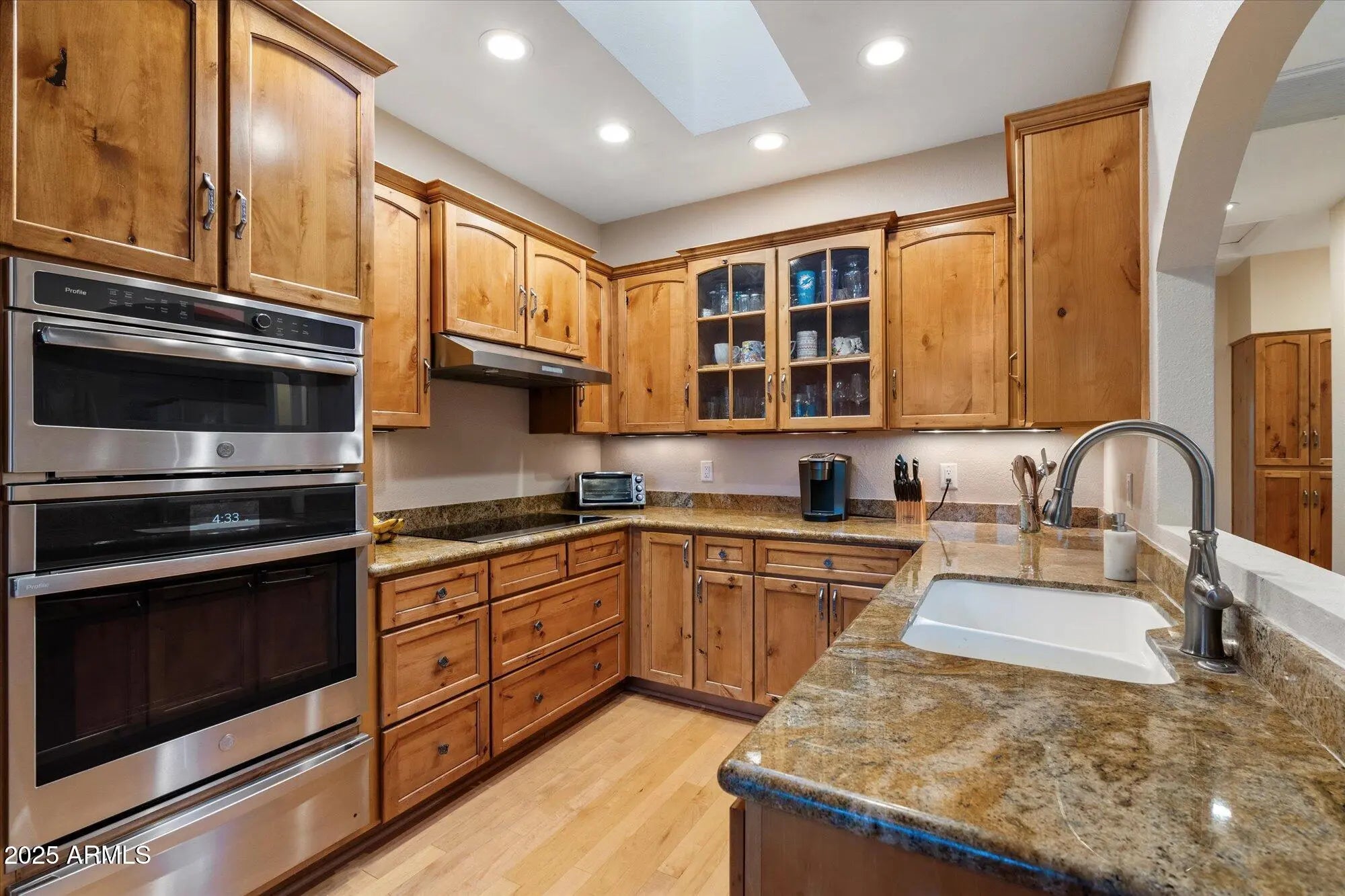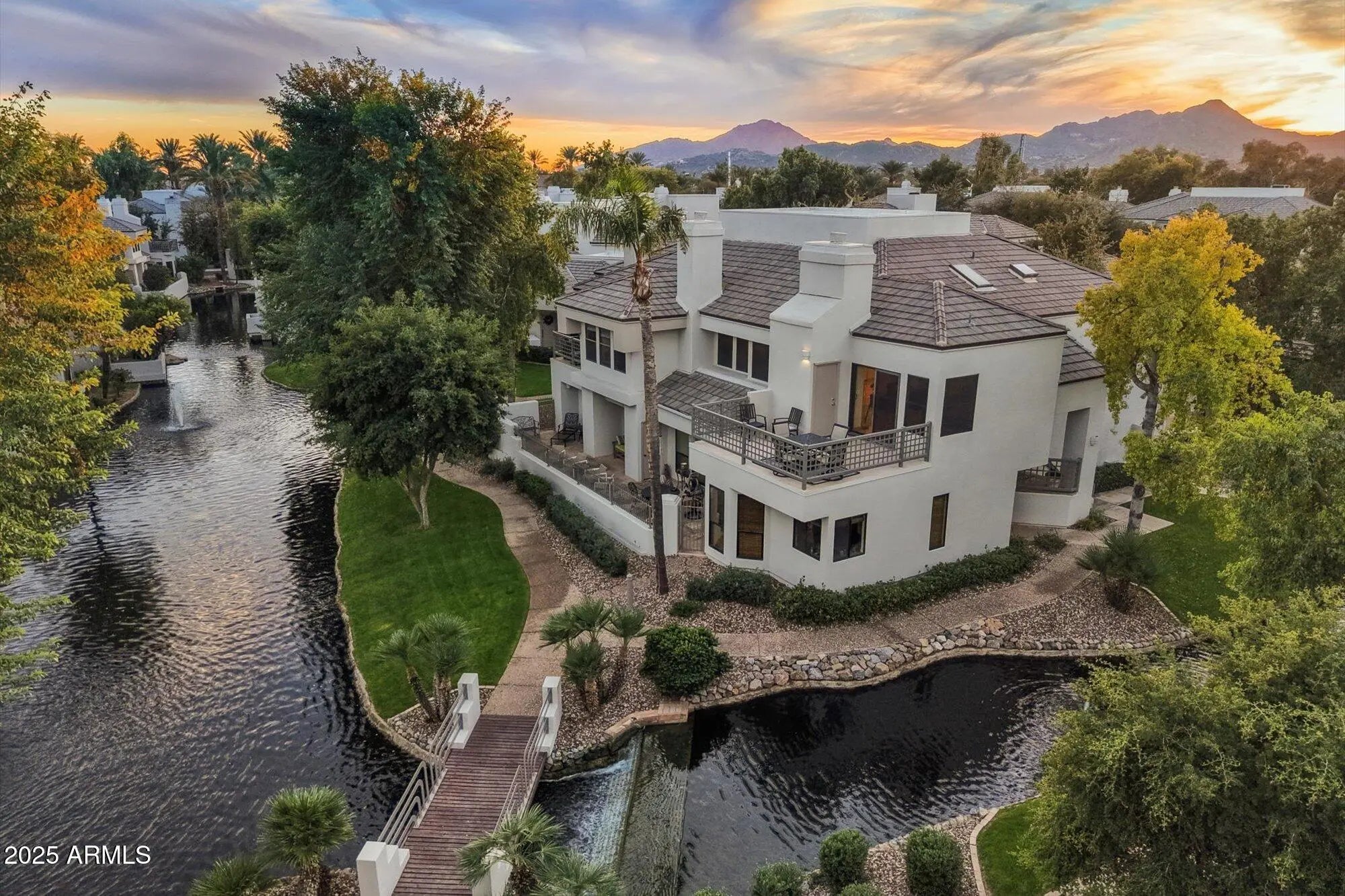 This beautiful corner unit captures the best of Gainey Ranch living. The open-concept design features new hardwood flooring throughout, a welcoming living & dining area with an electric fireplace, and access to an oversized balcony overlooking tranquil lagoon views and the waterfall bridge - the perfect spot to enjoy morning coffee nearby the golf course. The kitchen offers alder cabinetry, granite countertops, and GE Profile appliances, including a washer & dryer. A charming upper-level nook with a built-in desk provides perfect work-from-home space. The guest bath features a skylight and granite tub surround, while the guest bedroom includes a custom Murphy bed for flexibility. The primary suite offers water views, a spacious walk-in closet with built-ins, and additional storage space. Additional highlights include a newer Trane HVAC system, 2023 water heater, and an attached two-car garage with epoxy flooring and cabinetry. Gainey Ranch residents enjoy resort-style amenities including a clubhouse, fitness center, Olympic-sized pool, tennis courts, and 24-hour guard-gated security - all in one of Scottsdale's most desirable locations, close to dining, shopping, and golf.