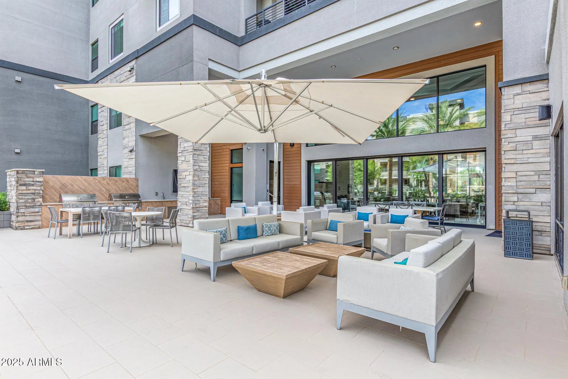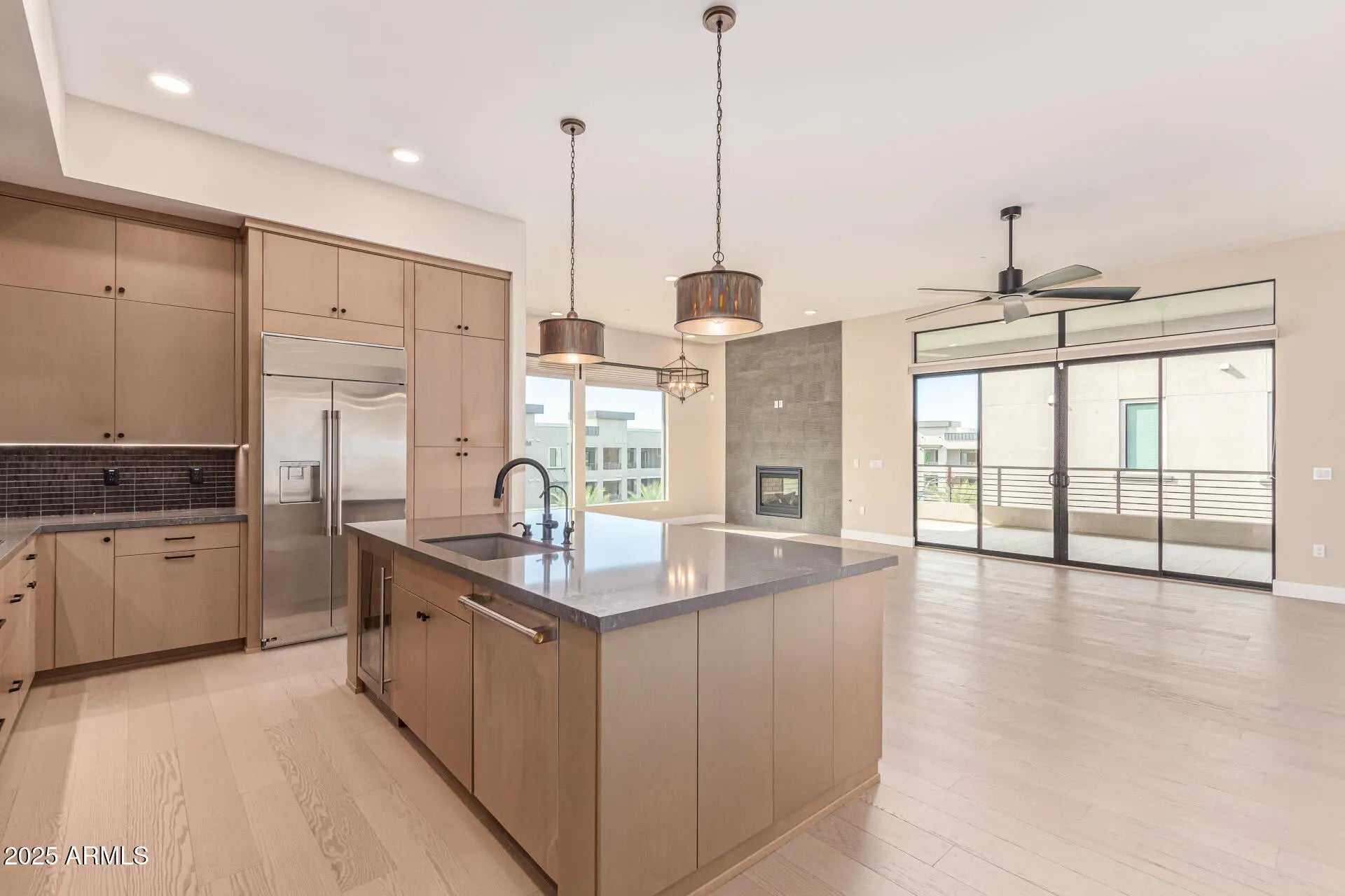 Experience unparalleled sophistication in the heart of Desert Ridge with this single-level, modern penthouse condominium at The Luxe. This spectacular 2-bedroom plus Den, 2.5-bathroom residence is distinguished by over $165,000 in custom designer upgrades, creating a truly lavish living environment. Premium interior features include: Gourmet Kitchen: Culinary excellence defined by GE Monogram appliances, including a dual-flame stacked 5-burner cooktop, quartz sink & countertops, an oversized island, custom Maple cabinetry, and an integrated wine fridge. Architectural Detail: Stunning Oak wood floors flow through the main living areas, complemented by a one-of-a-kind twilight indoor/outdoor fireplace. Luxury Suites: Both bedrooms feature large, custom-designed walk-in closets for optimal storage. The Primary Bath offers a unique Kohler freestanding tub and a walk-in shower, a signature upgrade to the Valentino floor plan. Finished with Toto toilets and matte black hardware. The immense outdoor patio is an entertainer's dream, featuring a built-in Coyote grill with ventilation hood and herringbone-tiled backsplash, see-through fireplace w/ stone surround, and premium outdoor entertainment system with TV & soundbar. Condo includes two secured parking spaces and a large storage unit. Enjoy The Luxe's unparalleled resort-style amenities, including 12,767 sq. ft. Community Clubhouse, Olympic-Sized Pool, 4,000 sq. ft. State-of-the-Art Fitness Center, Infrared Sauna and Garden Inspired Outdoor Spaces. A lock-and-leave lifestyle offering the highest level of contemporary luxury in Desert Ridge.