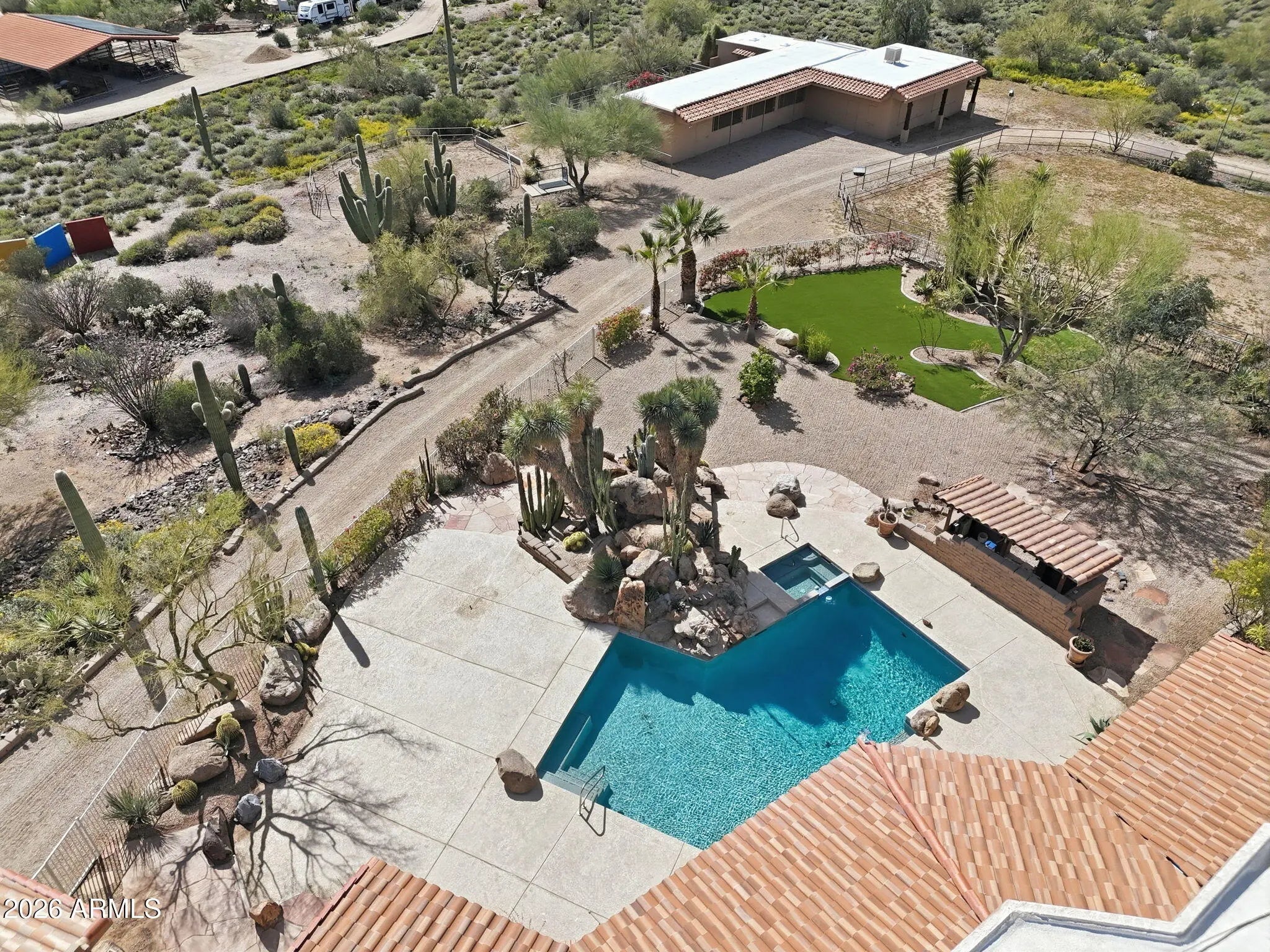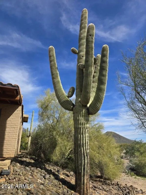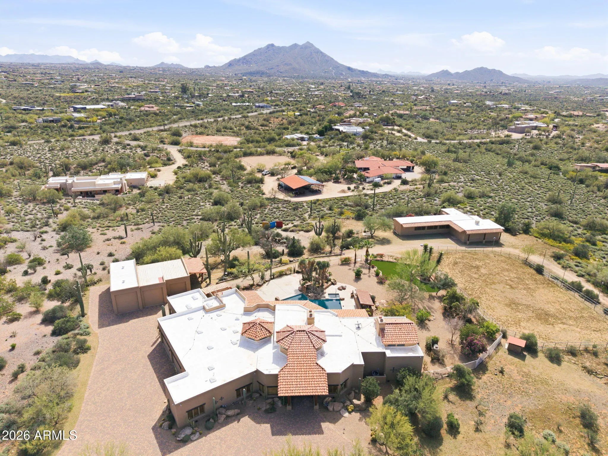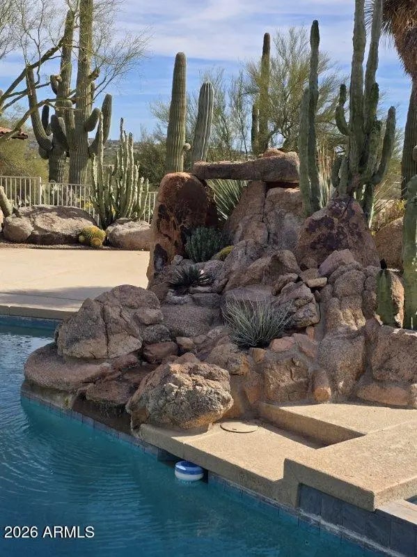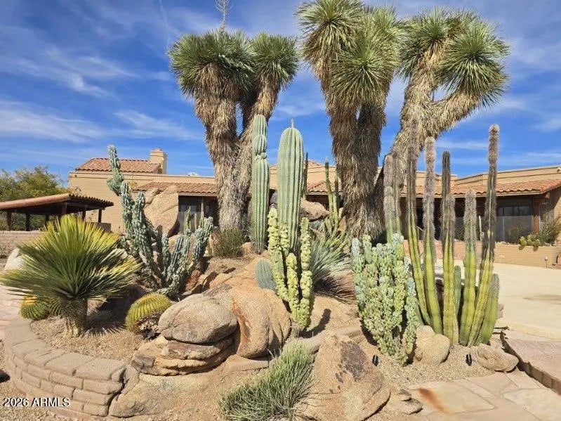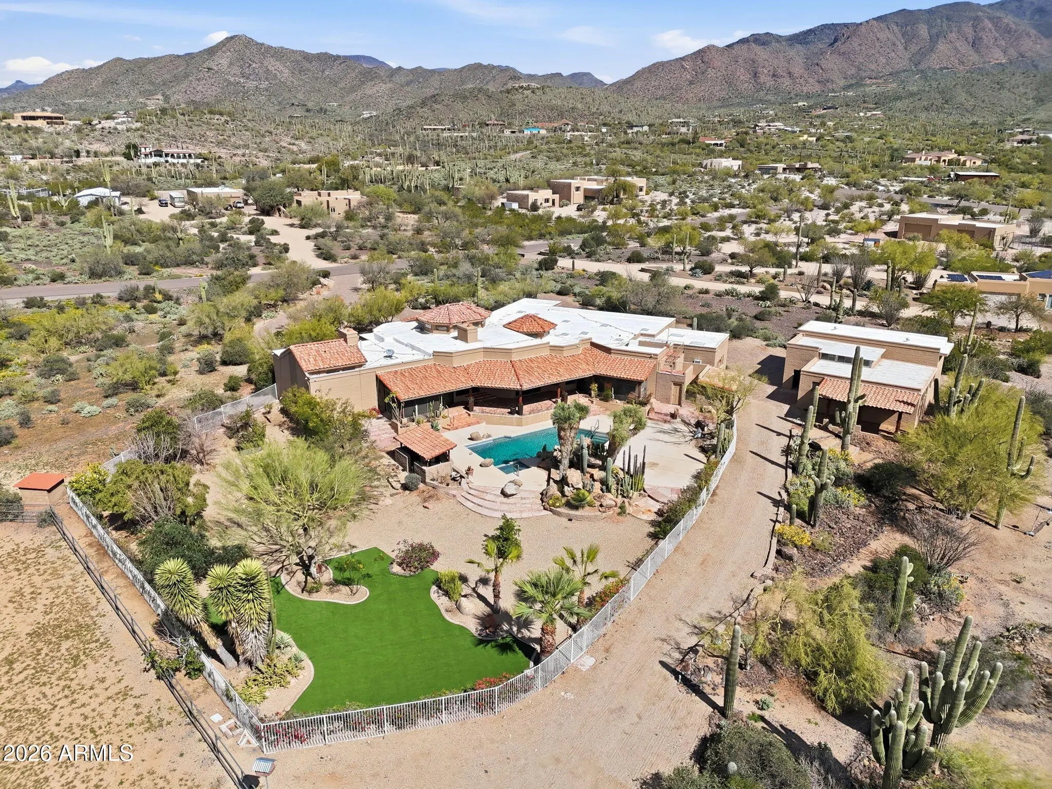 Desirable north Cave Creek estate property on 4.45 acres has epic VIEWS of Black Mountain and Tonto National Forest on one of the best lots in Willow Springs Estates. Mature lush landscaping w/ south facing backyard provides privacy & tranquility. Enter the property on 5000SF of paved driveway w/circular drive and garage parking for 7 cars plus 770SF RV garage w/septic hook up and 1000SF shop w/power. Home has 4912 sf w/ 1500 sf south facing covered patio to enjoy pool, boulders, citrus and verdant landscaping w/ multiple stately saguaros. Horse set-up w/ 3-stall block barn, 70'x120' Arena, Round Pen & wash rack. Separate 1300SF Bunkhouse w/ bath & kitchenette. Embrace the original custom Spanish design or remodel to your own current taste but this location will never go out of style! Property has its own private well that generated 20 gpm in 2014 when it was installed. Backyard has multiple citrus trees (kumquat, lemon, pomelo) Hong Kong orchid trees, variety of cactus and succulents, artificial turf, boulder waterfall, pool bath, steps to upper deck area. So many mature saguaros on the property!