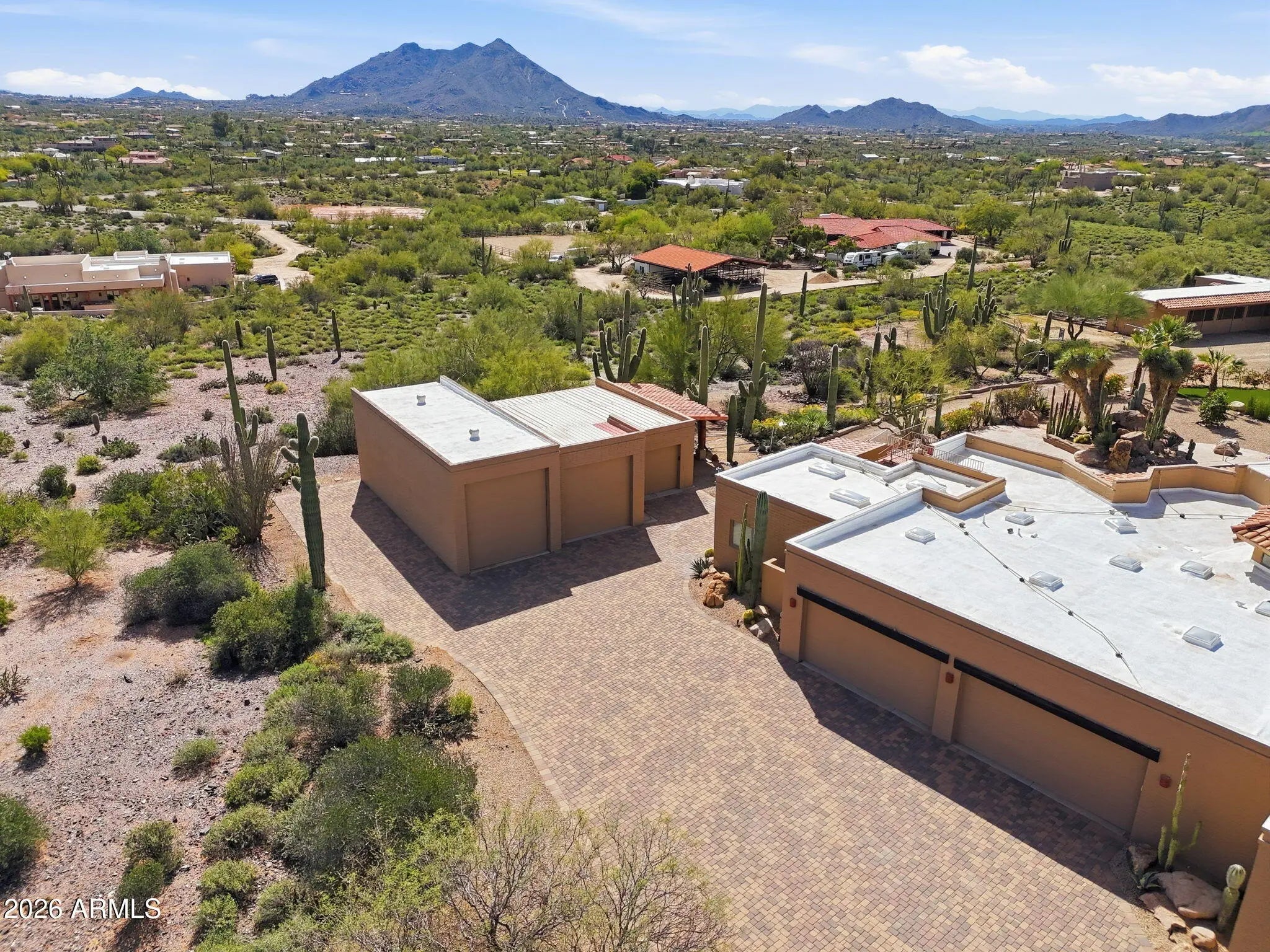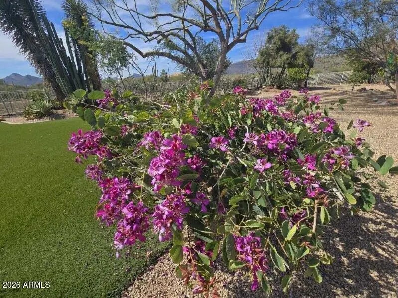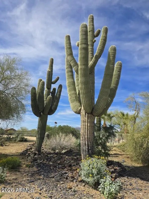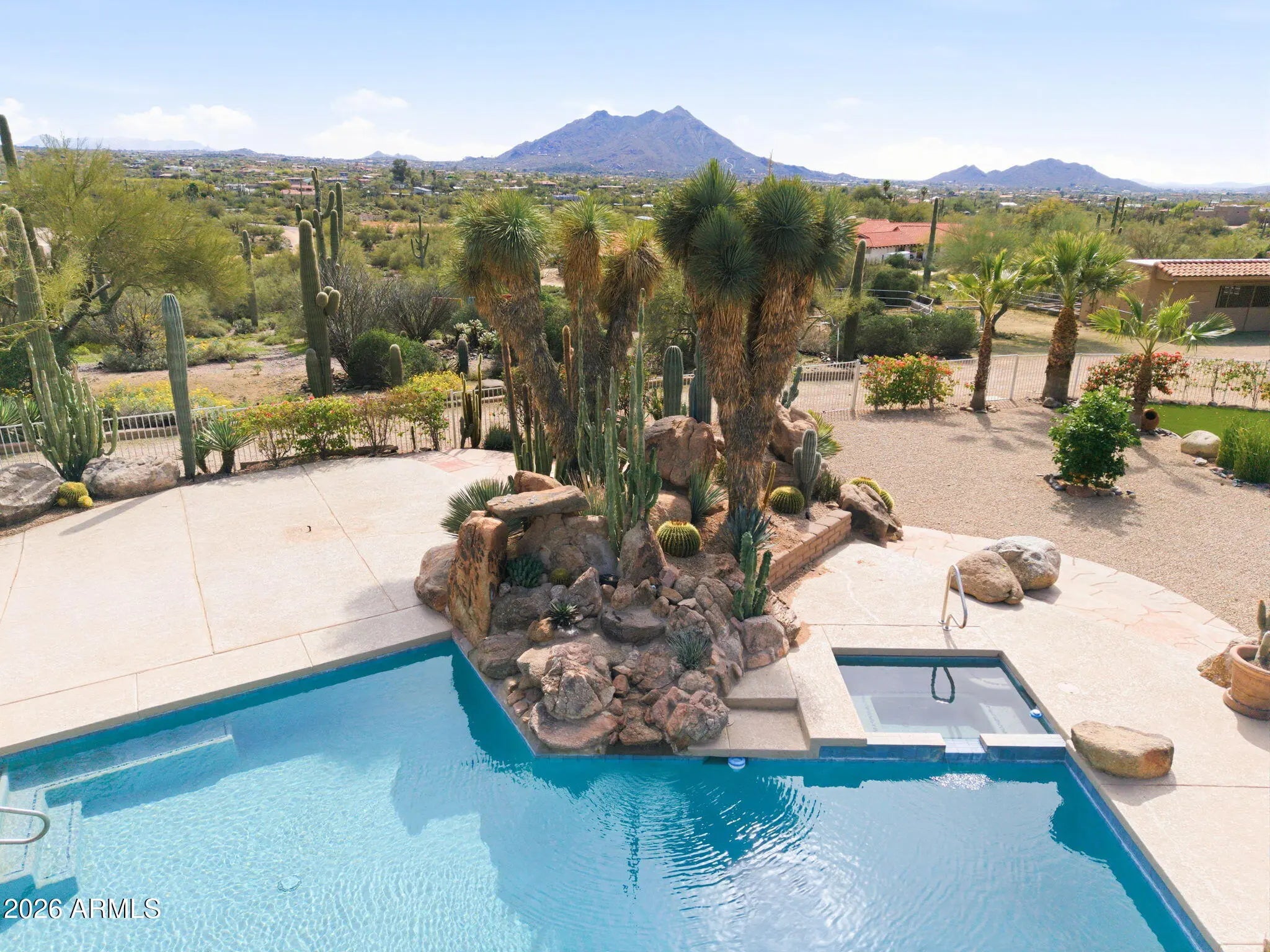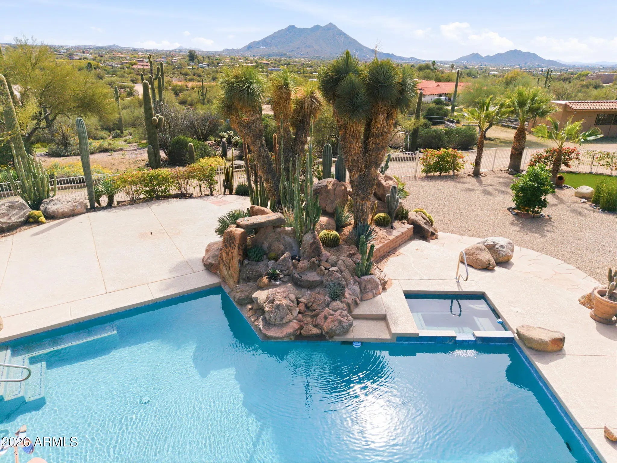 Desirable north Cave Creek estate property on 4.45 acres has epic VIEWS of Black Mountain and Tonto National Forest on one of the best lots in Willow Springs Estates. Mature lush landscaping w/ south facing backyard provides privacy & tranquility. Enter the property on 5000SF of paved driveway w/circular drive and garage parking for 7 cars plus 770SF RV garage w/septic hook up and 1000SF shop w/power. Home has 4912 sf w/ 1500 sf south facing covered patio to enjoy pool, boulders, citrus and verdant landscaping w/ multiple stately saguaros. Horse set-up w/ 3-stall block barn, 70'x120' Arena, Round Pen & wash rack. Separate 1300SF Bunkhouse w/ bath & kitchenette. Embrace the original custom Spanish design or remodel to your own current taste but this location will never go out of style! Property has its own private well that generated 20 gpm in 2014 when it was installed. Backyard has multiple citrus trees (kumquat, lemon, pomelo) Hong Kong orchid trees, variety of cactus and succulents, artificial turf, boulder waterfall, pool bath, steps to upper deck area. So many mature saguaros on the property!