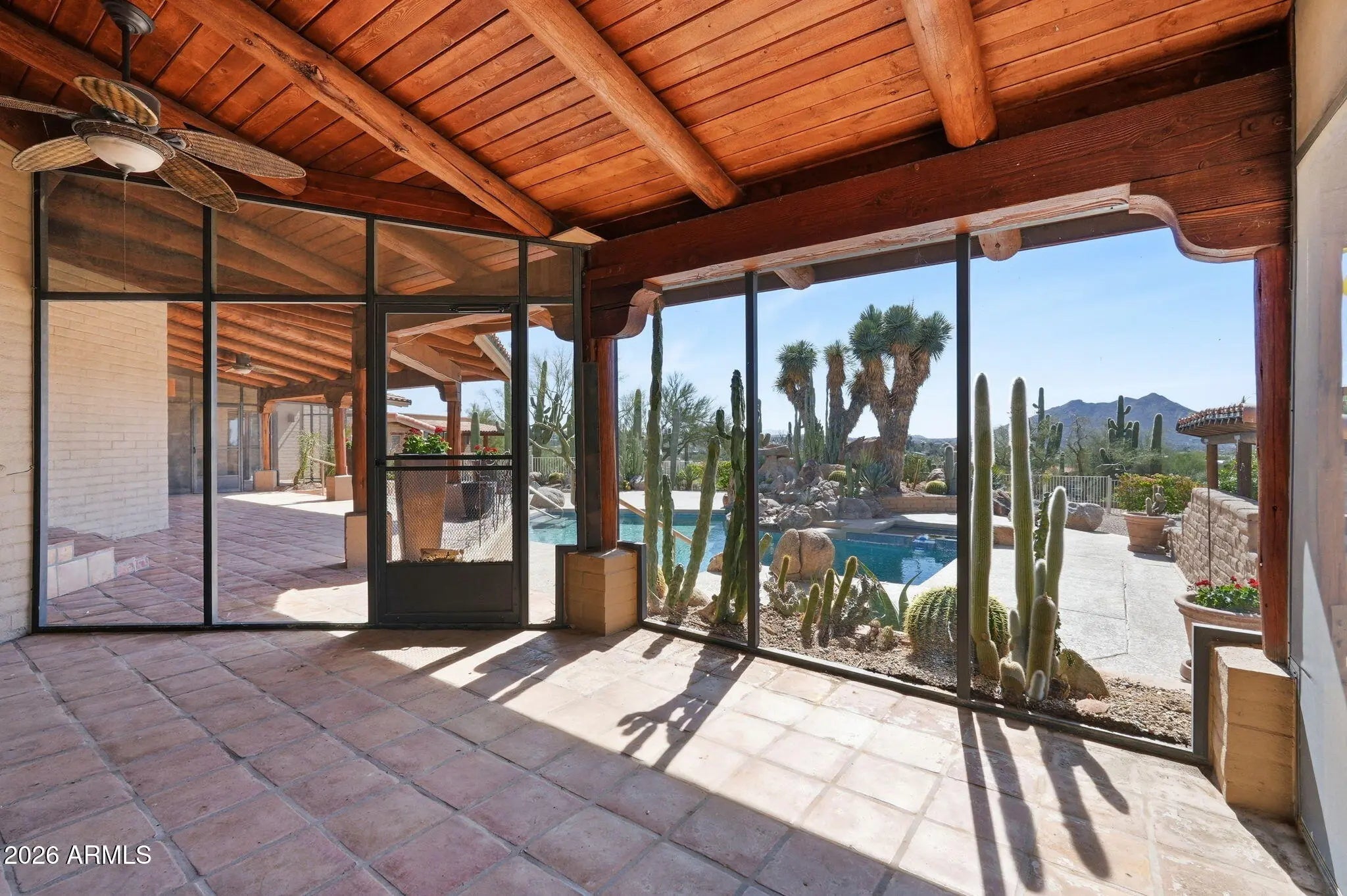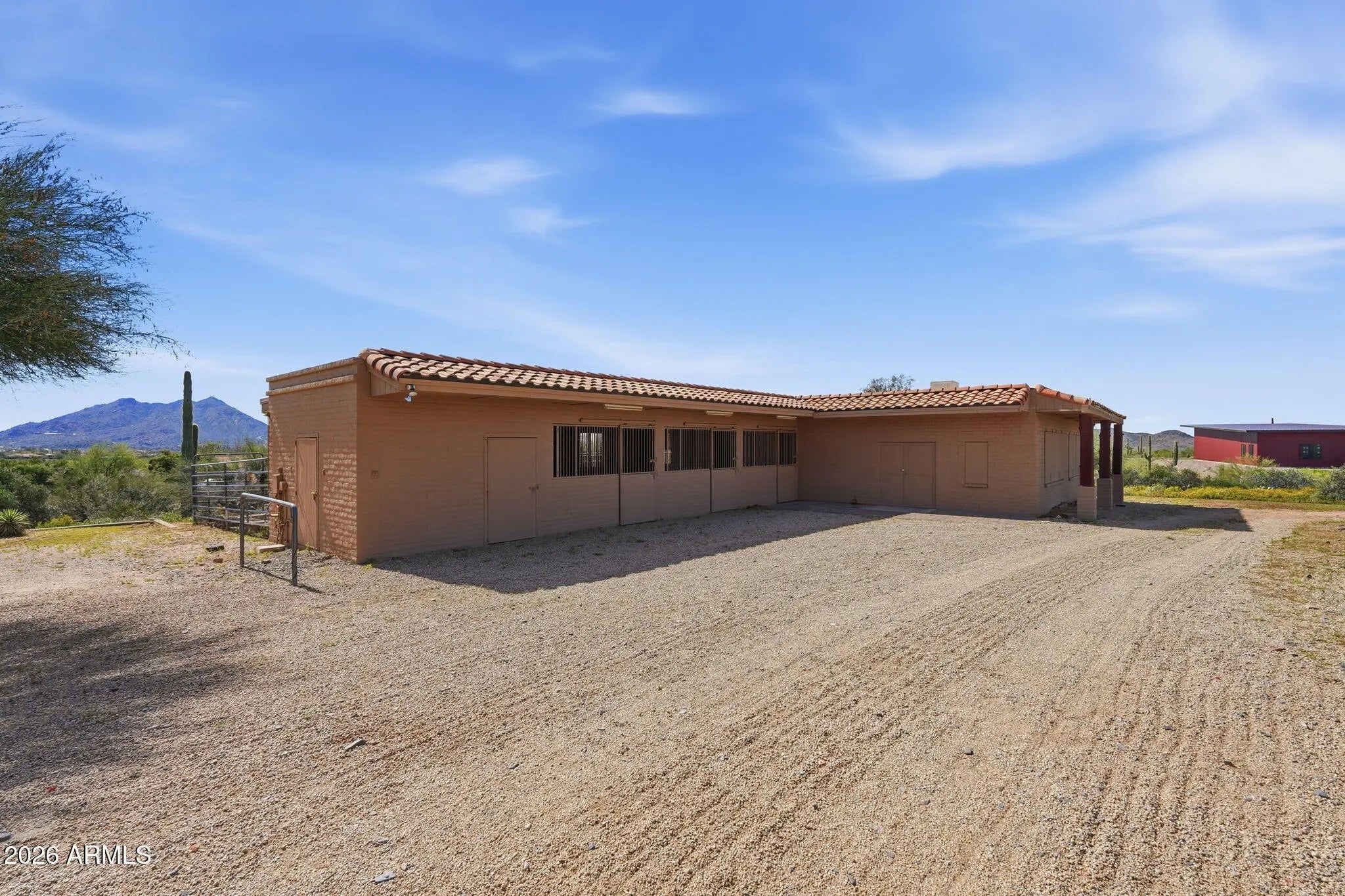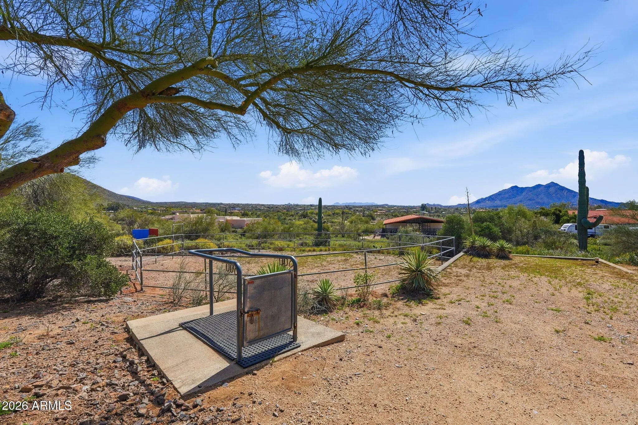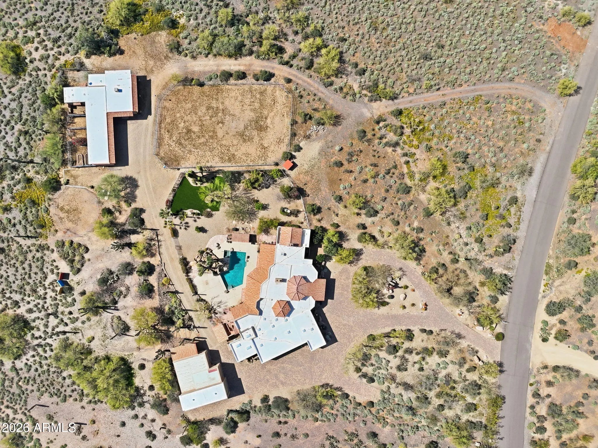 Desirable north Cave Creek estate property on 4.45 acres has epic VIEWS of Black Mountain and Tonto National Forest on one of the best lots in Willow Springs Estates. Mature lush landscaping w/ south facing backyard provides privacy & tranquility. Enter the property on 5000SF of paved driveway w/circular drive and garage parking for 7 cars plus 770SF RV garage w/septic hook up and 1000SF shop w/power. Home has 4912 sf w/ 1500 sf south facing covered patio to enjoy pool, boulders, citrus and verdant landscaping w/ multiple stately saguaros. Horse set-up w/ 3-stall block barn, 70'x120' Arena, Round Pen & wash rack. Separate 1300SF Bunkhouse w/ bath & kitchenette. Embrace the original custom Spanish design or remodel to your own current taste but this location will never go out of style! Property has its own private well that generated 20 gpm in 2014 when it was installed. Backyard has multiple citrus trees (kumquat, lemon, pomelo) Hong Kong orchid trees, variety of cactus and succulents, artificial turf, boulder waterfall, pool bath, steps to upper deck area. So many mature saguaros on the property!