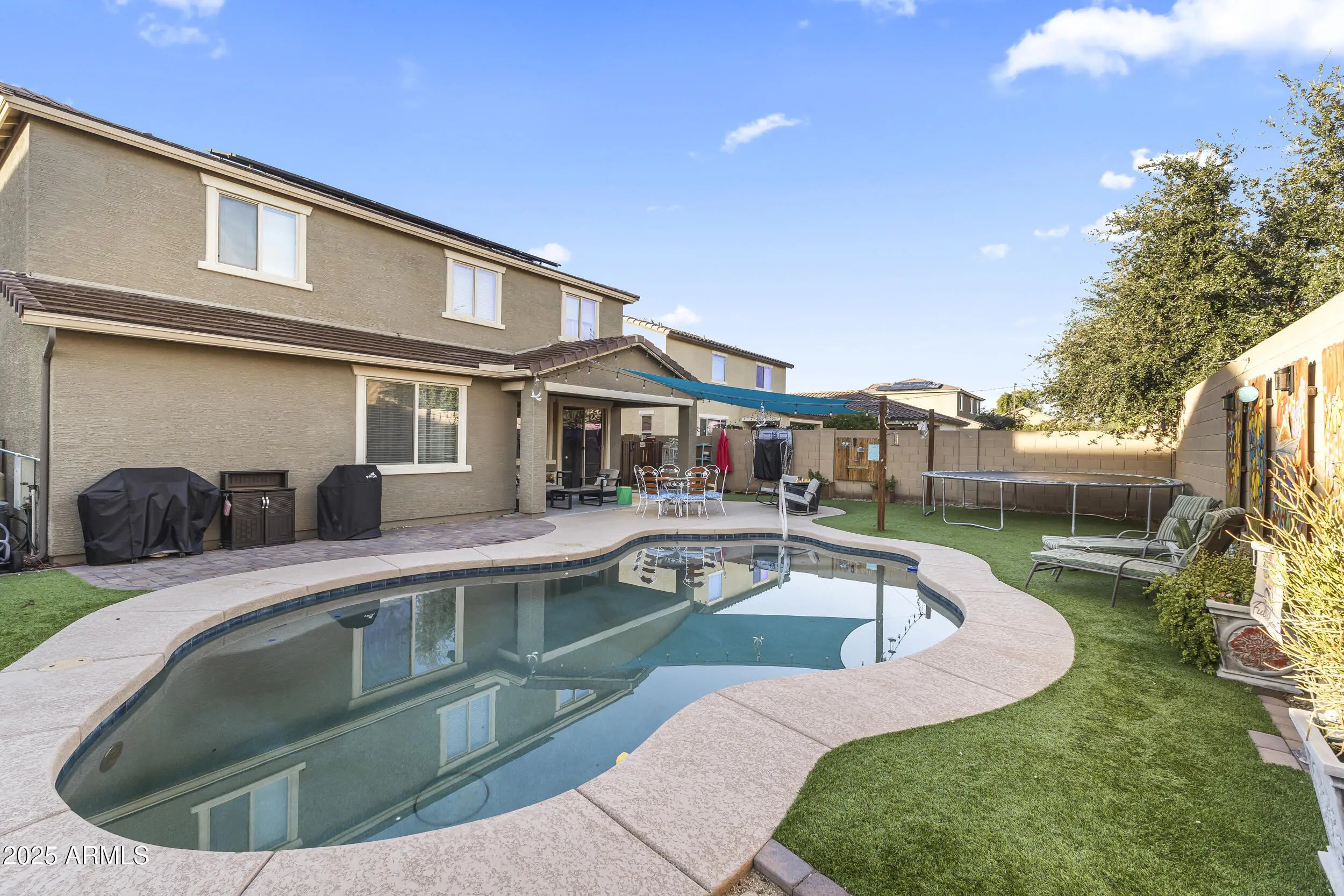 Beautifully maintained two-story home in Surprise featuring two primary suites -- one downstairs and one upstairs -- each with a private en-suite bath and walk-in closet, ideal for guests or multigenerational living. Select bathrooms include handicapped grab bars for accessibility. This home offers 4 bedrooms, 3.5 baths, a loft, and a den perfect for a home office. The open-concept kitchen features stainless steel appliances, granite countertops, a center island with breakfast bar seating, and a backsplash. Enjoy low-maintenance landscaping, an RV gate, and stone exterior accents. The backyard includes a covered patio and pool, perfect for relaxing or entertaining. Solar panels are paid off and free and clear, providing energy efficiency with no lease or loan to assume.
