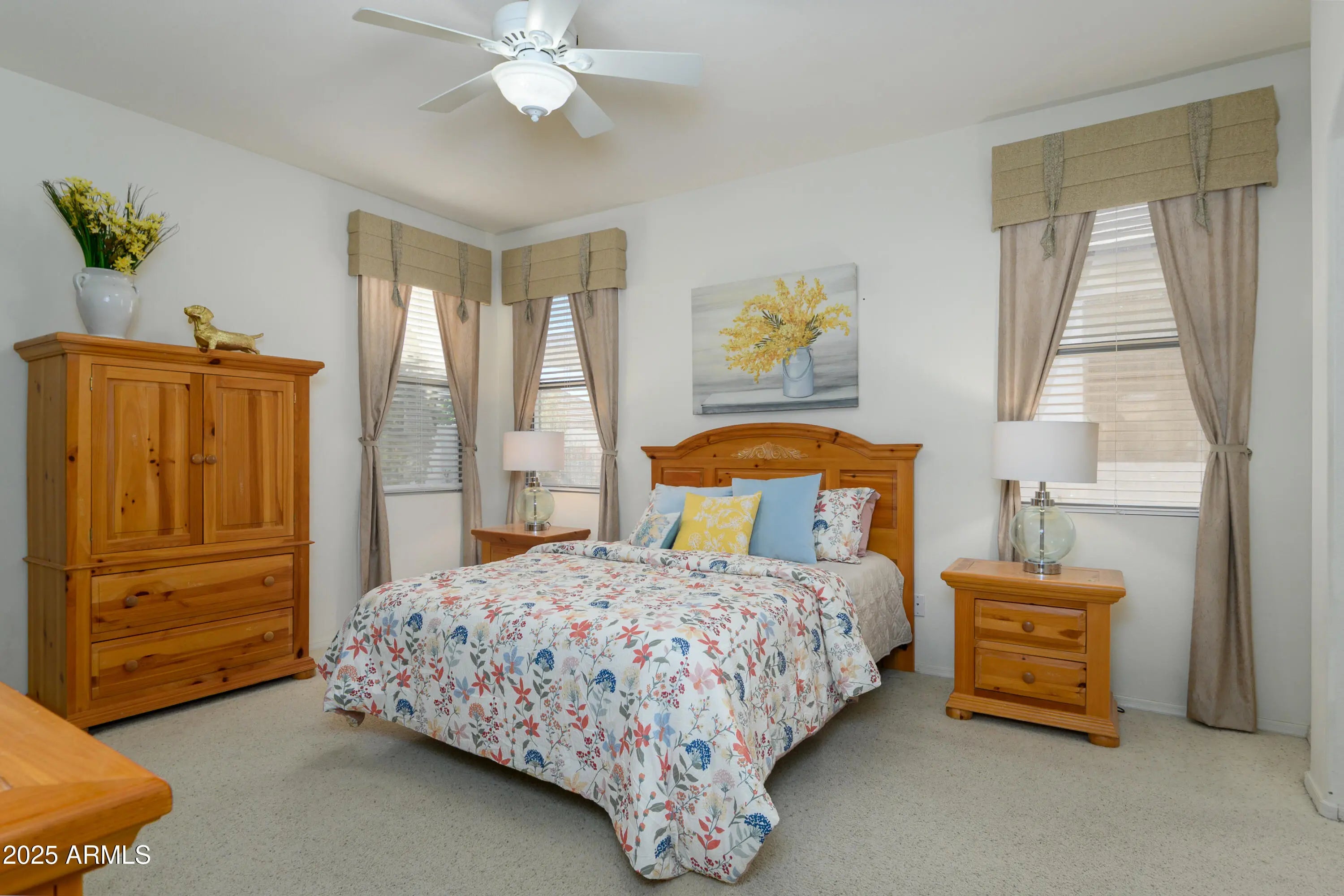 NEW ROOF, great corner lot, across the street open lot w/ view of the golf course! This home is calling for you! Darling 2 bed 2 bath floor plan w/ expanded laundry w/room for a small office or hobby area. This home is bright w/ lots of natural light & an open flow between living room & kitchen. The bedrooms are split & the guest bedroom could have alternative uses from office to craft room. The primary ensuite bedroom is spacious & has a nice size walk in closet. The backyard is fun for entertaining w/ a cute patio & privacy. It is an easy maintenance landscaping. The home is well postioned in Arizona Traditions & easy access to all the amenities. Arizona Traditions has much to offer, fitness, sports, entertainment & events, concerts, crafts, & many clubs, card/games groups.