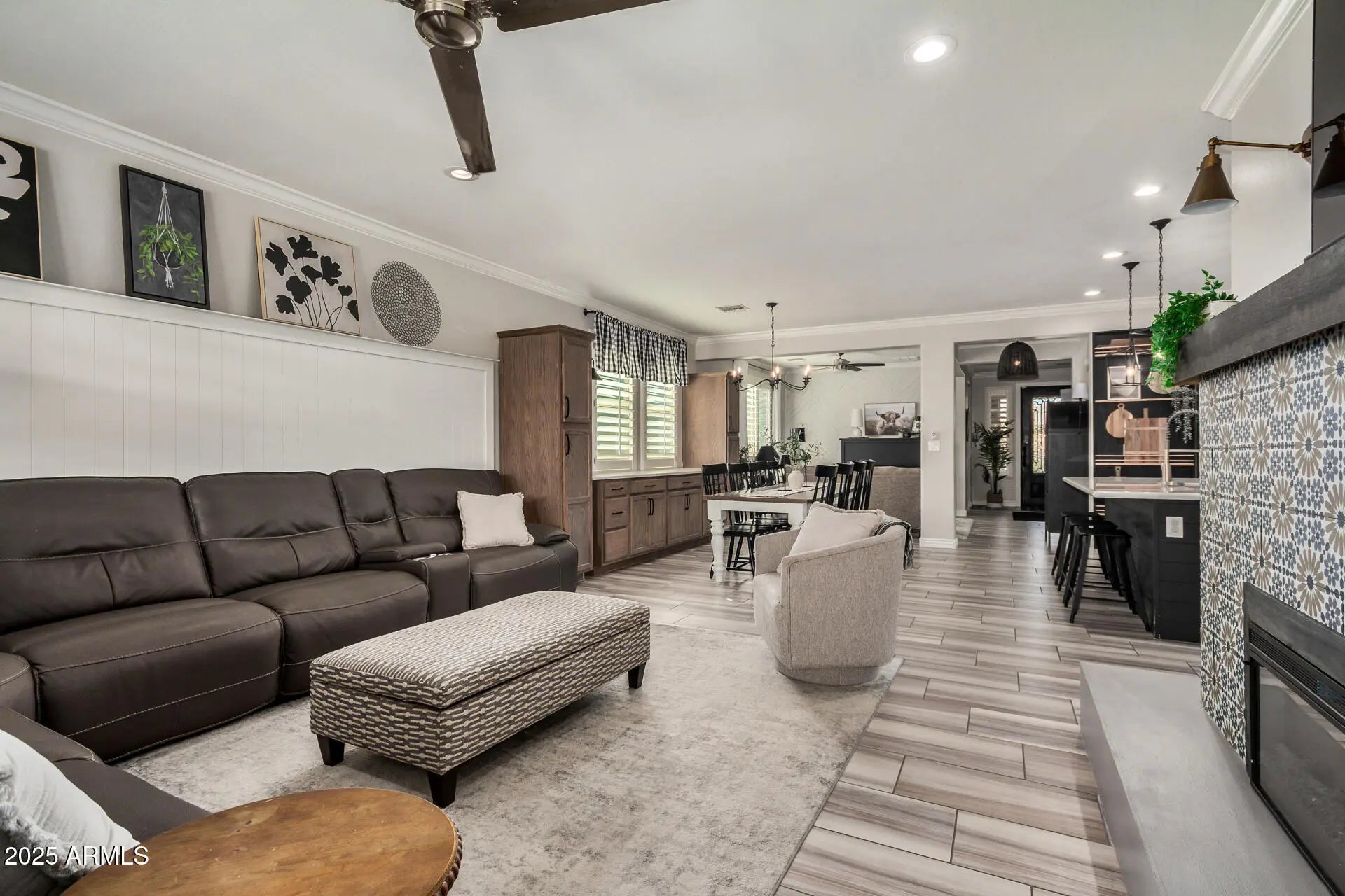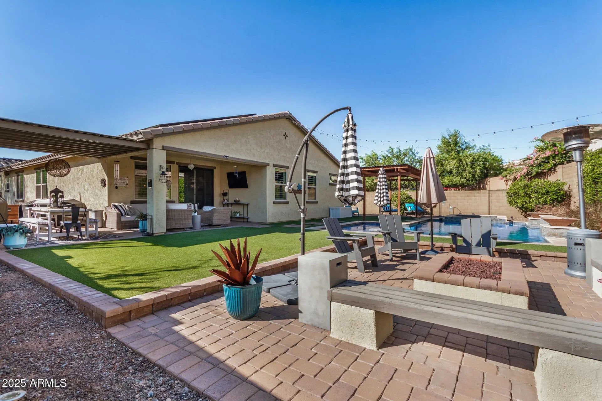 Experience elevated desert living in this exceptional home located in north Peoria's highly sought-after Tierra Del Rio North community - complete with a custom pool and spa. From its impressive stone-veneer exterior and lush mature landscaping to the RV gate and spacious two-car garage, this home offers undeniable curb appeal. Inside, over 2,100 sq.ft. of impeccably crafted and beautifully updated living space awaits, featuring four bedrooms, a flex space and three full bathrooms--designed to accommodate a variety of lifestyles with ease. A sophisticated front entry leads into a welcoming foyer, opening to a versatile den/office, dining area and a light, bright great room. Modern flooring, custom wall finishes, plantation shutters and a stunning fireplace create a refined yet... comfortable ambiance. The chef-inspired kitchen is a showpiece, boasting crisp white cabinetry, stainless steel appliances, luxurious quartz countertops, a subway-tile backsplash and an expansive island with a breakfast bar. The primary suite offers a true retreat, highlighted by a spa-like en suite bath with dual vanities featuring vessel sinks, a beautifully tiled walk-in shower and a custom-organized walk-in closet. Step outside to your resort style private oasis--complete with extended paver-covered patios, gazebo, cozy fire pit area, mountain views and a custom-designed pool/spa that elevates outdoor living to a new level. Brimming with high-end touches and upgrades throughout, this home is a rare find. Ideally situated near Loop 303, shopping, dining, schools, and recreation. This home is definitely A MUST SEE!