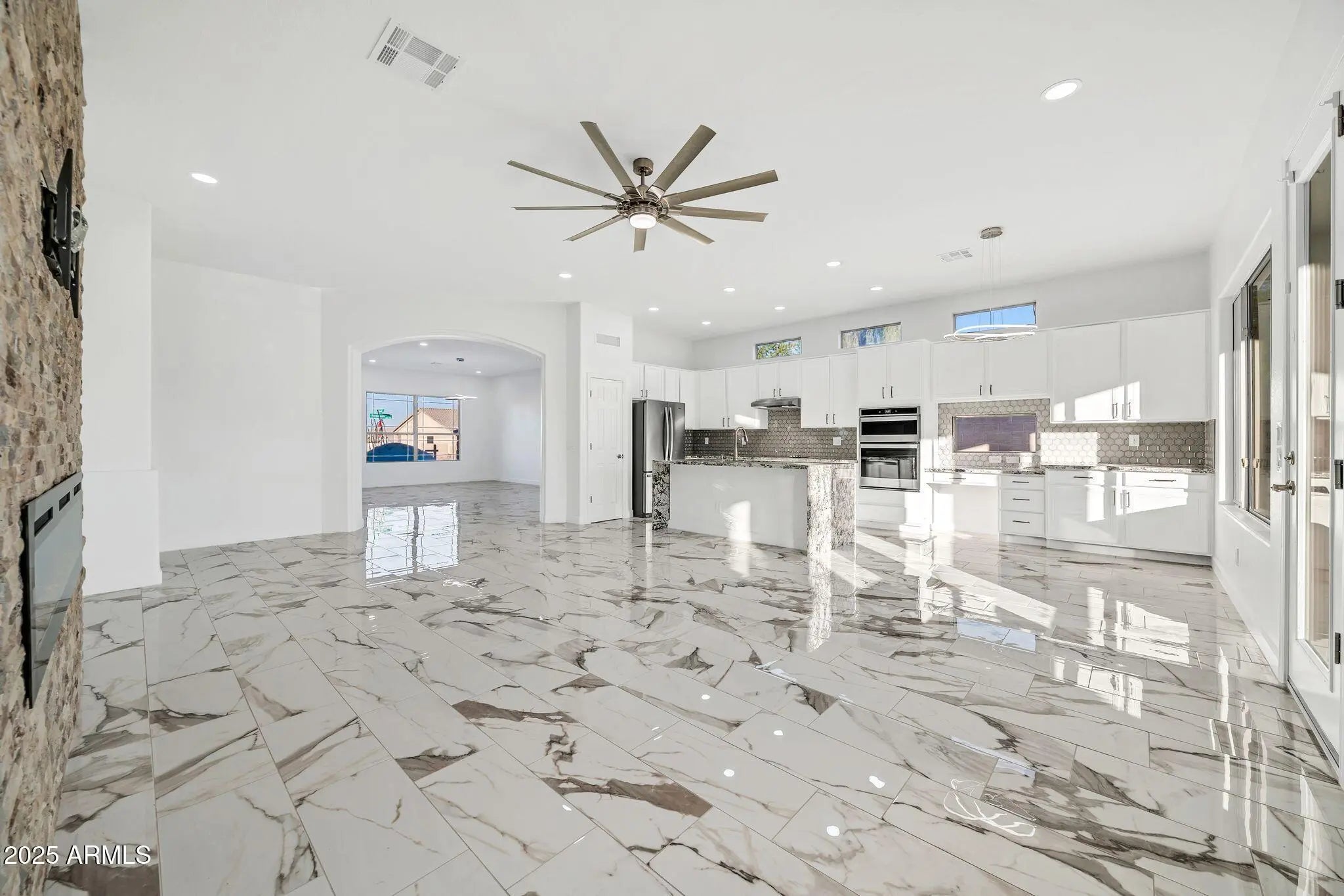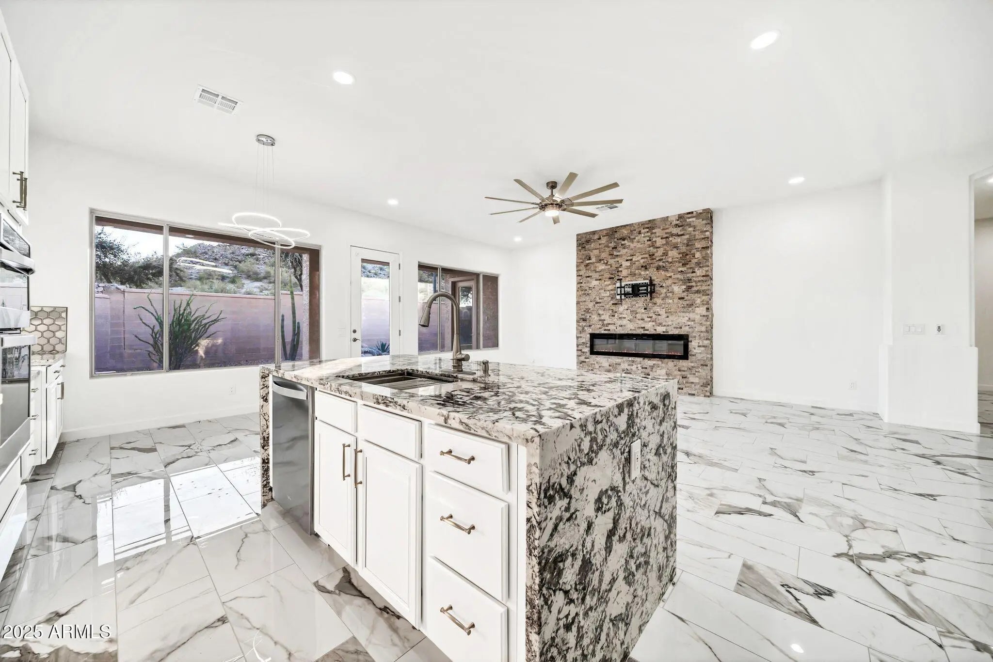 Seller is offering 2% of the purchase price towards the buyer's closing costs and prepaids. Welcome to this beautifully renovated 3-bedroom, 2-bath, 2,256-square-foot home in the heart of Estrella Mountain Ranch. This property has been upgraded from top to bottom, offering the feel of a brand new house with modern finishes throughout. As you walk in, you will notice the fresh interior and exterior paint, new flooring throughout the home, and updated lighting that gives every room a bright, clean look. The kitchen features new granite countertops and updated outlets and switches throughout. Every bathroom has been refreshed with new plumbing fixtures, new toilets, and LED anti-fog mirrors that add a touch of luxury. The primary suite includes a Bluetooth speaker system for added comfo The home also features a fully remodeled walk-in shower... New ceiling fans in every room, and LED lighting throughout. Step outside to enjoy a newly resurfaced pool deck, perfect for Arizona summers. The three garages feature brand-new epoxy flooring, giving them a clean, polished look. A new custom fireplace and wall-mounted TV stand create a modern focal point in the living space, making it perfect for entertaining or relaxing. This home has been thoughtfully upgraded throughout and is move-in ready, with nothing left to do.